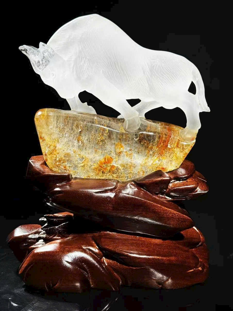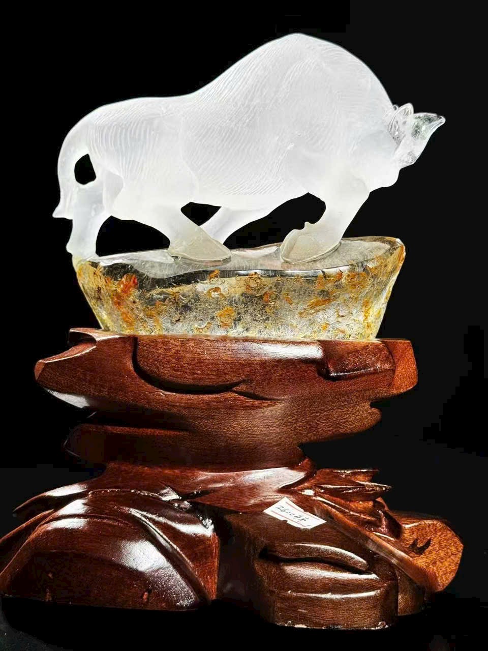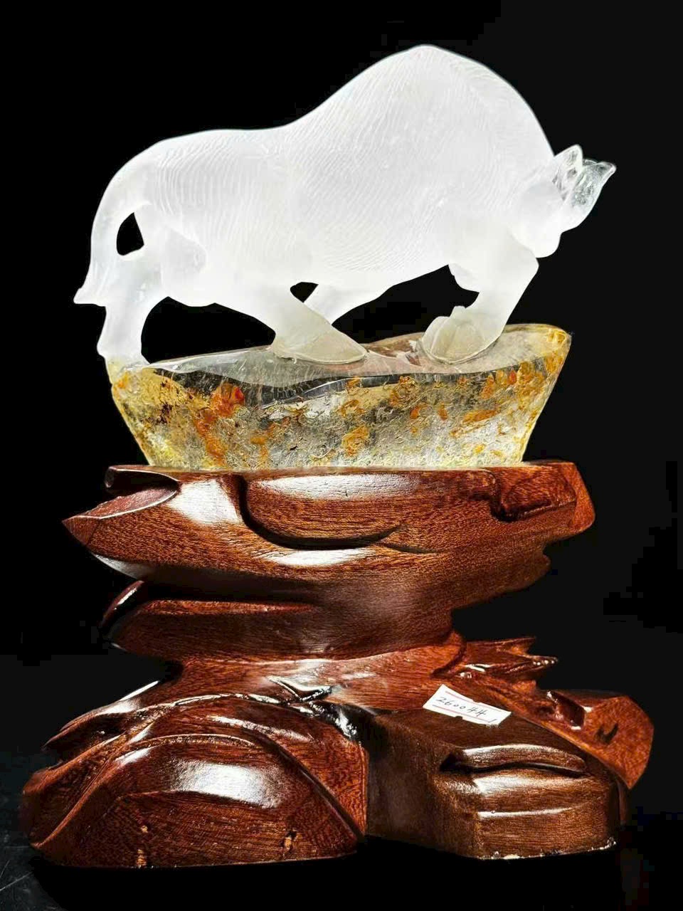 Tượng Trâu (tuổi Sửu) chế tác từ thạch anh trắng thiên nhiên vân keo vàng, dáng đẹp, thích hợp trưng bày phong thủy.