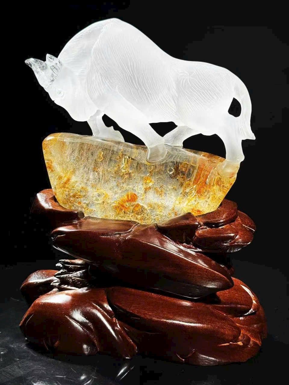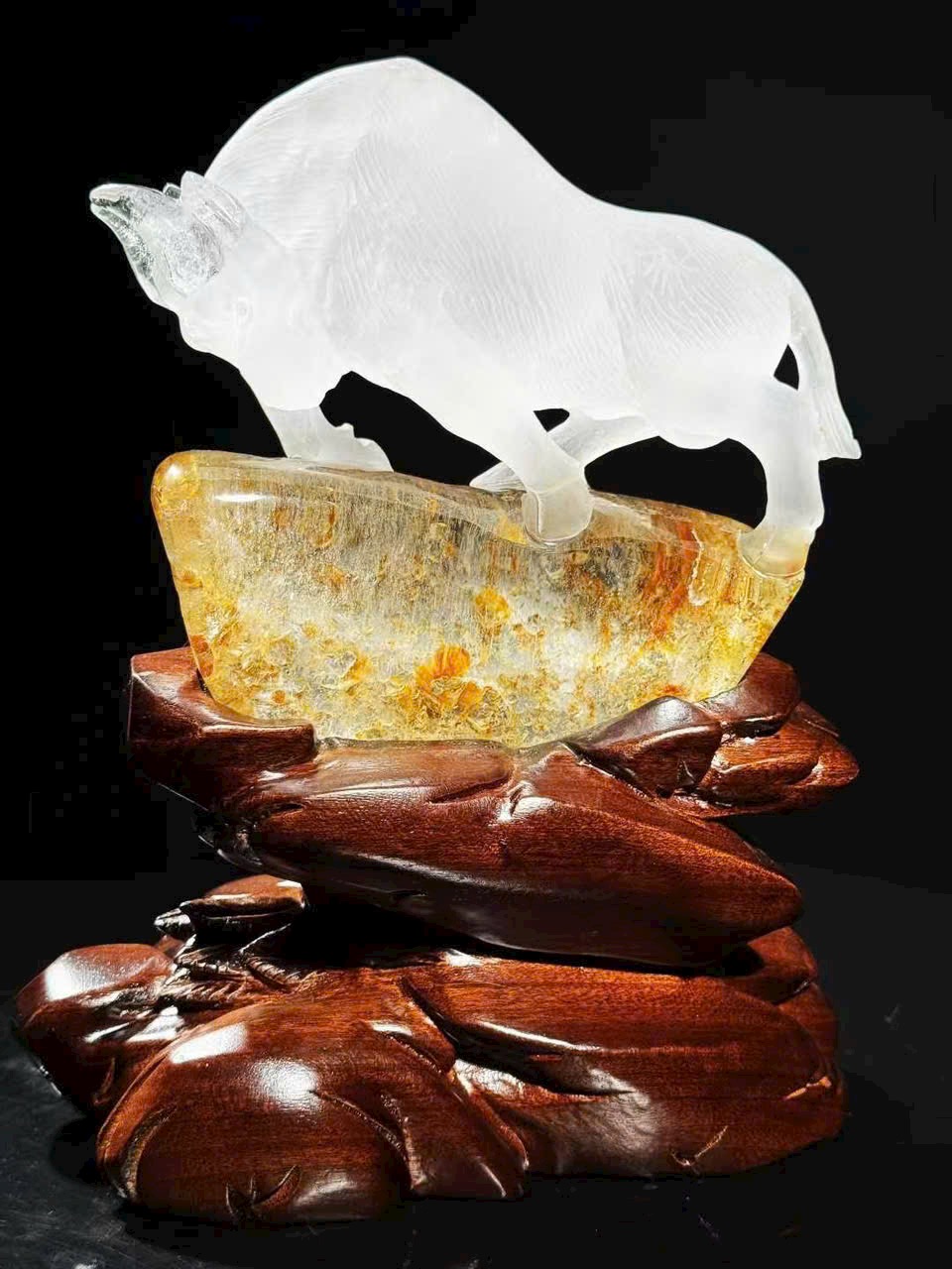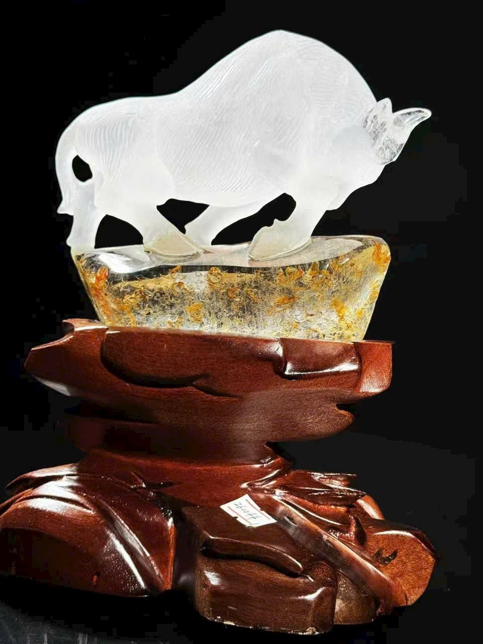 Tượng Trâu (tuổi Sửu) chế tác từ thạch anh trắng thiên nhiên vân keo vàng, dáng đẹp, thích hợp trưng bày phong thủy.