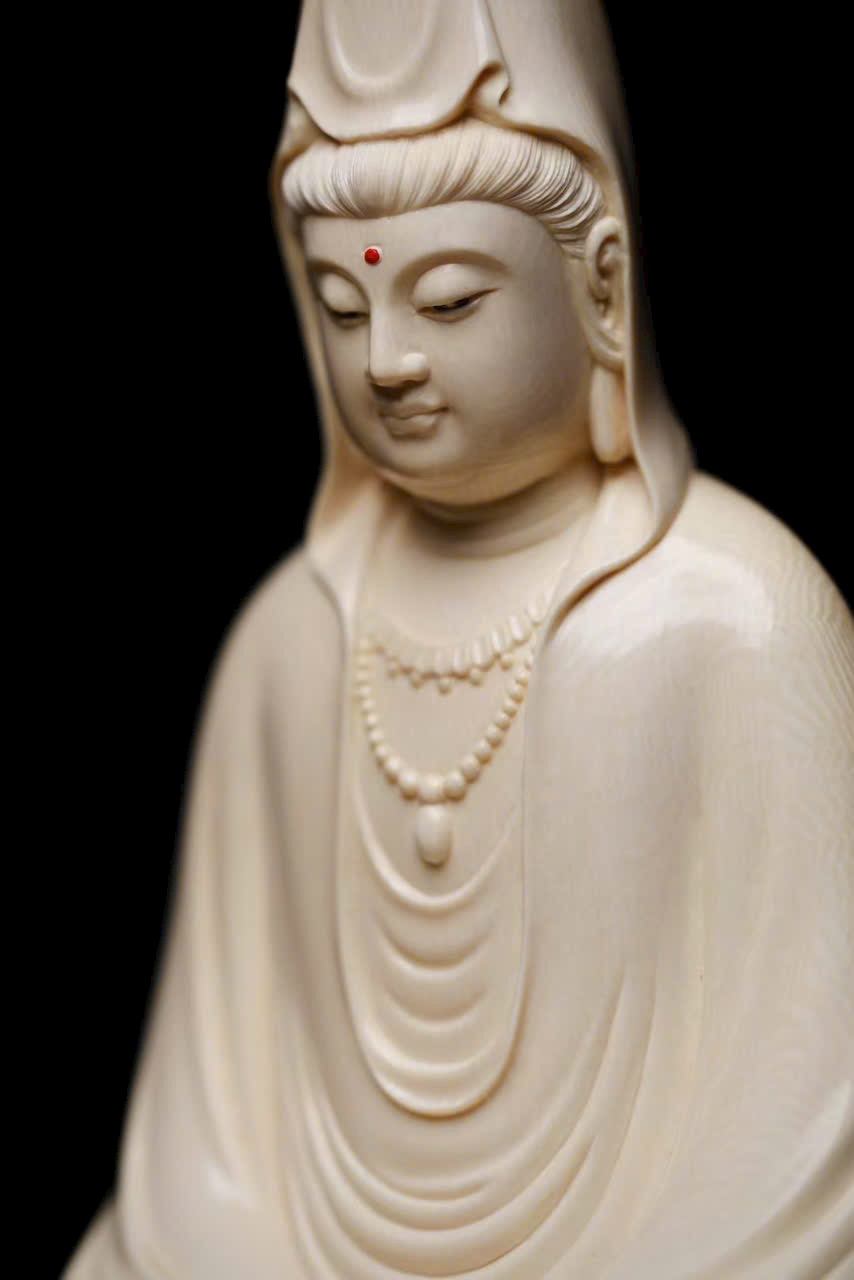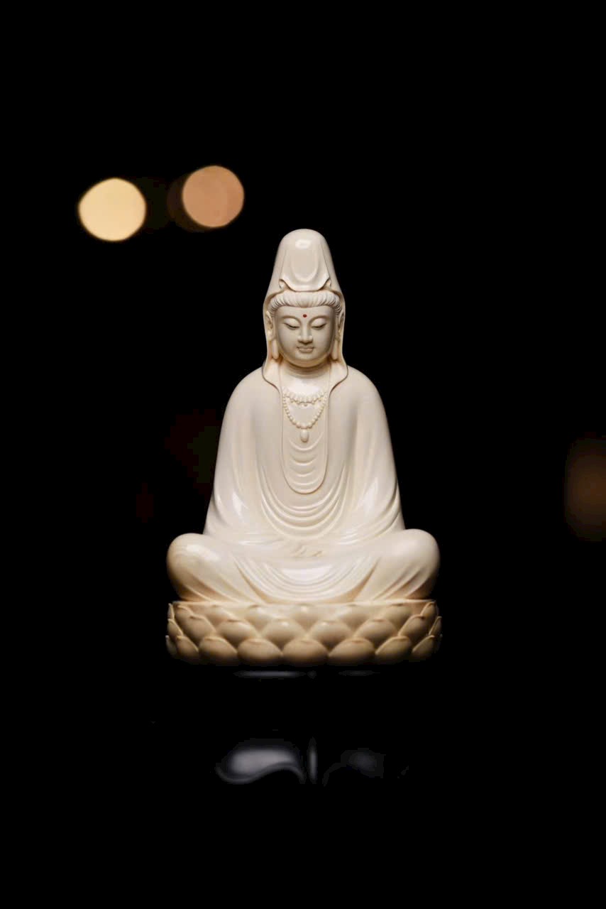 Tuyển chọn n.gà ma mút chất phôi cực đẹp, nghệ nhân chế tác hoàn chỉnh. Quan Âm mỉm cười, ánh mắt từ hòa, tà áo uyển chuyển buông rủ, pháp tướng tự tại đầy từ bi. Phẩm bày án thư, tĩnh tâm gột bụi, một góc thiền ý, vạn phần an nhiên.