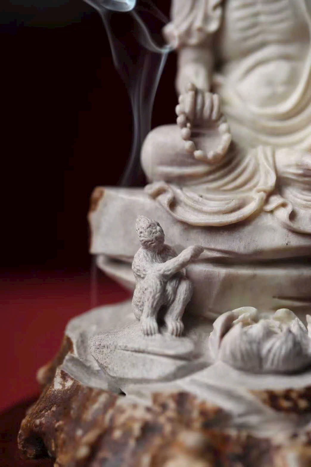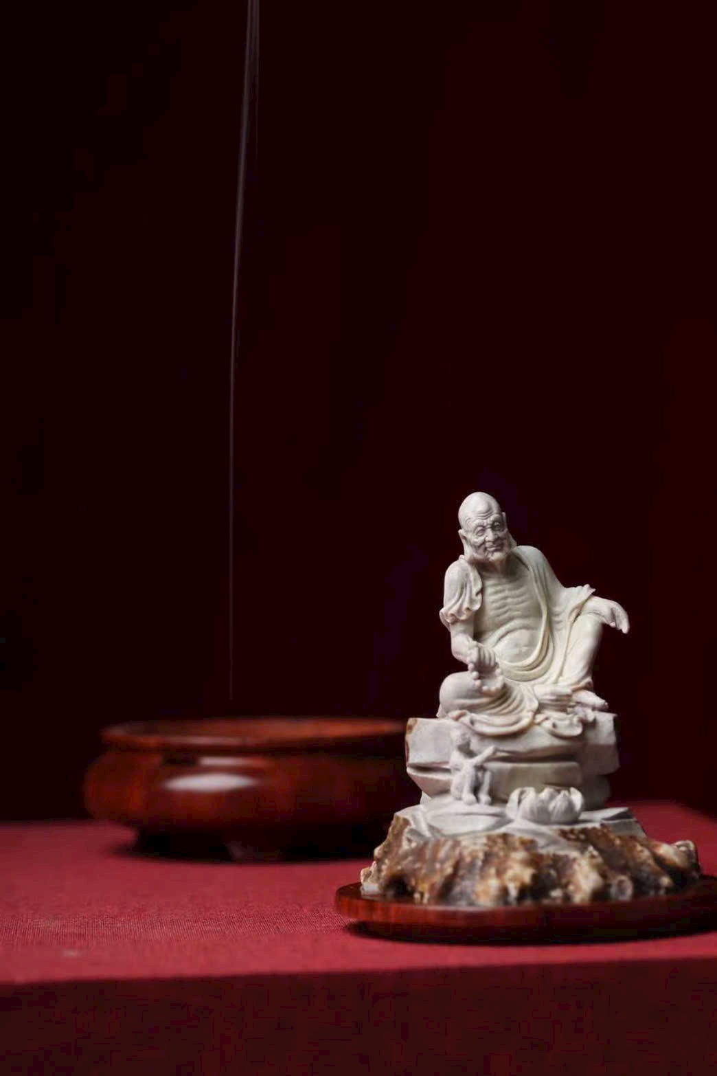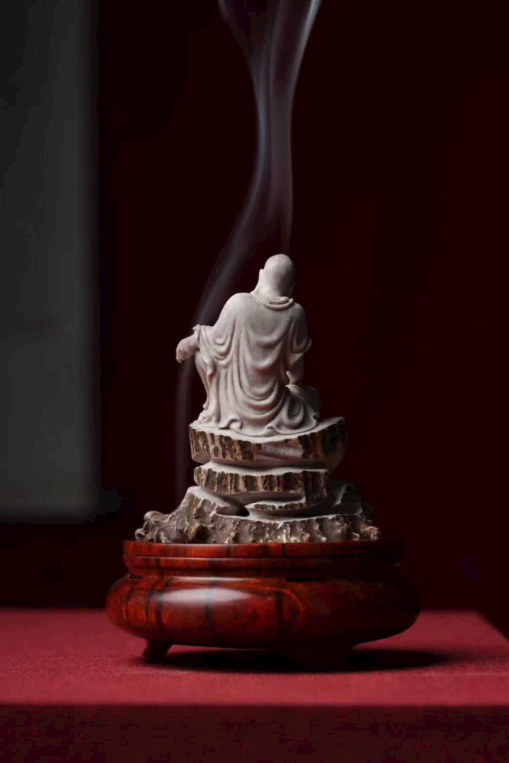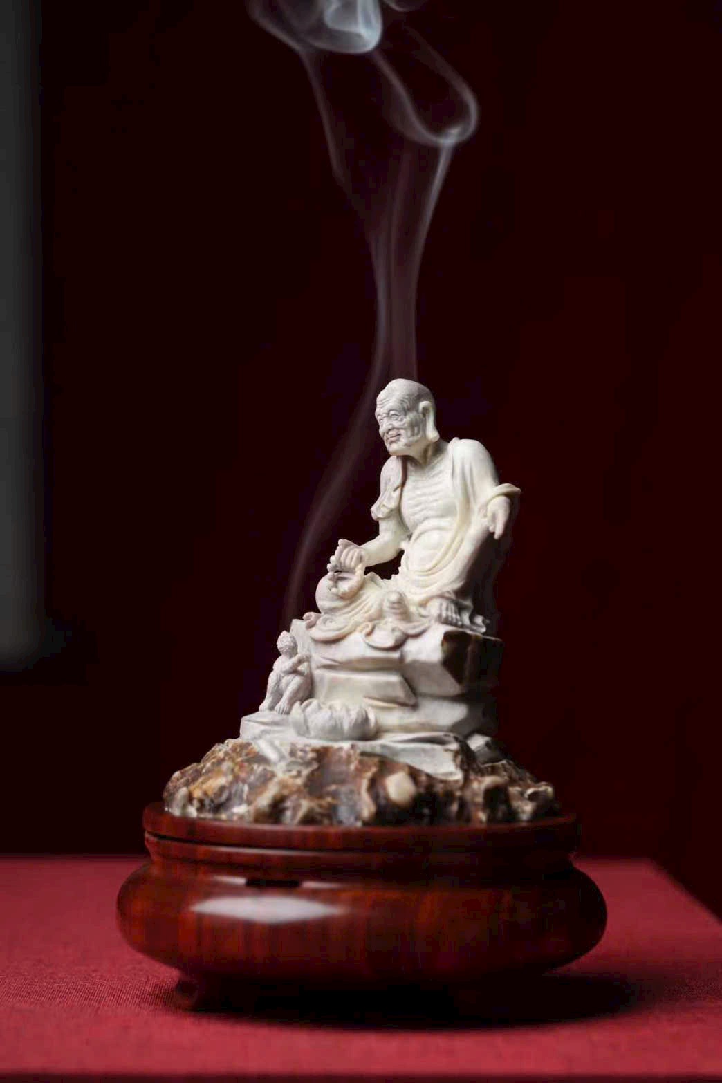 Tác phẩm chế tác thủ công hoàn toàn từ lộc giác, tạo hình mộc mạc mà hàm súc, gợi ý cảnh tầm đạo – vấn đạo, thích hợp cho không gian thiền, trà thất hoặc thư phòng.