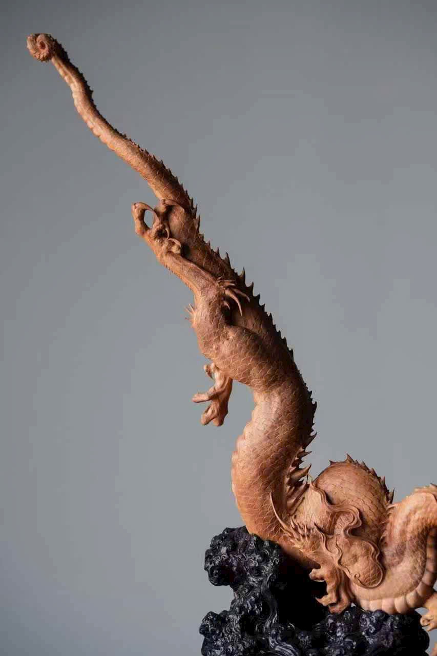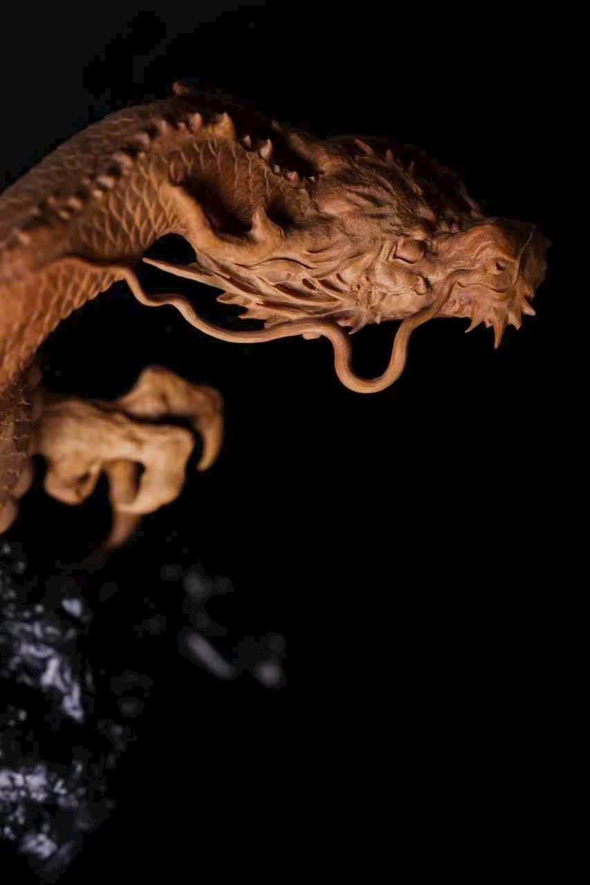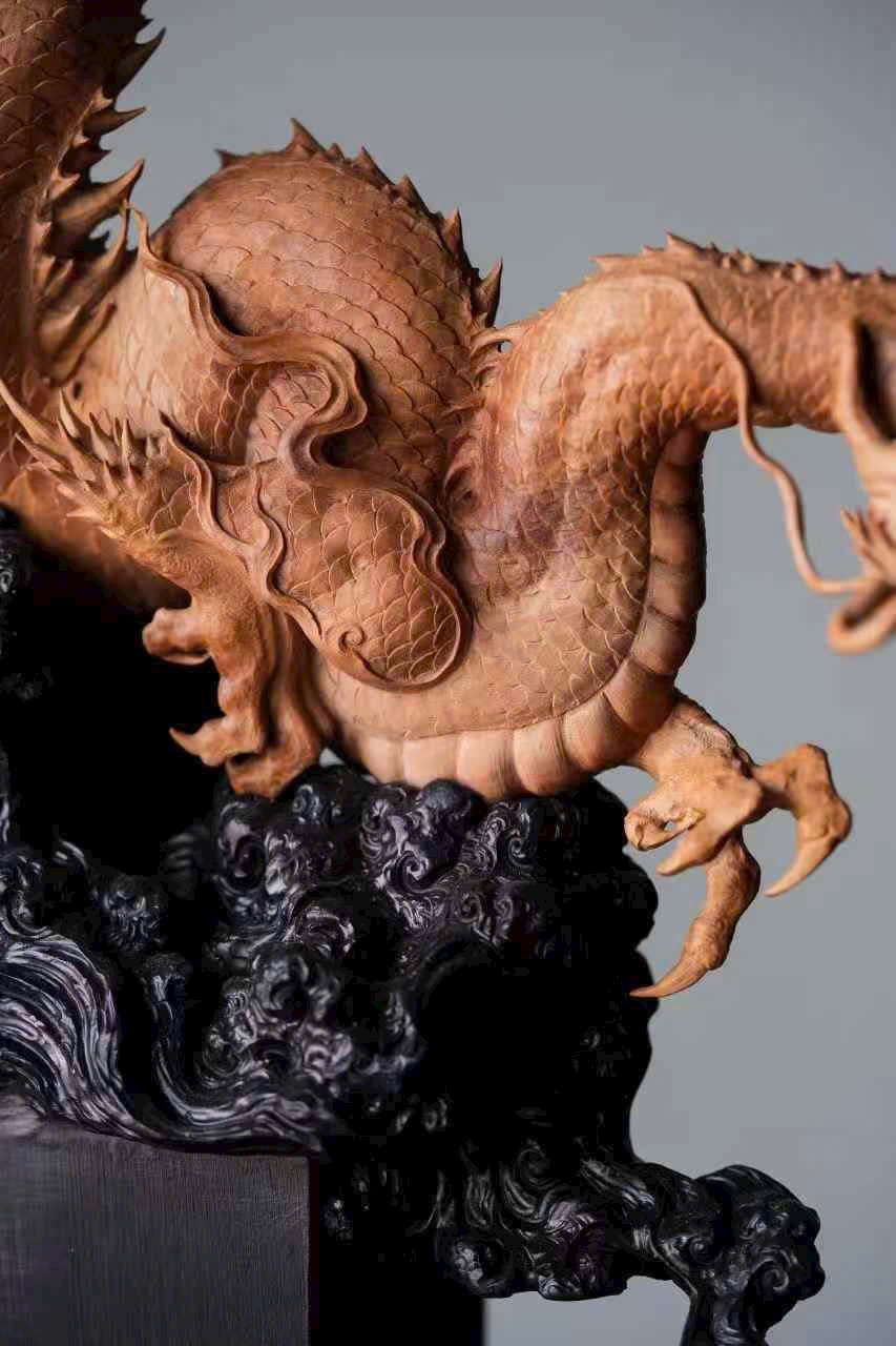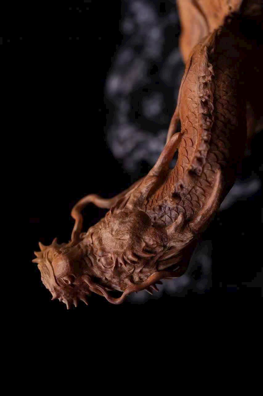 Gỗ thơm dịu như mật, rồng uốn lượn qua mây phá sương, râu rồng dẻo dai vươn bay. Đuôi uốn như sóng dữ, đầu hiện dáng cúi ngẩng. Bày nơi huyền quan hoặc phòng trang nhã, mang đến thiền ý mây nước, thu hút cát khí trời đất.