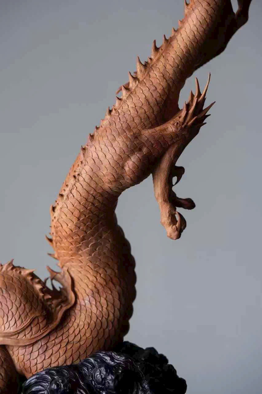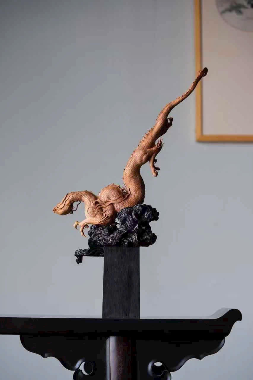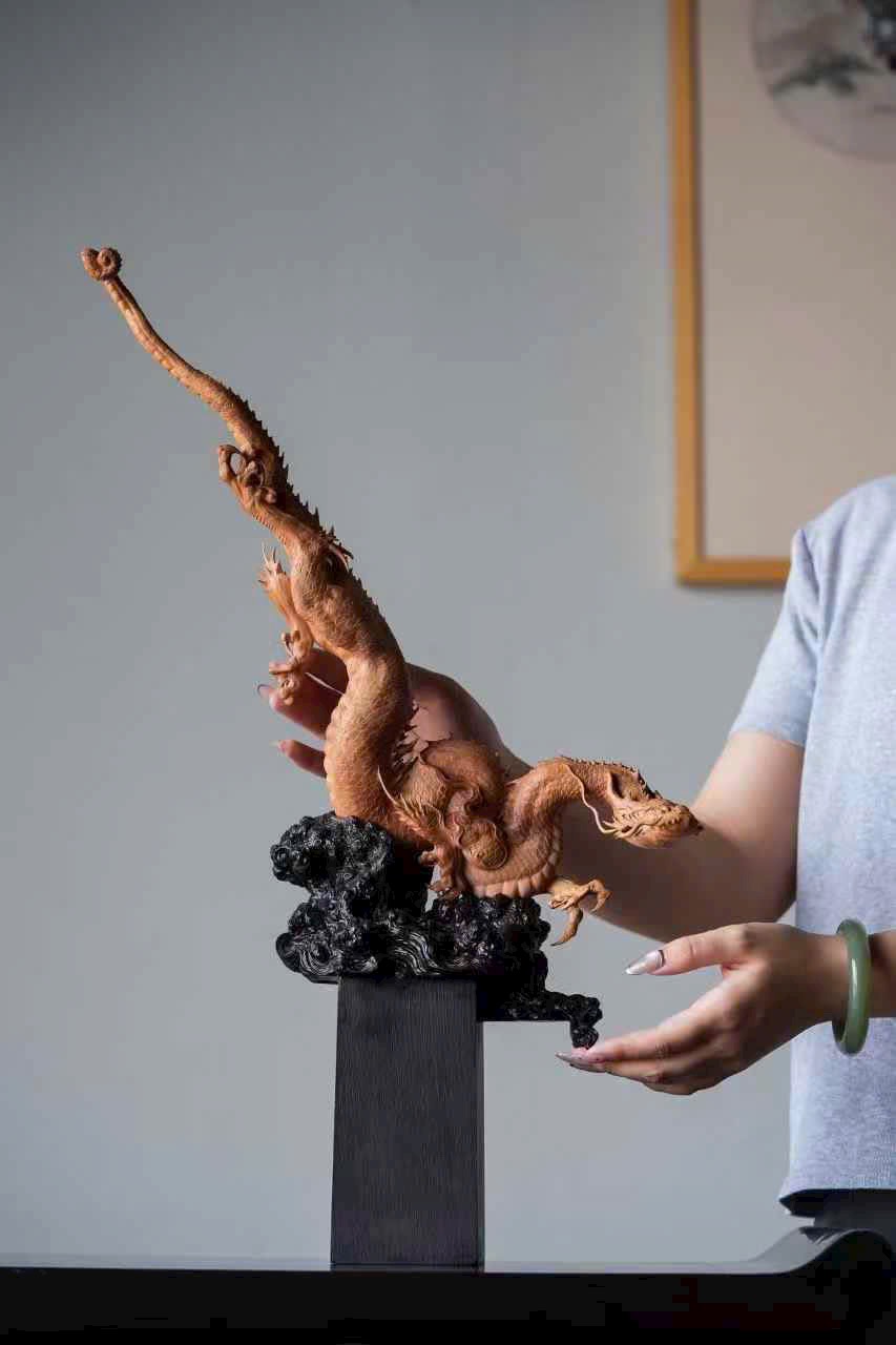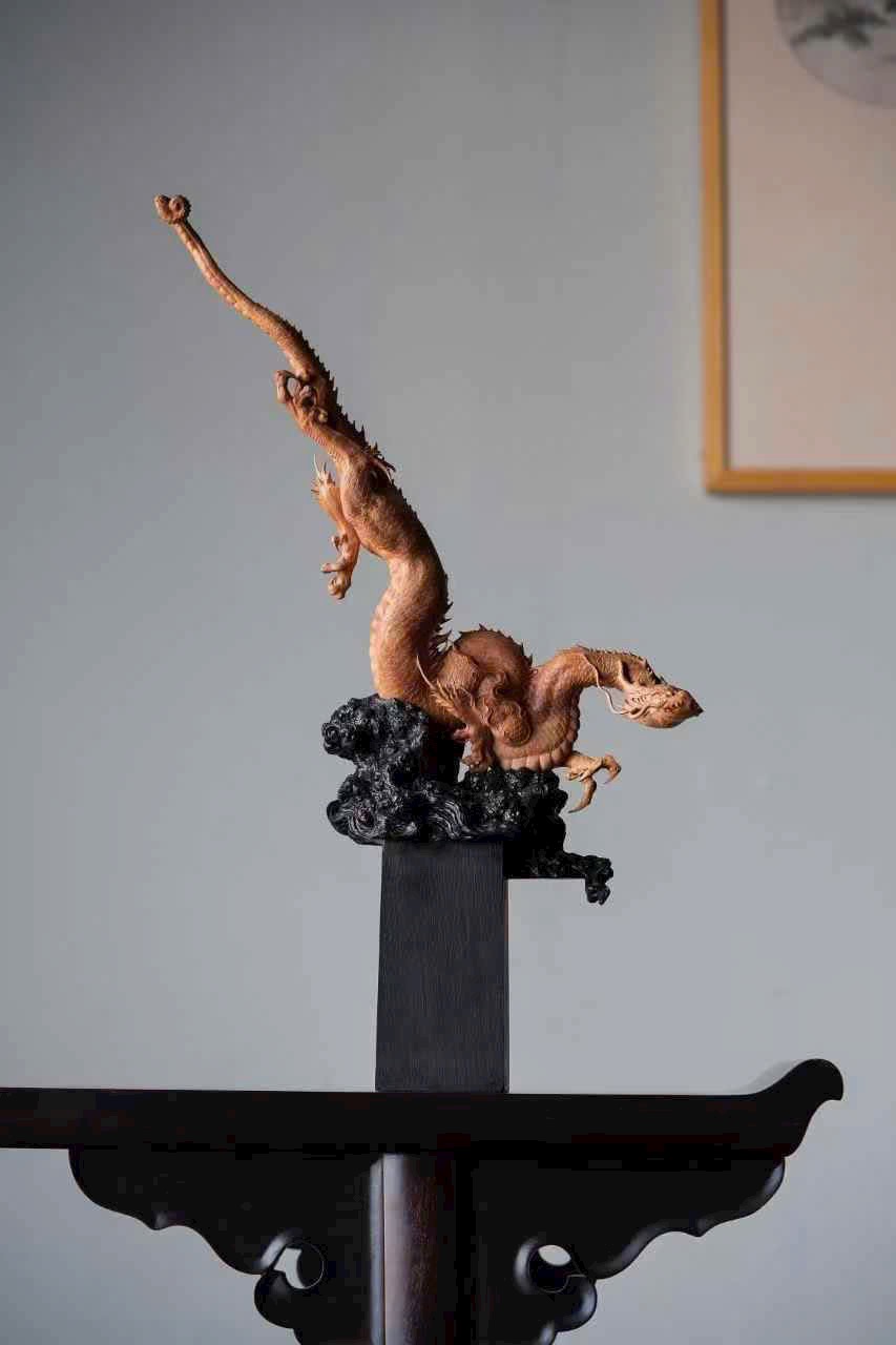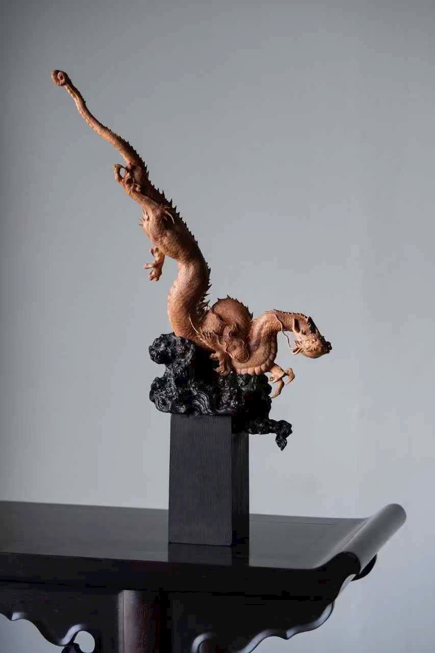 Gỗ thơm dịu như mật, rồng uốn lượn qua mây phá sương, râu rồng dẻo dai vươn bay. Đuôi uốn như sóng dữ, đầu hiện dáng cúi ngẩng. Bày nơi huyền quan hoặc phòng trang nhã, mang đến thiền ý mây nước, thu hút cát khí trời đất.