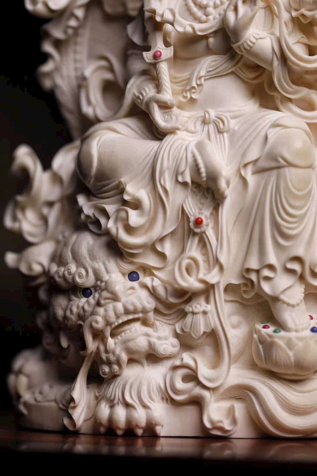 Chọn ng.à voi ma mút phôi cao cấp, được tỉ mỉ điêu khắc thủ công. Văn Thù Bồ Tát gương mặt hiền hòa, tay cầm pháp khí, xung quanh chạm khắc hoa văn cuộn cỏ và lọng báu tinh xảo, linh thú hiện hình sinh động. Chất ng.à ấm nhuận, sắc trắng trong sáng, hòa quyện hoàn hảo vẻ trang nghiêm thần thánh của Bồ Tát cùng nghệ thuật chạm khắc tinh mỹ.