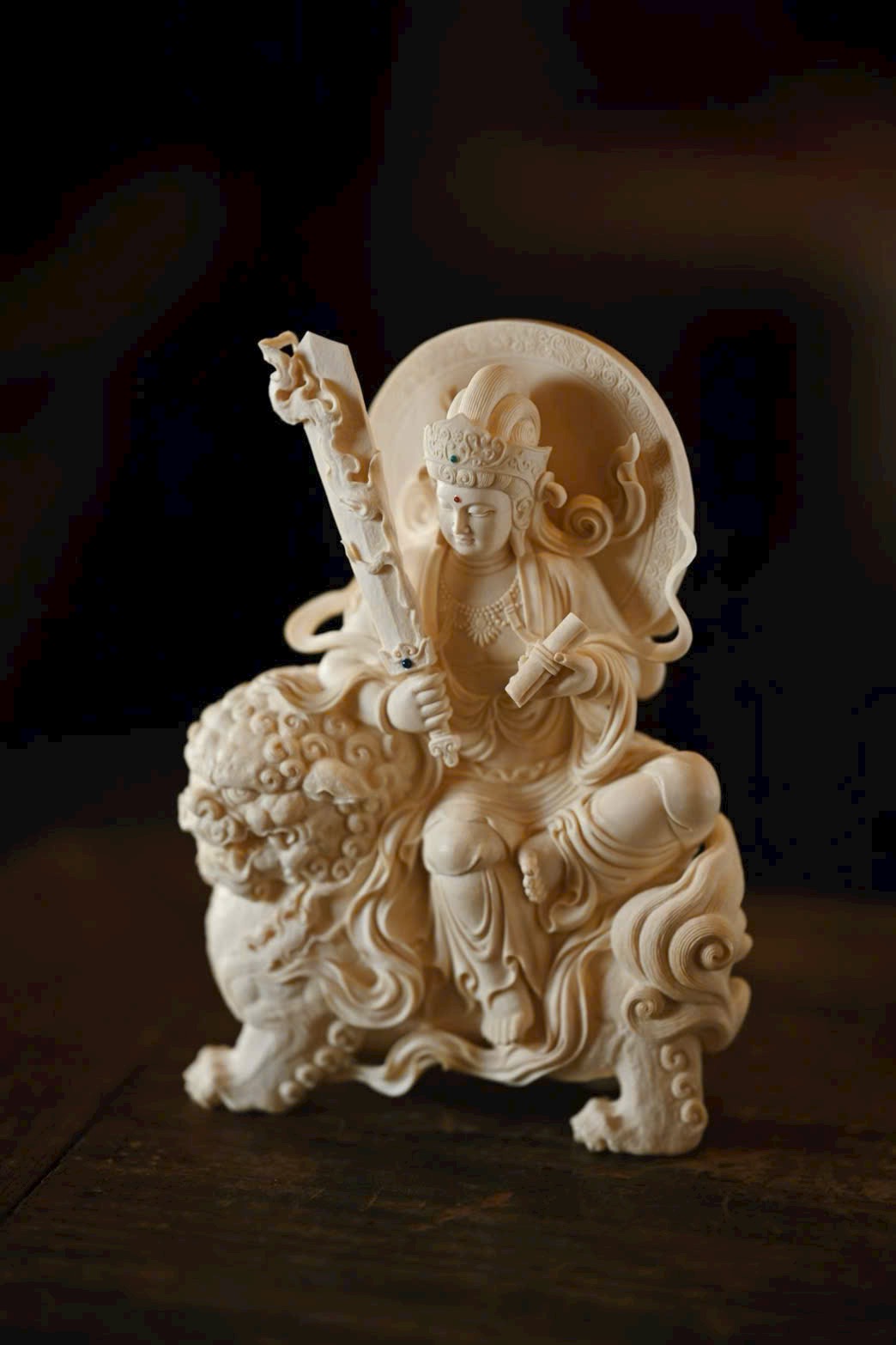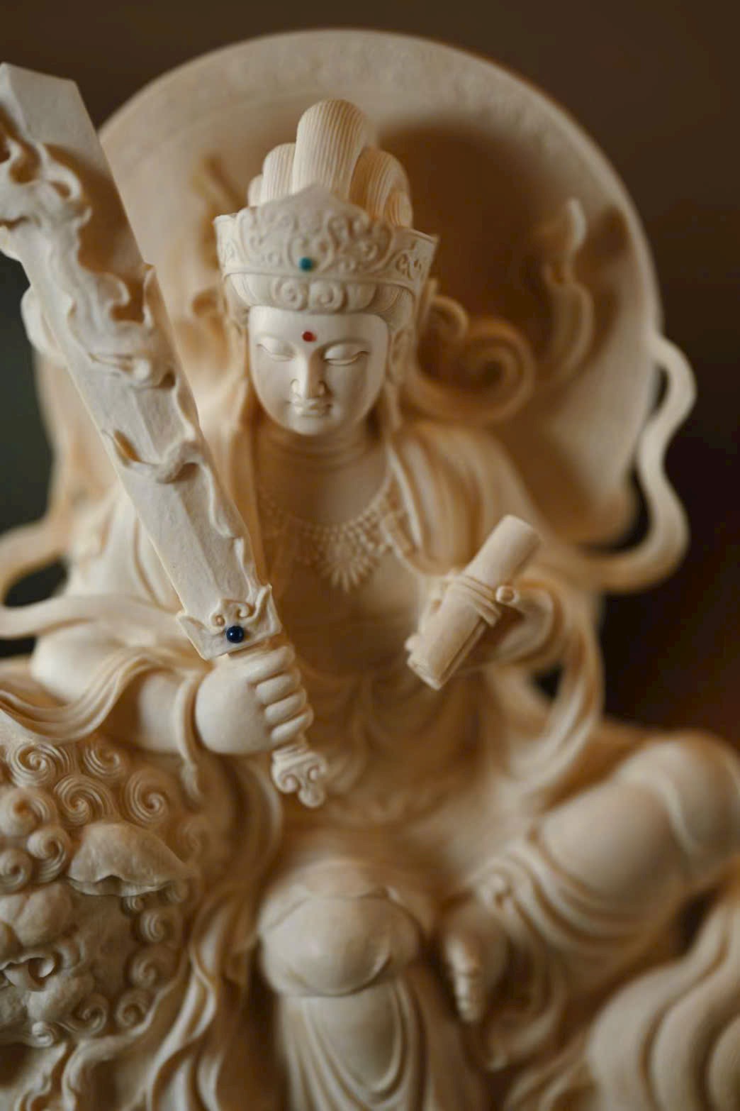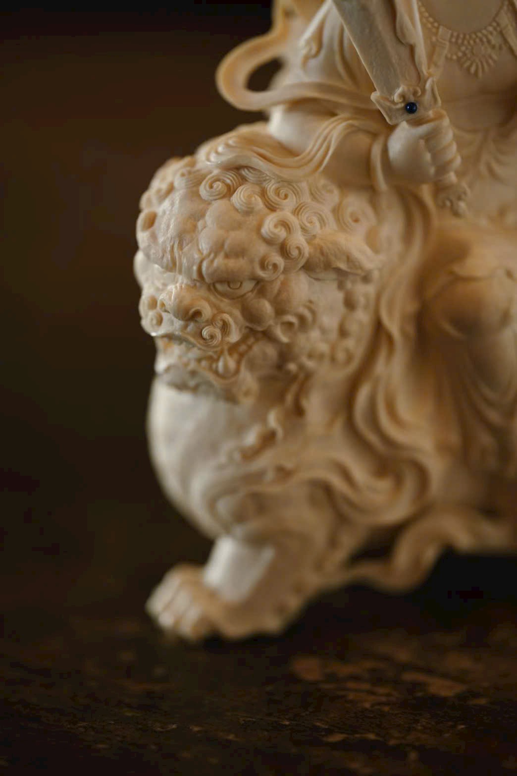Tác phẩm được tạc từ một khối liệu nguyên vẹn, đường đục chạm tinh xảo. Văn Thù Bồ Tát đôi mắt hơi nhìn xuống, thần thái ôn hòa nhu hòa, tọa trên lưng sư tử. Trước ngực trang sức anh lạc uyển chuyển. Con sư tử phía dưới cúi đầu, chân mày cuộn khép, mắt lộ thần quang, lông xoăn nổi bật; hình thái sinh động, khí vận trang nghiêm mà thanh nhã.