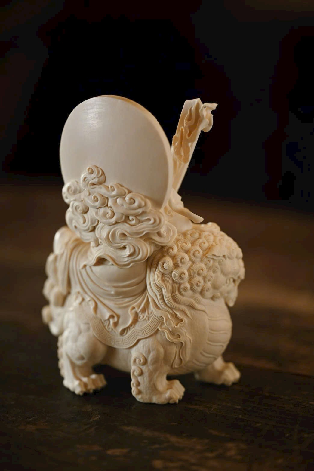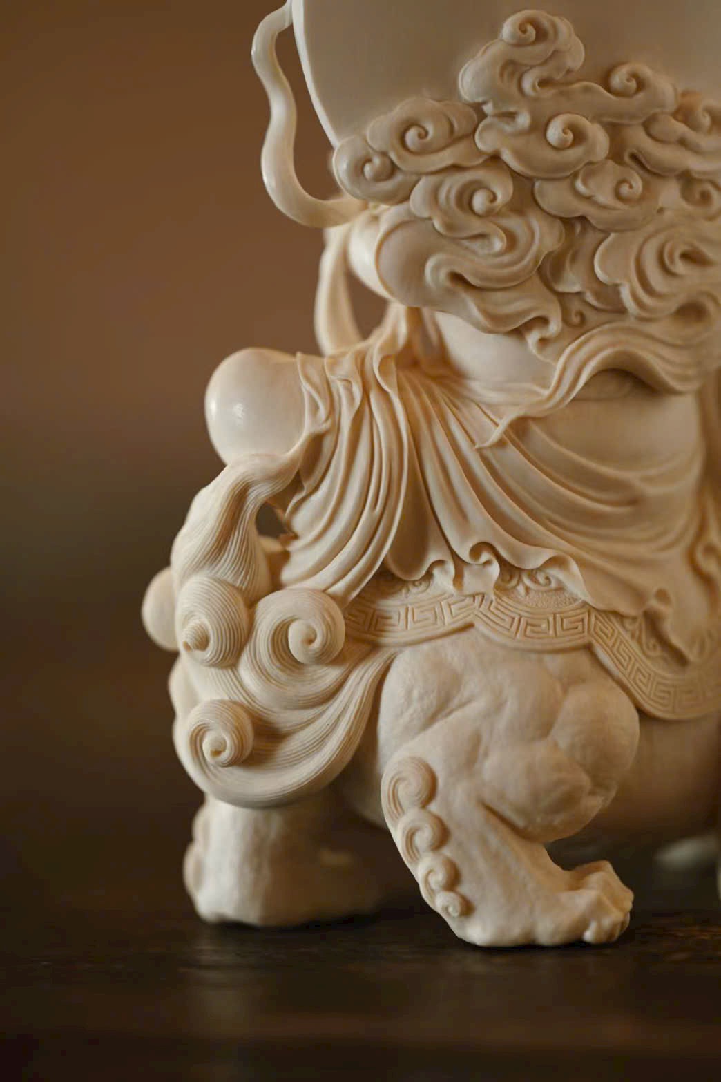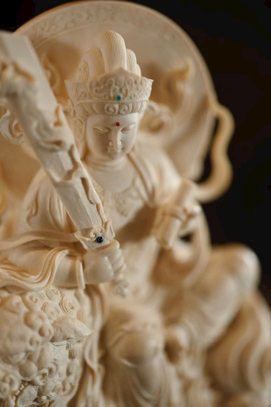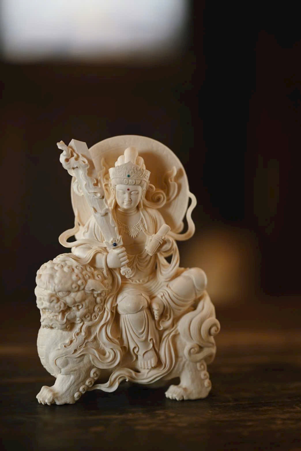 Tác phẩm được tạc từ một khối liệu nguyên vẹn, đường đục chạm tinh xảo. Văn Thù Bồ Tát đôi mắt hơi nhìn xuống, thần thái ôn hòa nhu hòa, tọa trên lưng sư tử. Trước ngực trang sức anh lạc uyển chuyển. Con sư tử phía dưới cúi đầu, chân mày cuộn khép, mắt lộ thần quang, lông xoăn nổi bật; hình thái sinh động, khí vận trang nghiêm mà thanh nhã.