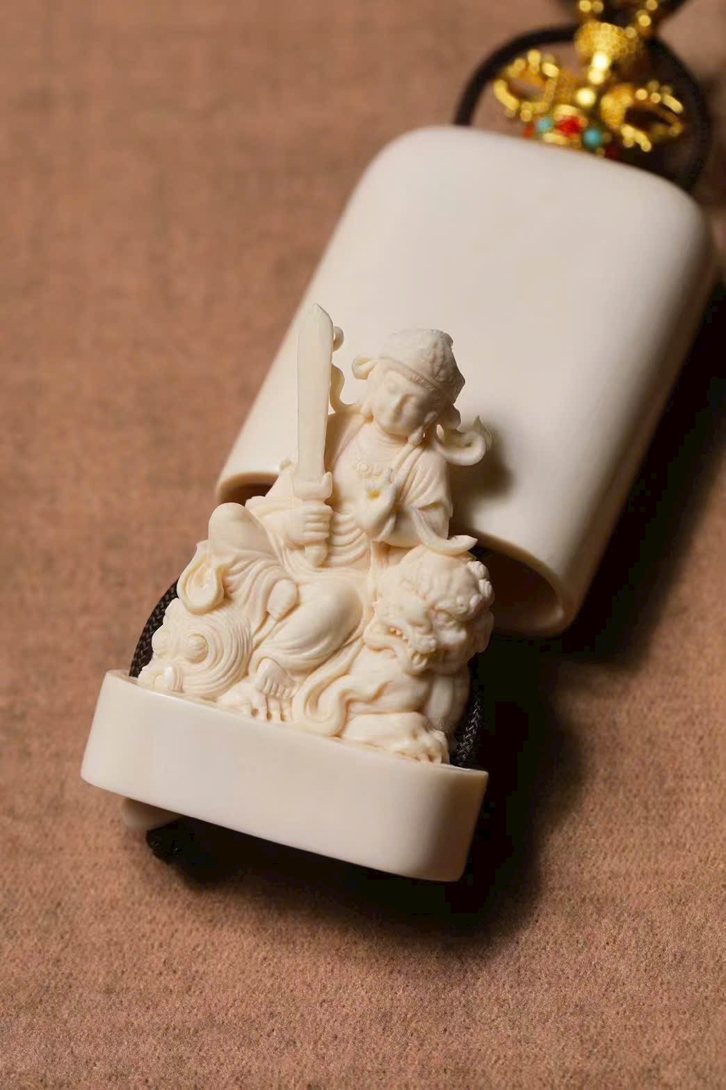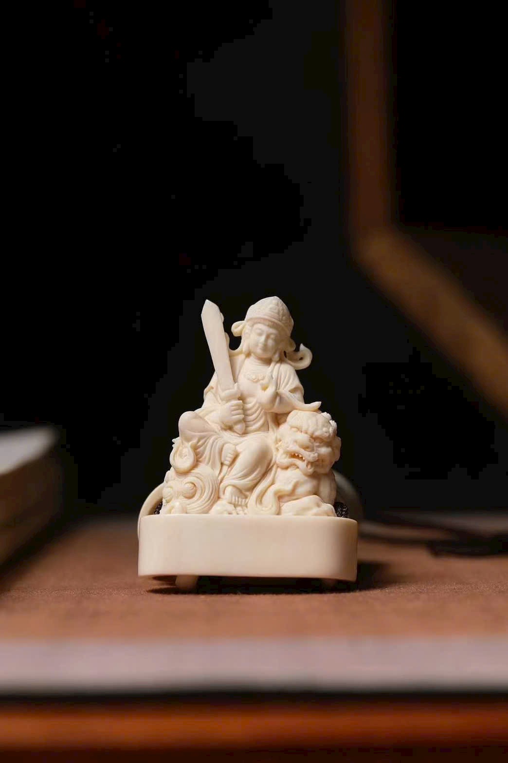 Ẩn chứa tinh hoa, chọn chất liệu mịn đẹp, Bồ Tát Văn Thù an nhiên ngồi, tọa kỵ đều ở tư thế nằm phục, búi tóc cao, gương mặt đầy đặn phúc hậu, lần lượt cầm kiếm và hoa sen, phong thái cổ kính trang nghiêm. Chi tiết tinh xảo, không chê vào đâu được; tượng toàn thân chạm khắc, khuôn mặt đoan trang từ bi Văn Thù Bồ Tát. Là món phẩm thích hợp để sưu tầm hoặc làm quà tặng.