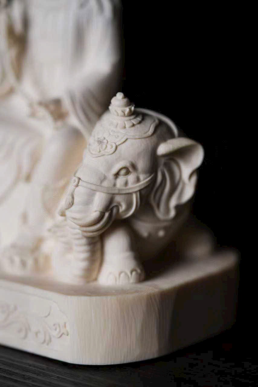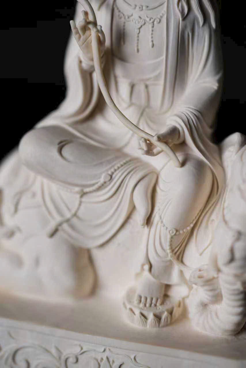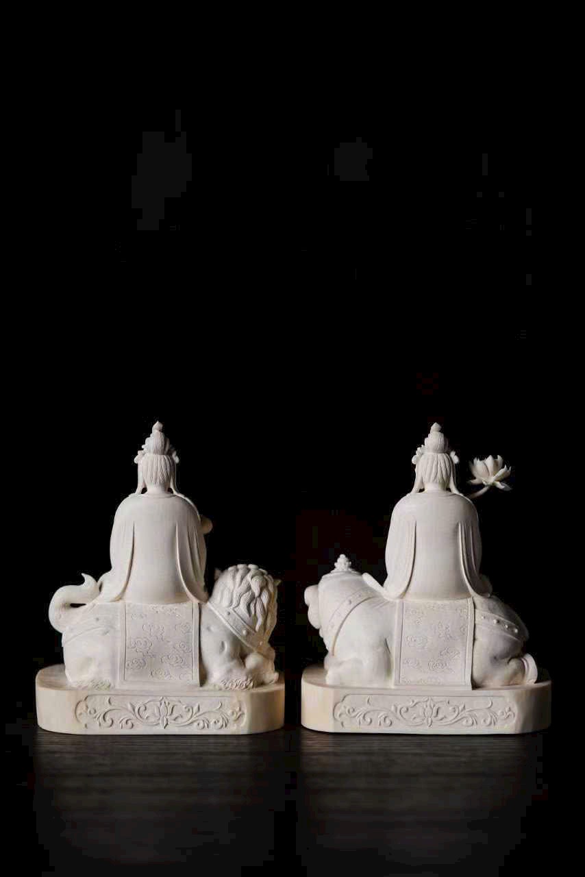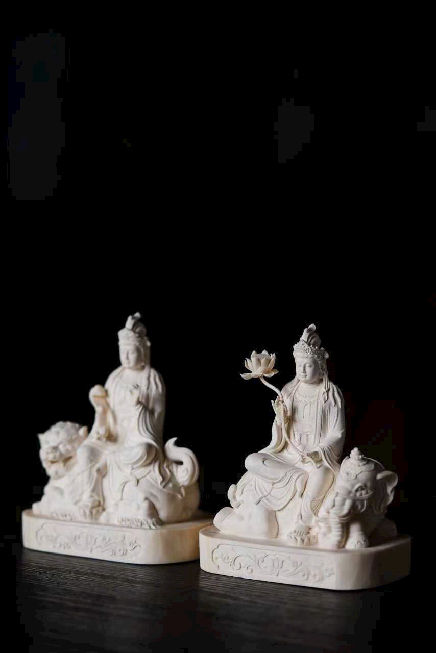 Chất ng.à trắng trong như ánh trăng thấm ngọc, đôi tôn tượng song tọa đối diện. Văn Thù giơ kiếm chỉ trời, soi rọi trí tuệ; Phổ Hiền kết ấn liên hoa, dẫn thuyền từ bi. Áo mũ tung bay, bảo tượng hiển linh, pháp tướng viên mãn, chiếu rọi thiền đường.