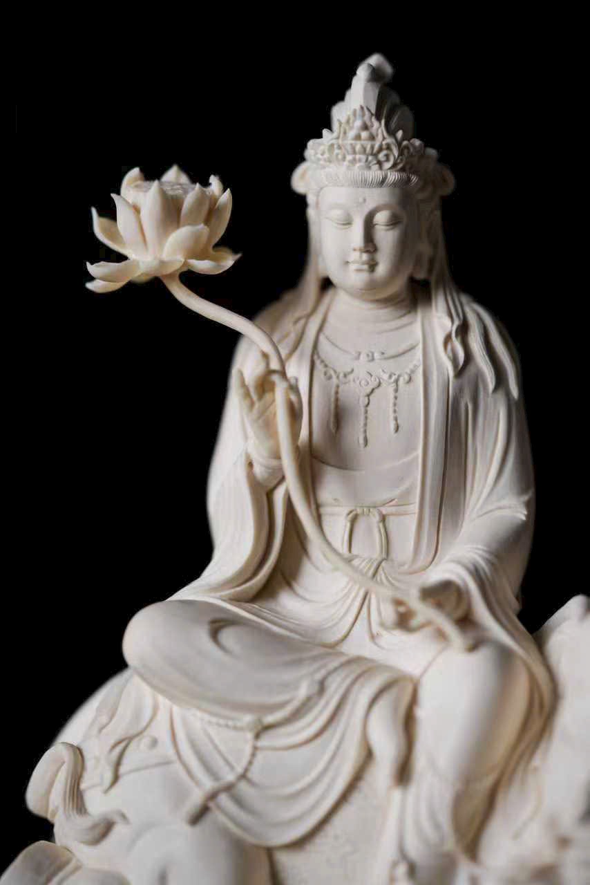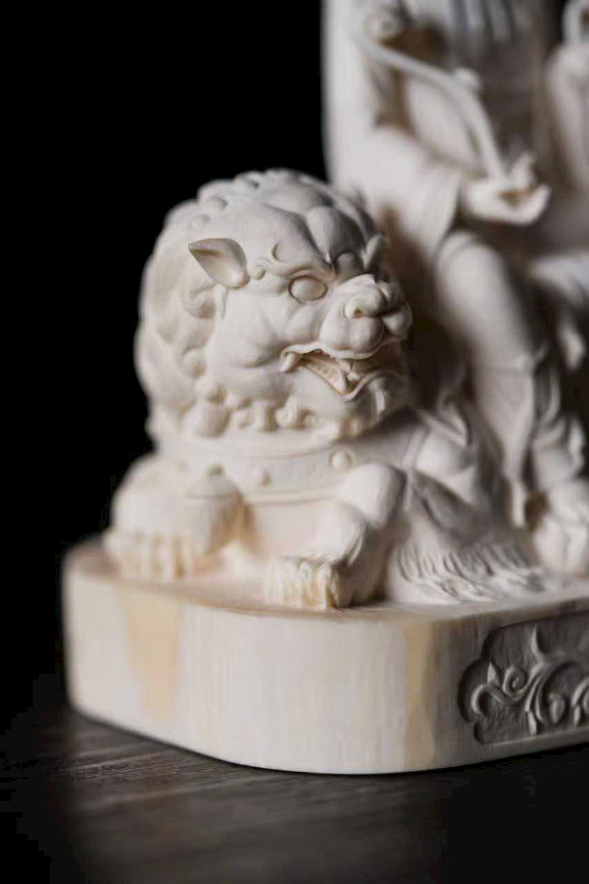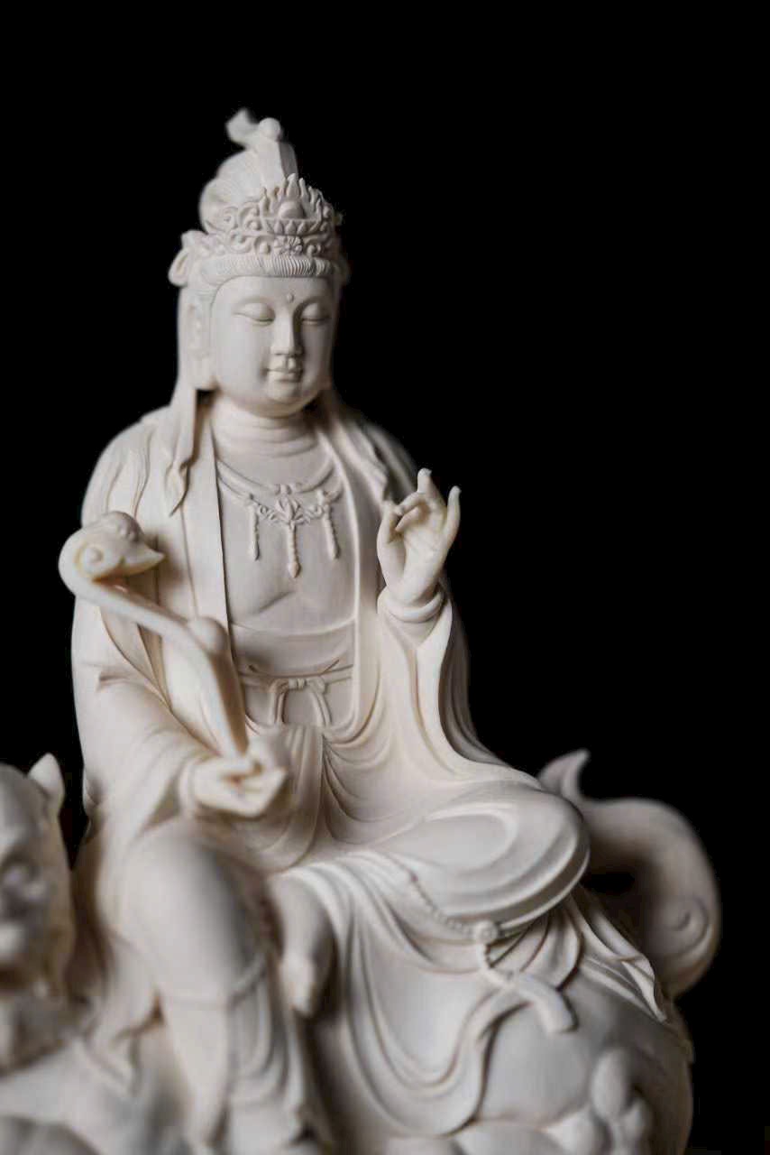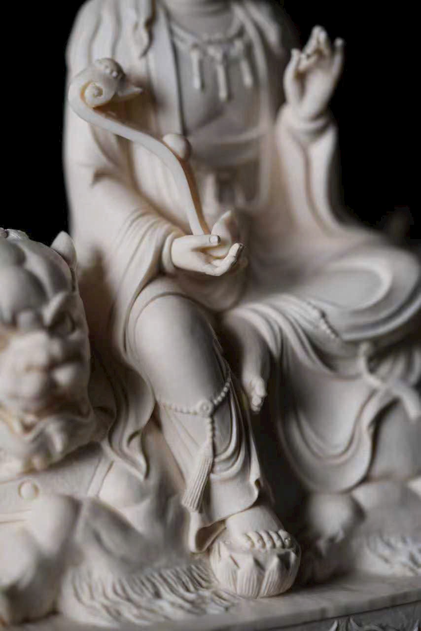 Chất ng.à trắng trong như ánh trăng thấm ngọc, đôi tôn tượng song tọa đối diện. Văn Thù giơ kiếm chỉ trời, soi rọi trí tuệ; Phổ Hiền kết ấn liên hoa, dẫn thuyền từ bi. Áo mũ tung bay, bảo tượng hiển linh, pháp tướng viên mãn, chiếu rọi thiền đường.