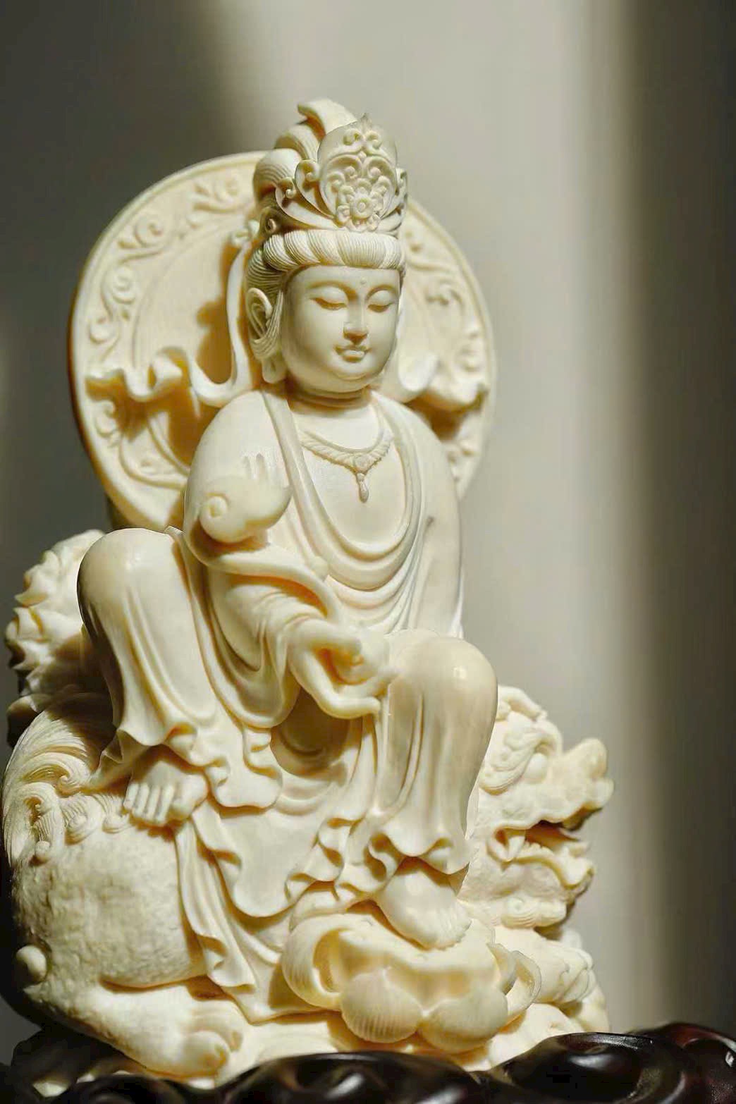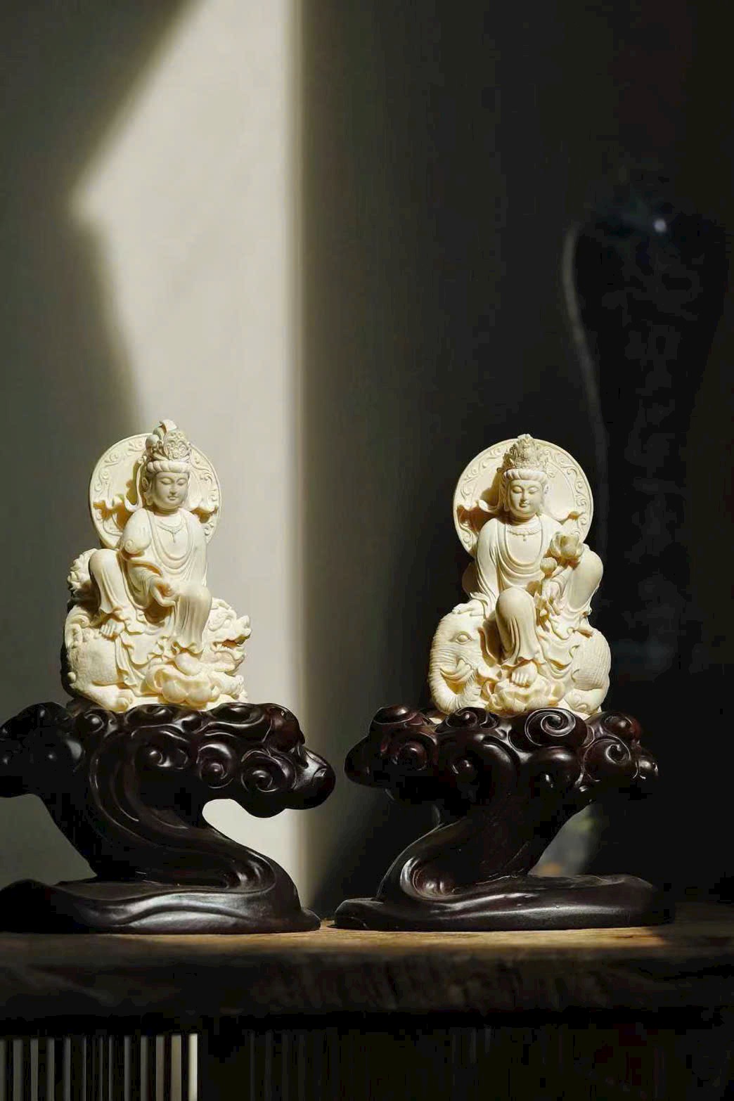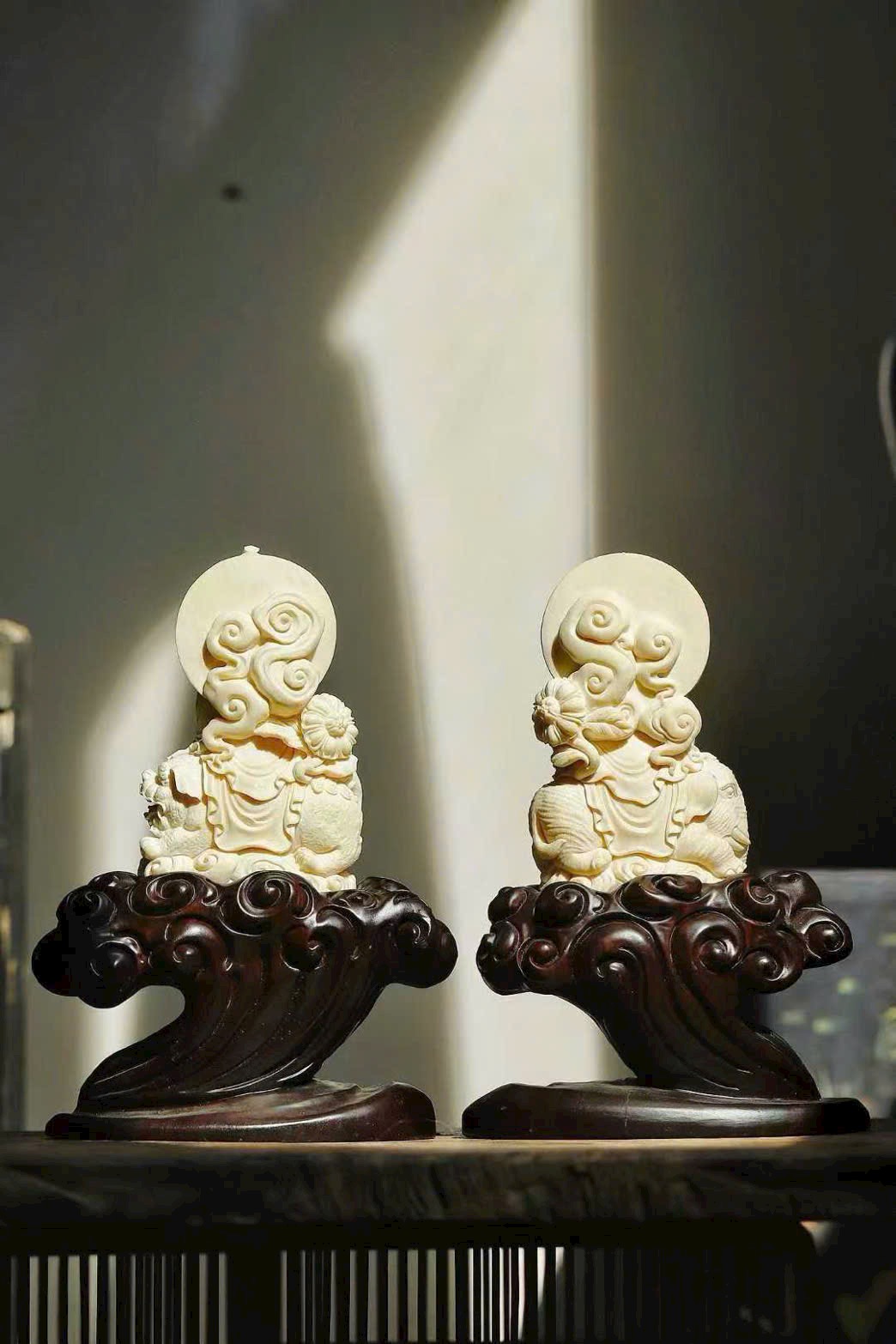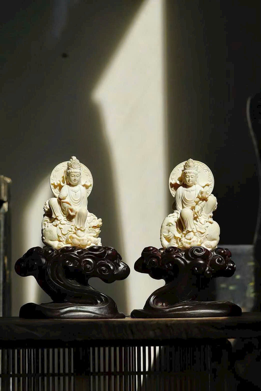 Tượng khắc Văn Thù và Phổ Hiền, một vị cưỡi thanh sư, một vị ngự bạch tượng. Văn Thù tay cầm huệ kiếm, Phổ Hiền nâng hoa sen, hai tôn giả dung mạo trang nghiêm hiền hòa, từ bi mà vẫn tỏa khí uy nghi. Chất ngà tinh khiết thanh nhã, đường đao tinh tế tỉ mỉ, Phật tướng cúi nhìn chan chứa lòng từ, bảo đới nhẹ vờn như bay, hai hình thế cân xứng hài hòa, thấm đượm ý nghĩa từ bi hộ thế.