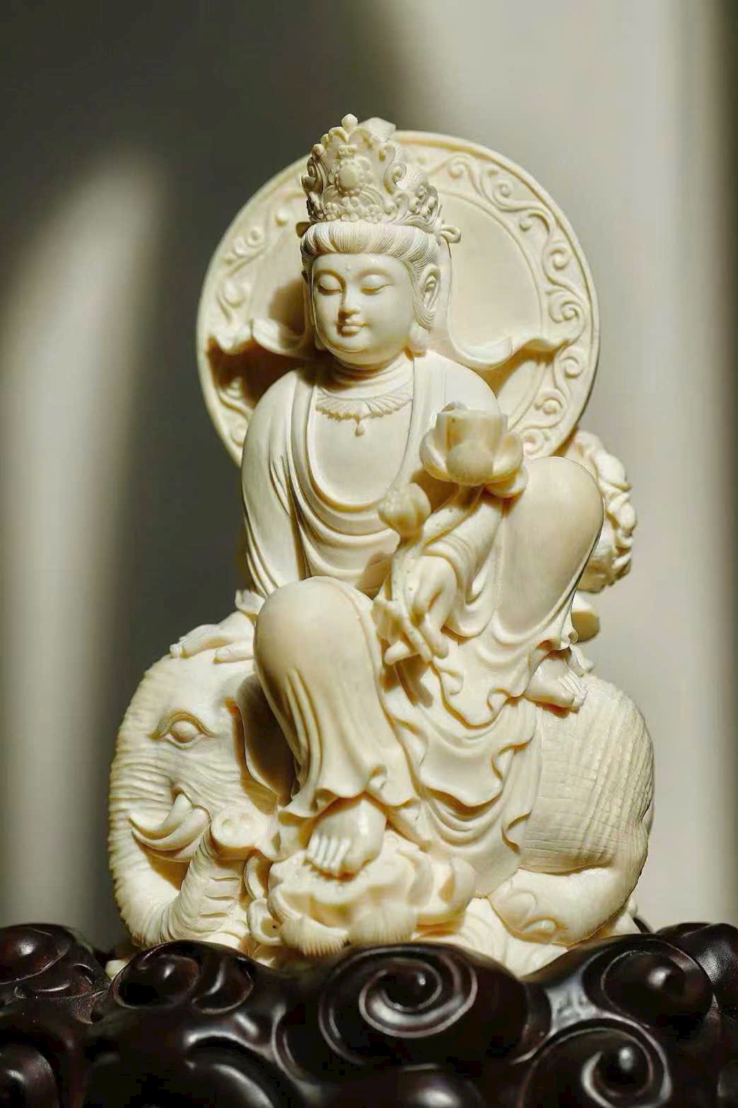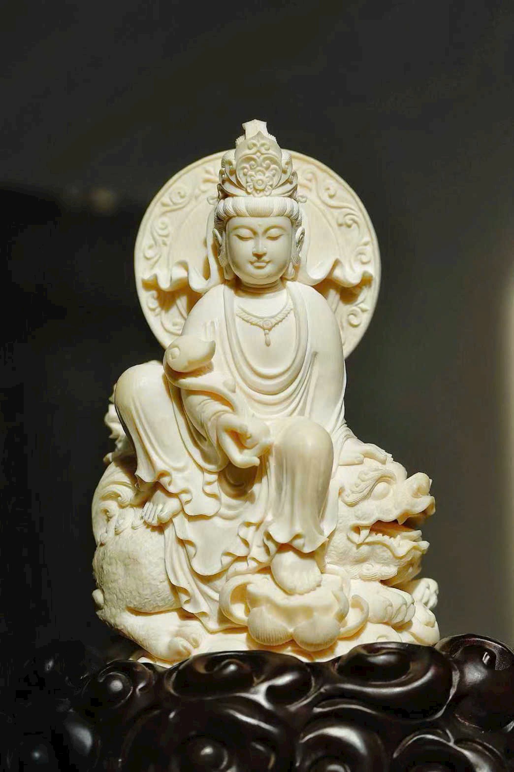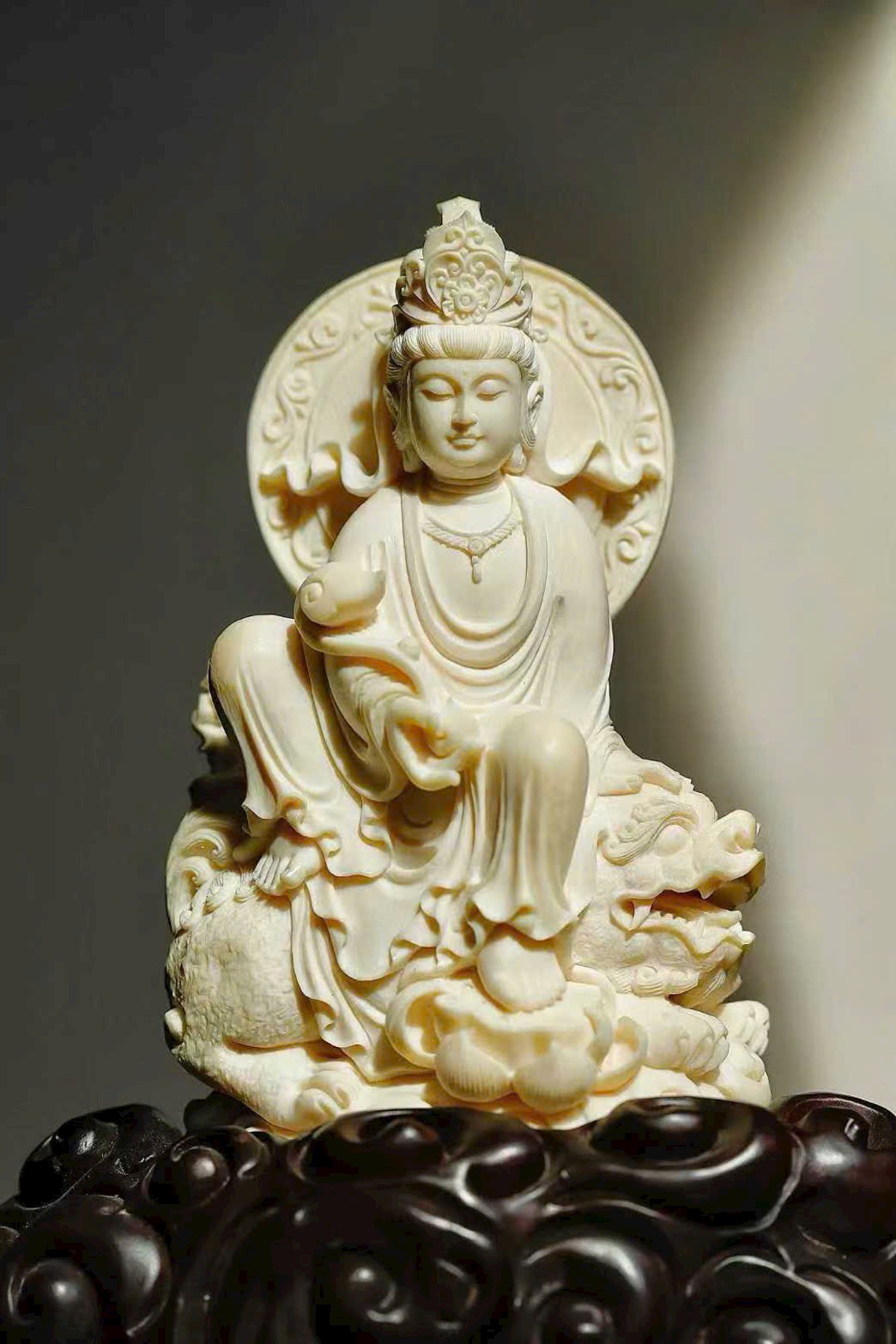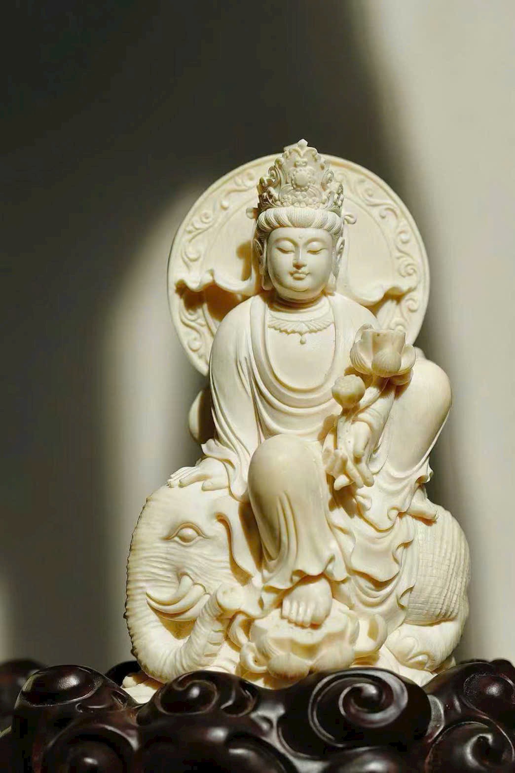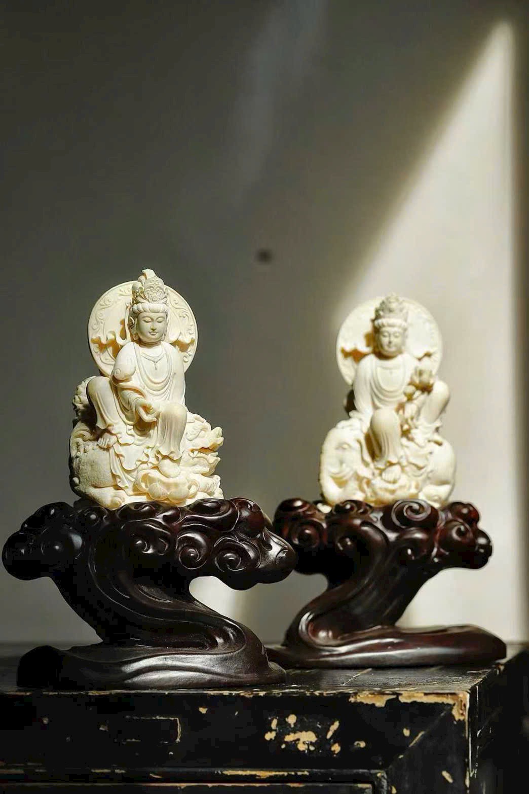 Tượng khắc Văn Thù và Phổ Hiền, một vị cưỡi thanh sư, một vị ngự bạch tượng. Văn Thù tay cầm huệ kiếm, Phổ Hiền nâng hoa sen, hai tôn giả dung mạo trang nghiêm hiền hòa, từ bi mà vẫn tỏa khí uy nghi. Chất ngà tinh khiết thanh nhã, đường đao tinh tế tỉ mỉ, Phật tướng cúi nhìn chan chứa lòng từ, bảo đới nhẹ vờn như bay, hai hình thế cân xứng hài hòa, thấm đượm ý nghĩa từ bi hộ thế.