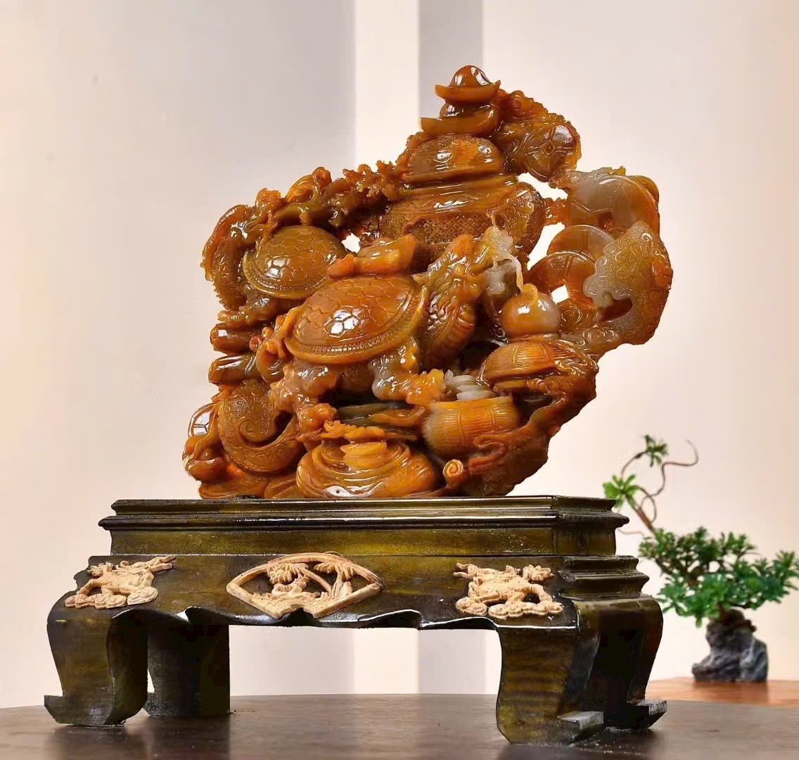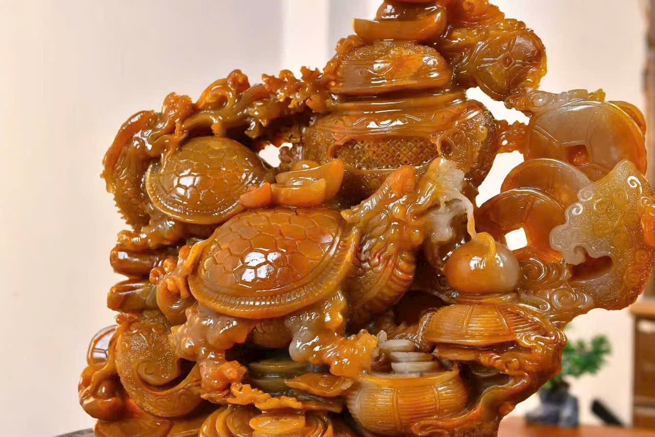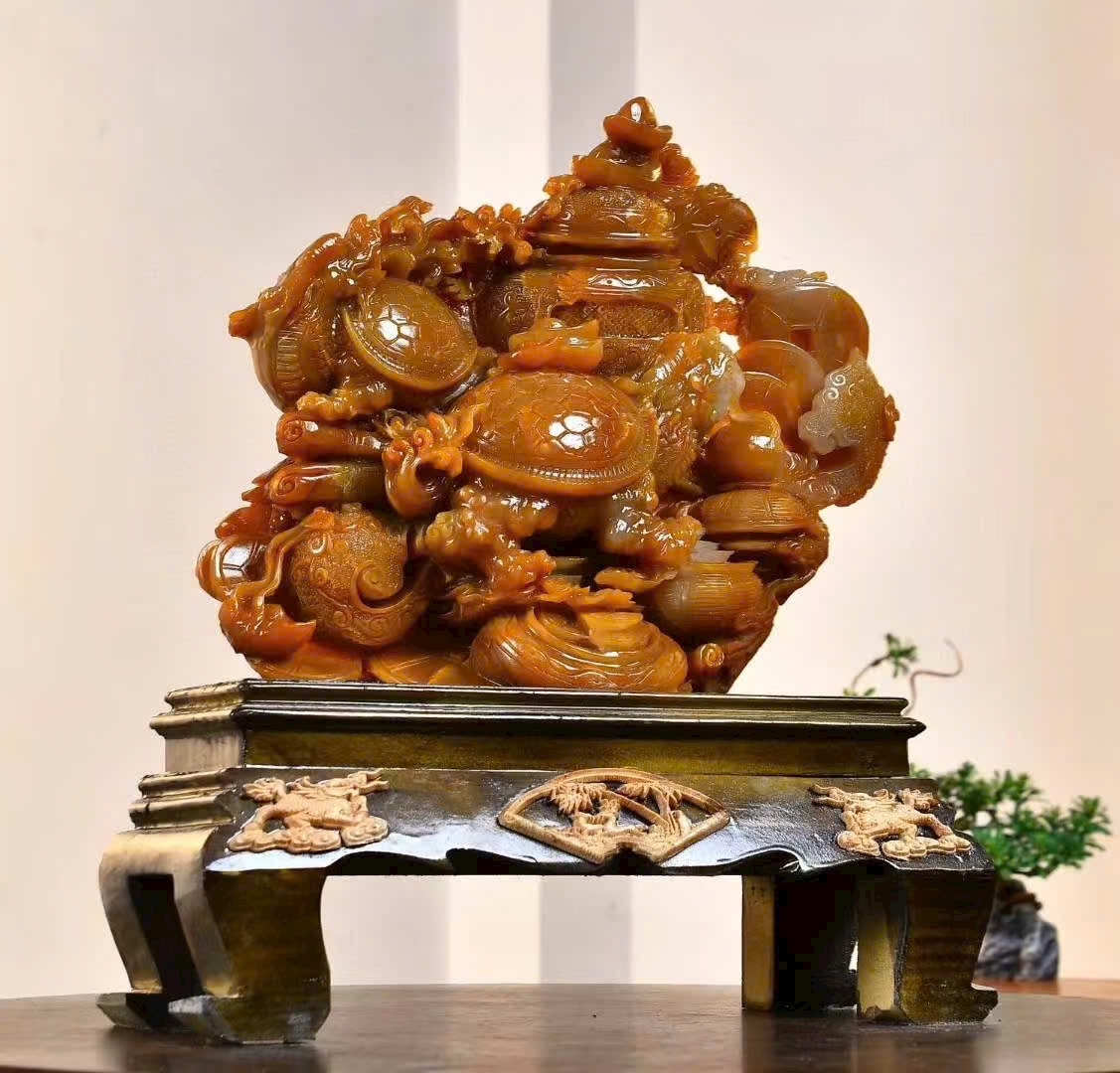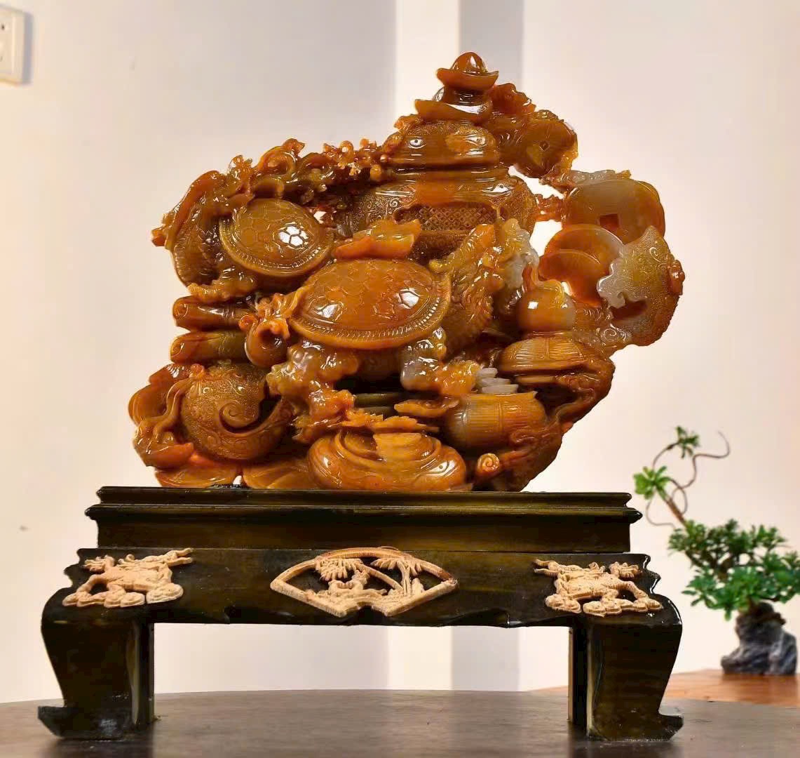 Tác phẩm điêu khắc đá điền hoàng, chất đá kết tinh tuyệt đẹp, màu sắc ấm mượt, liền khối, kèm kiểm định