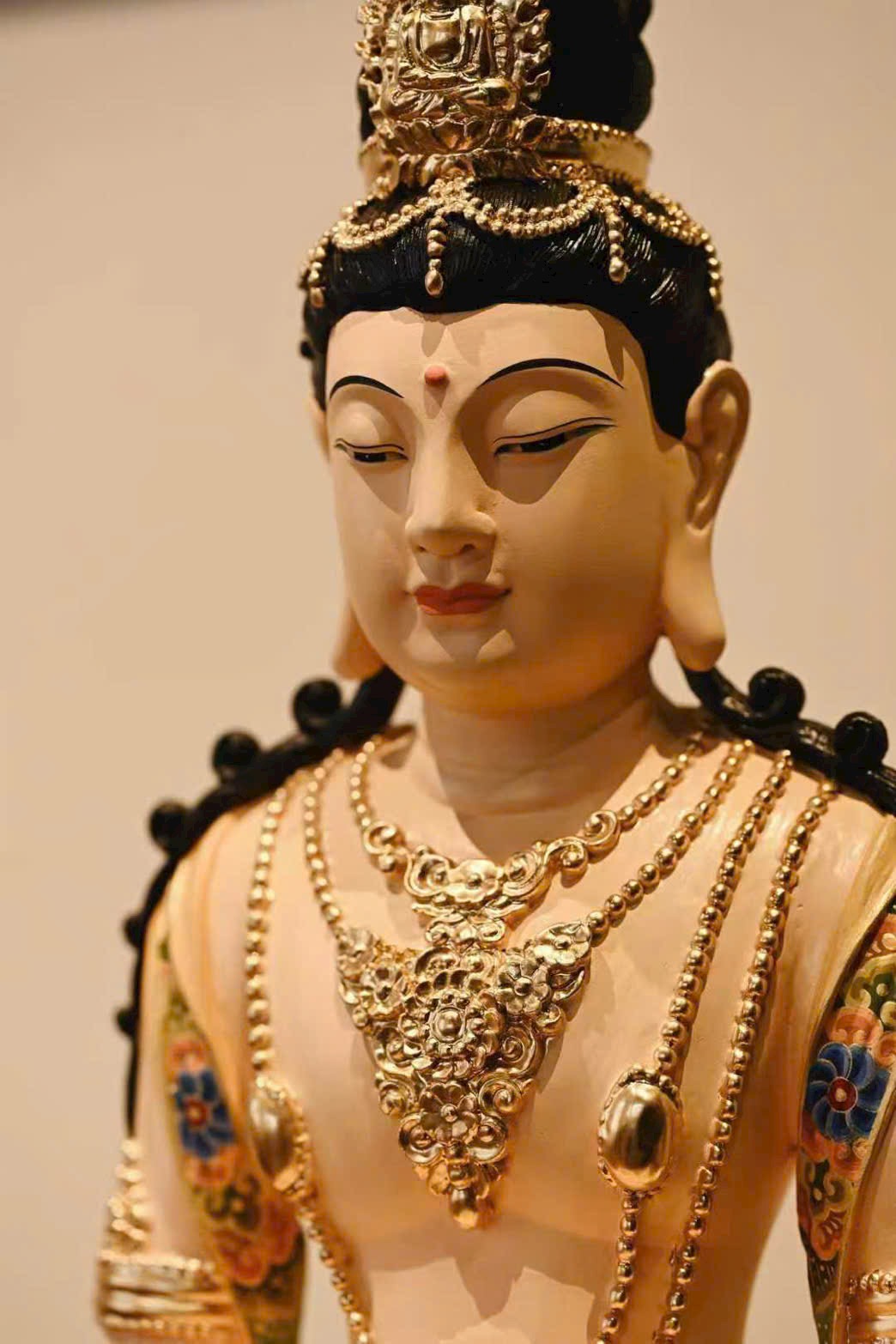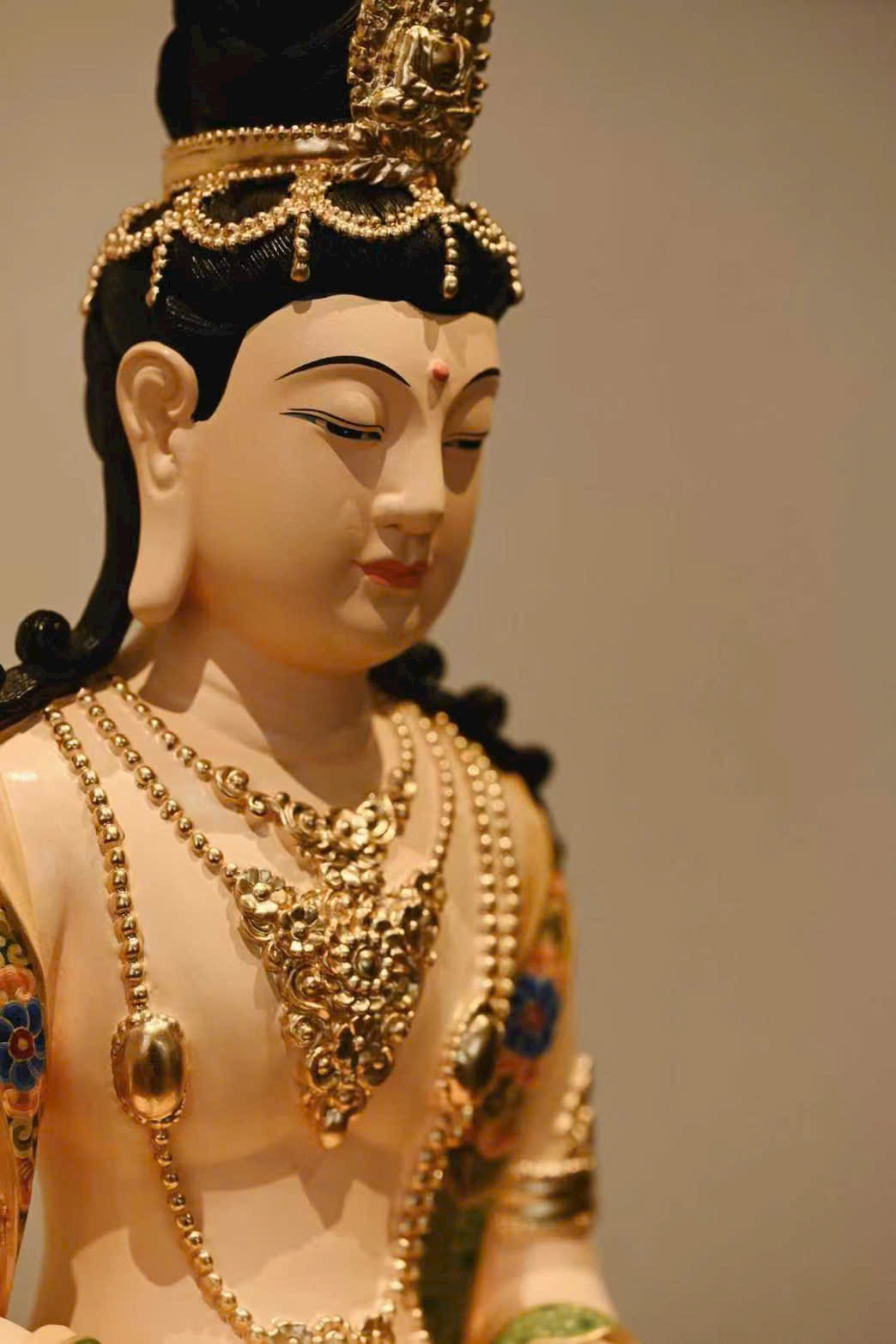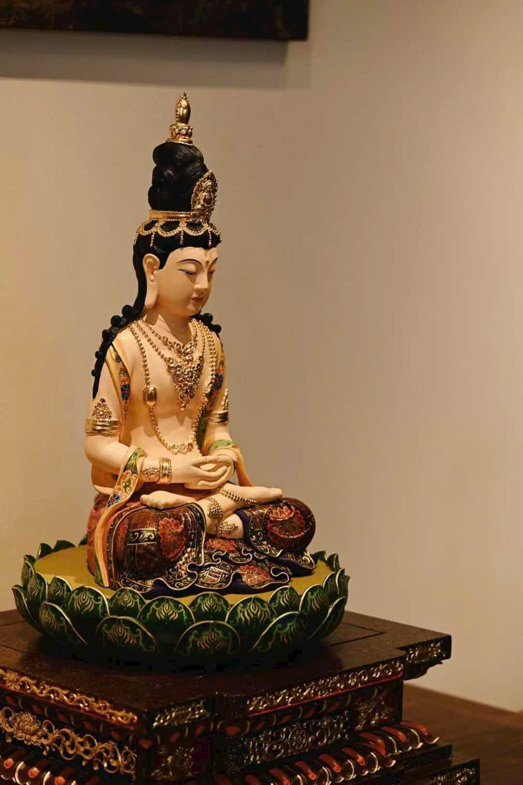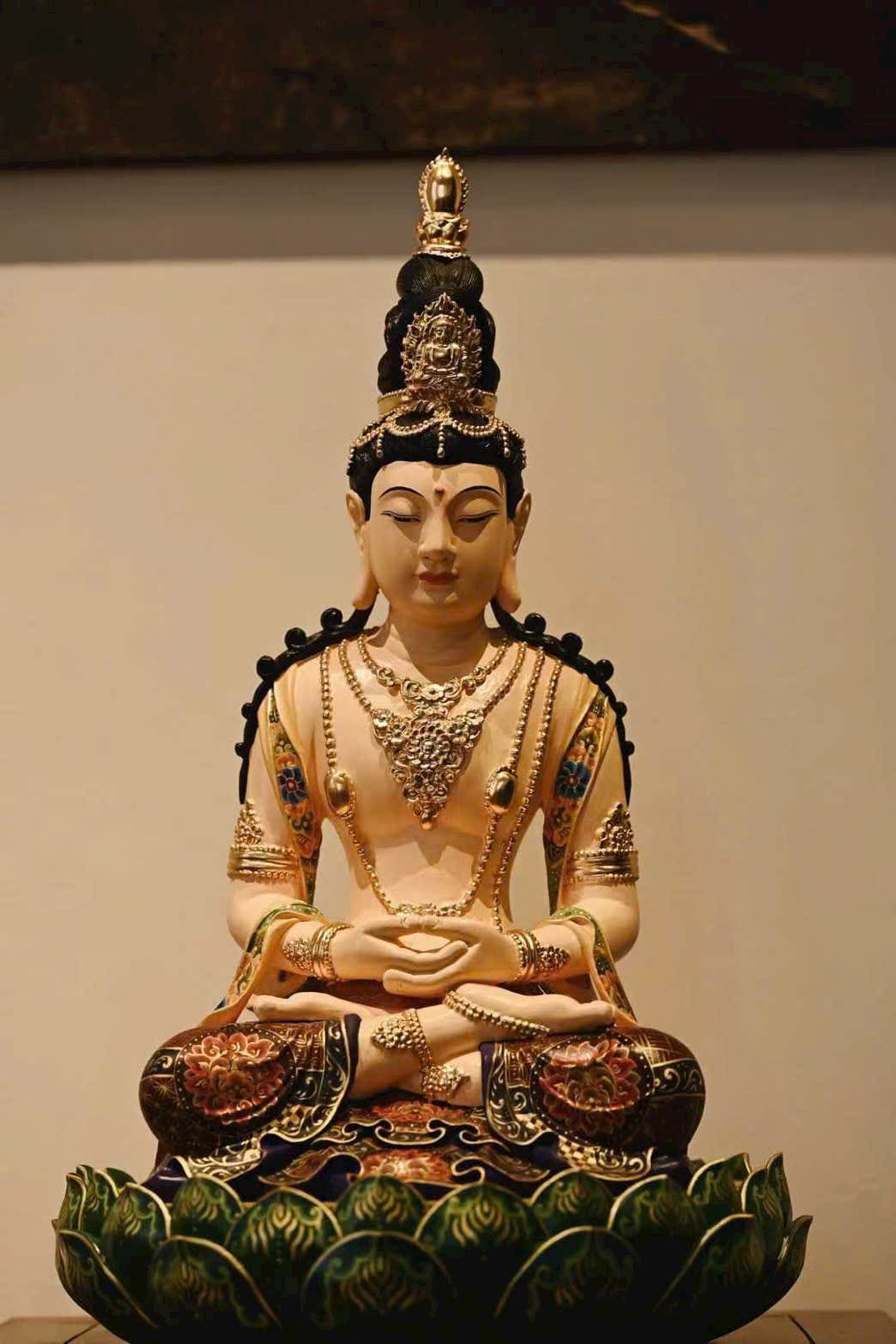 Tượng được chạm khắc sinh động, tỉ mỉ. Vô Lượng Thọ Phật búi tóc cao, đội hoa quan, gương mặt thanh tú, mày cong, mắt khép nhẹ, thần thái trầm tĩnh hiền từ. Dáng tượng trang nhã, thân đeo chuỗi liên châu và vòng trang sức, hai tay kết ấn thiền định, ngồi kiết già trên tòa sen. Lớp tô màu càng làm nổi bật vẻ hoa quý, trang nghiêm và tao nhã.
