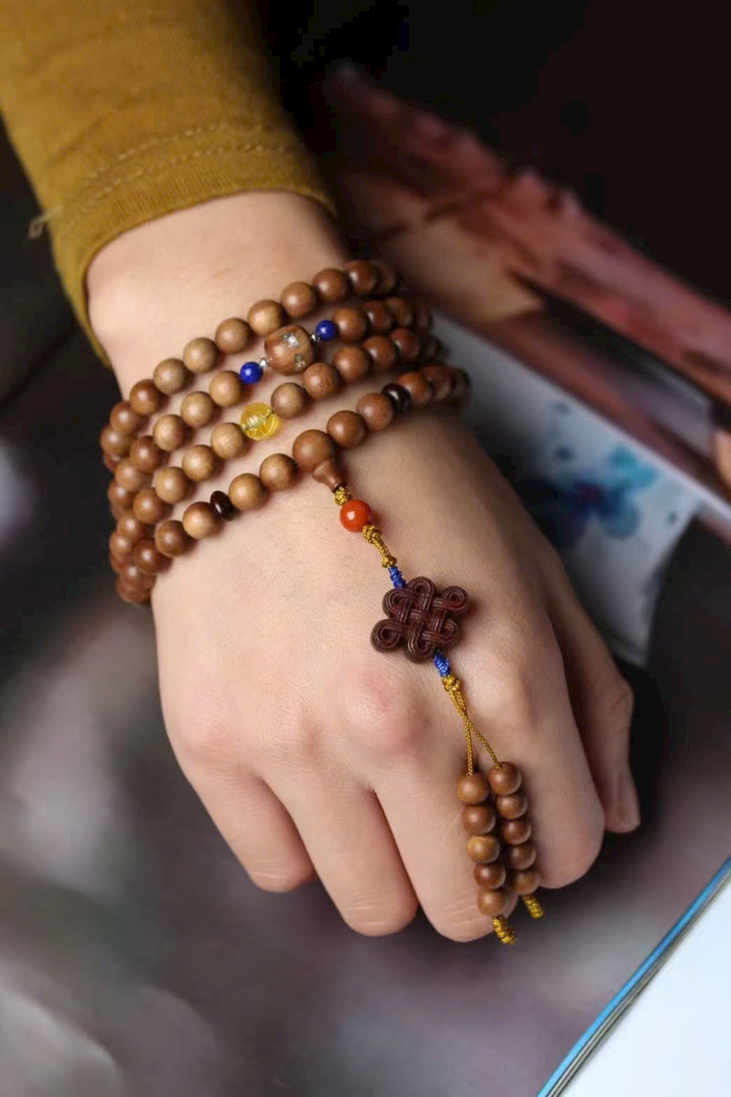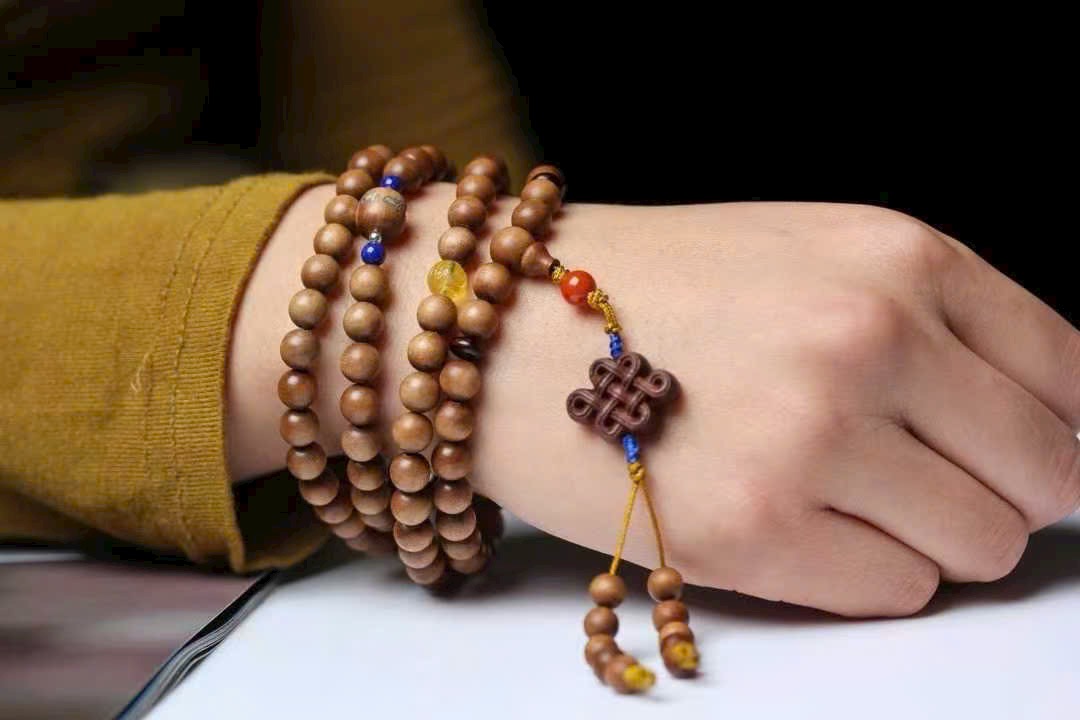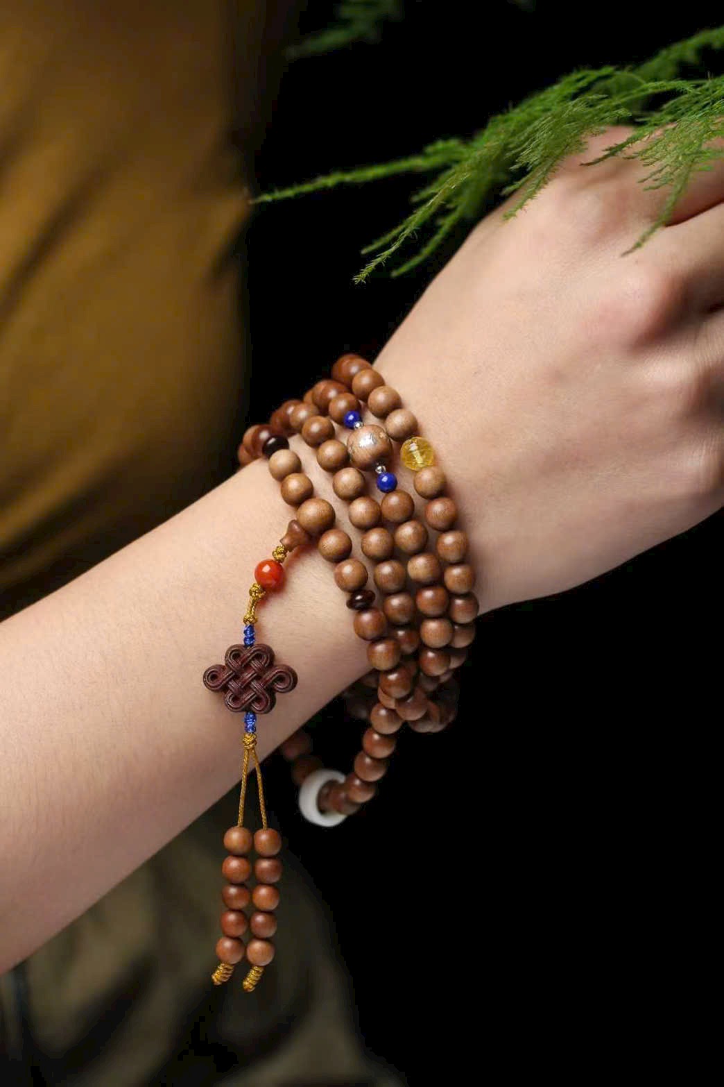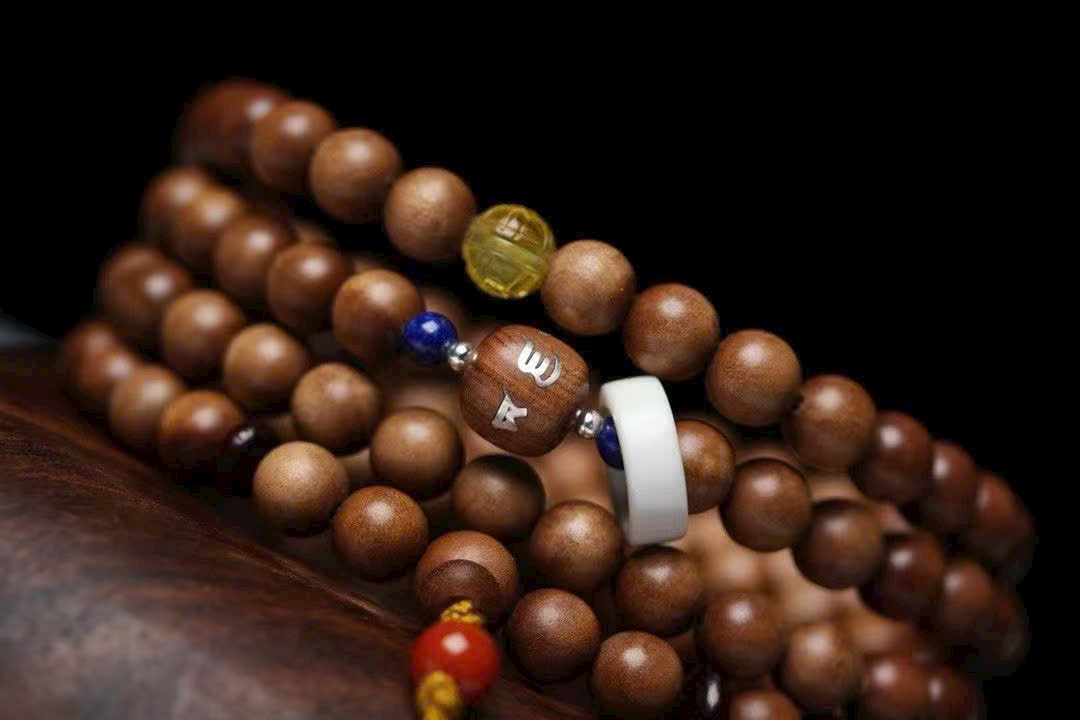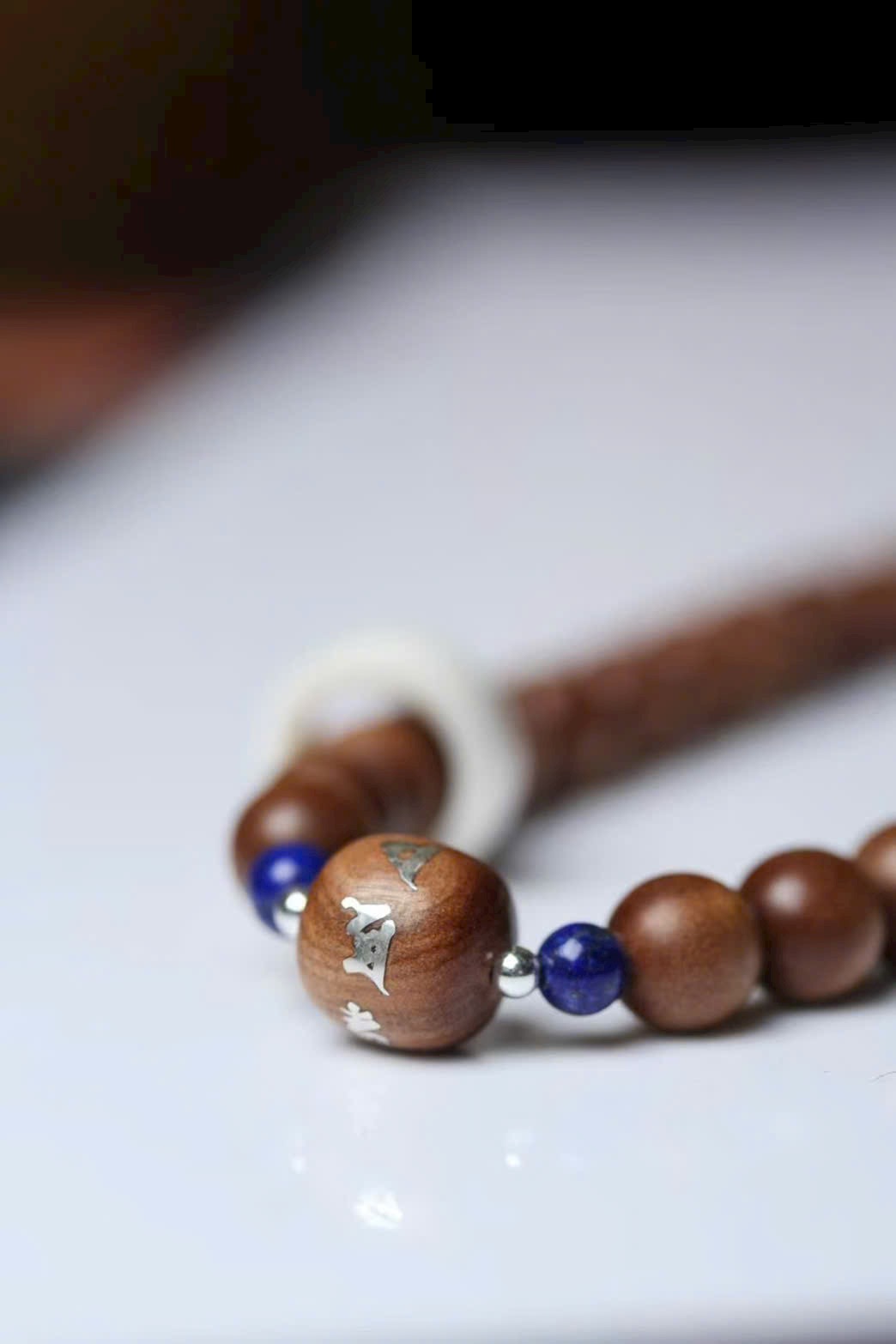 Phối: đàn hương khảm bạc, kết tử đàn, vòng sừng hươu, mật lạp, Nam Hồng, thanh kim thạch.