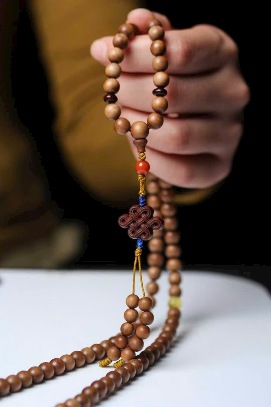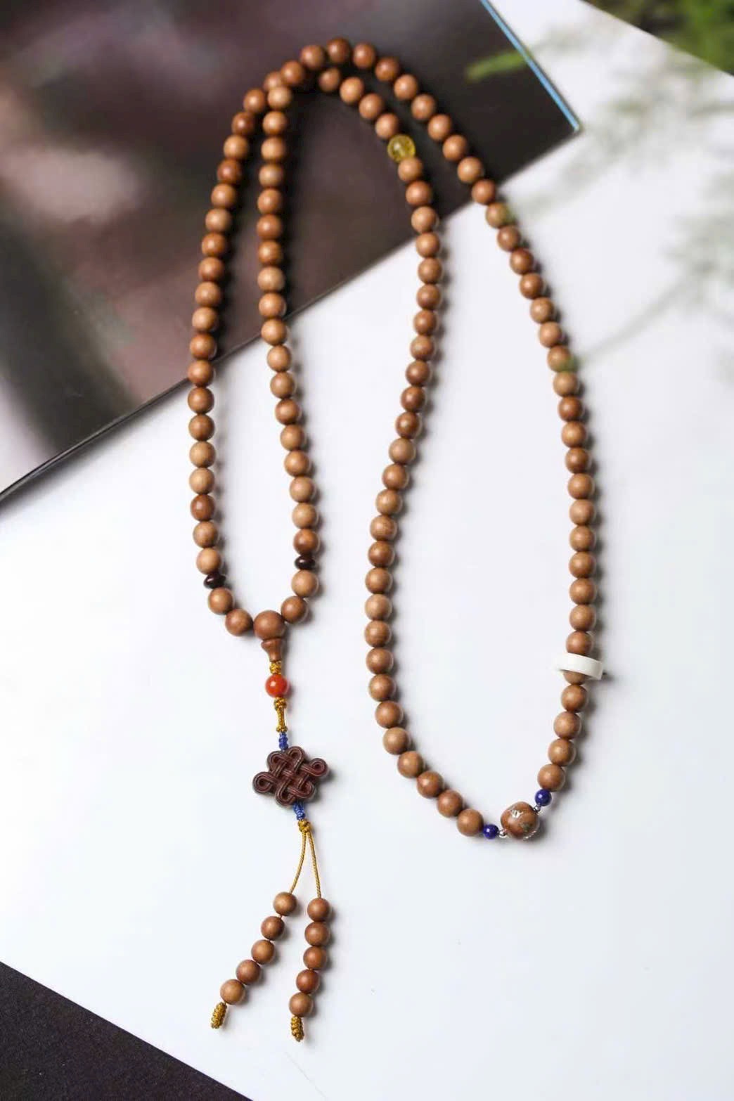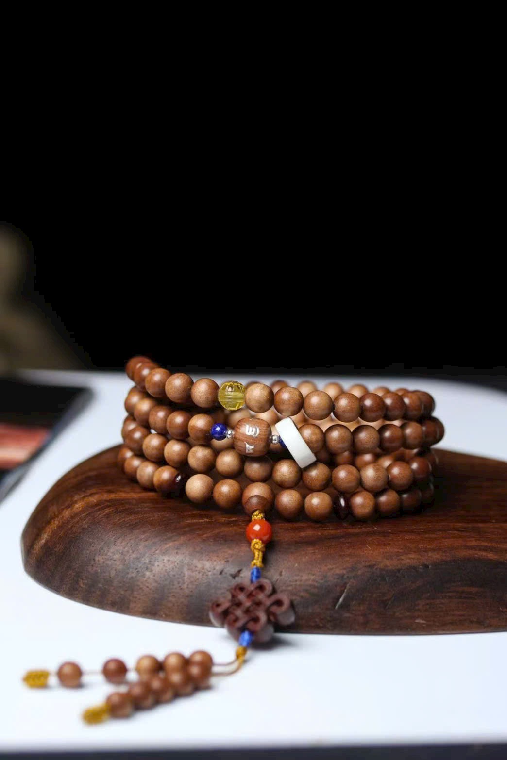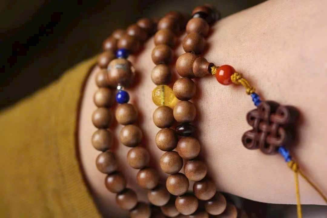 Phối: đàn hương khảm bạc, kết tử đàn, vòng sừng hươu, mật lạp, Nam Hồng, thanh kim thạch.