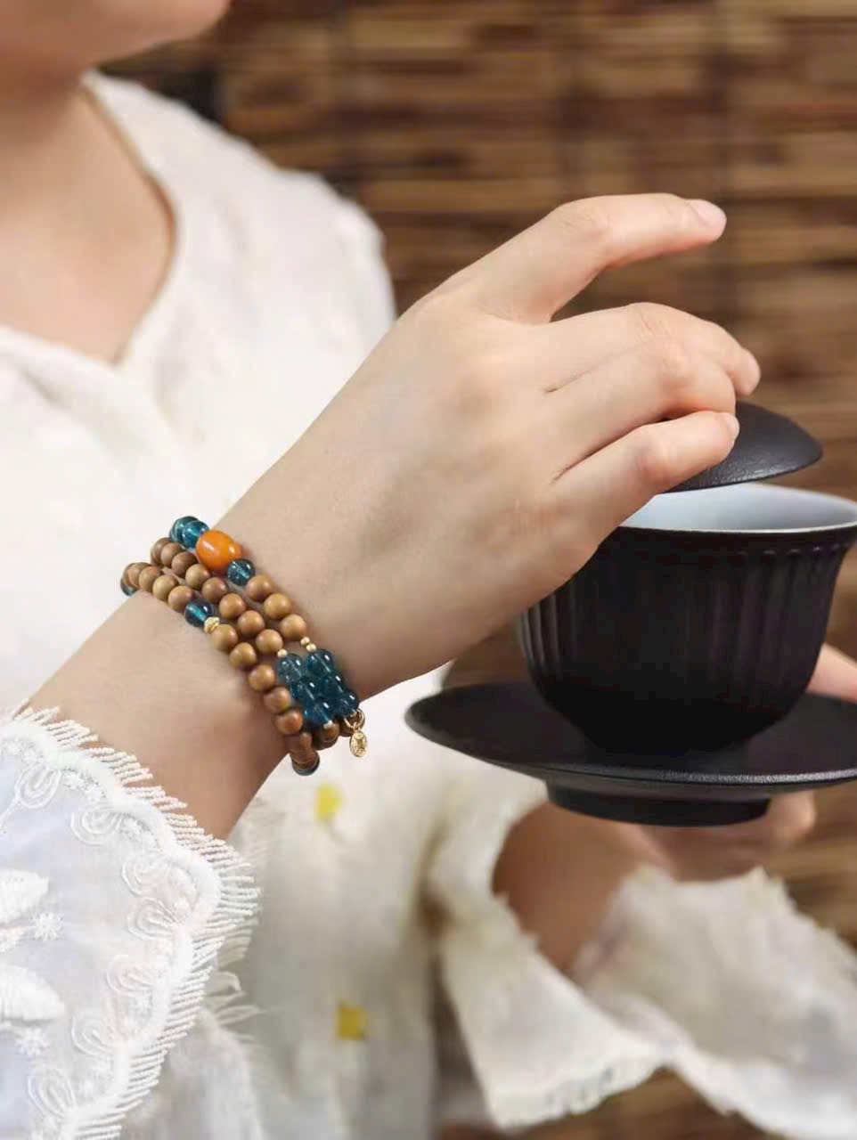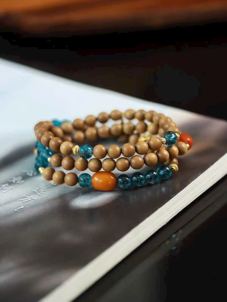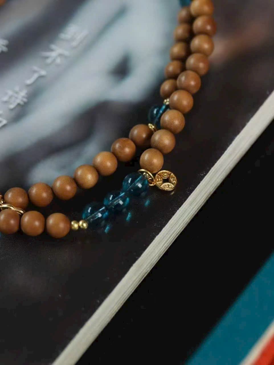 Độ trong veo của pha lê xanh, mang đến cho chuỗi đàn hương trầm mặc một nét không linh, thanh khiết.