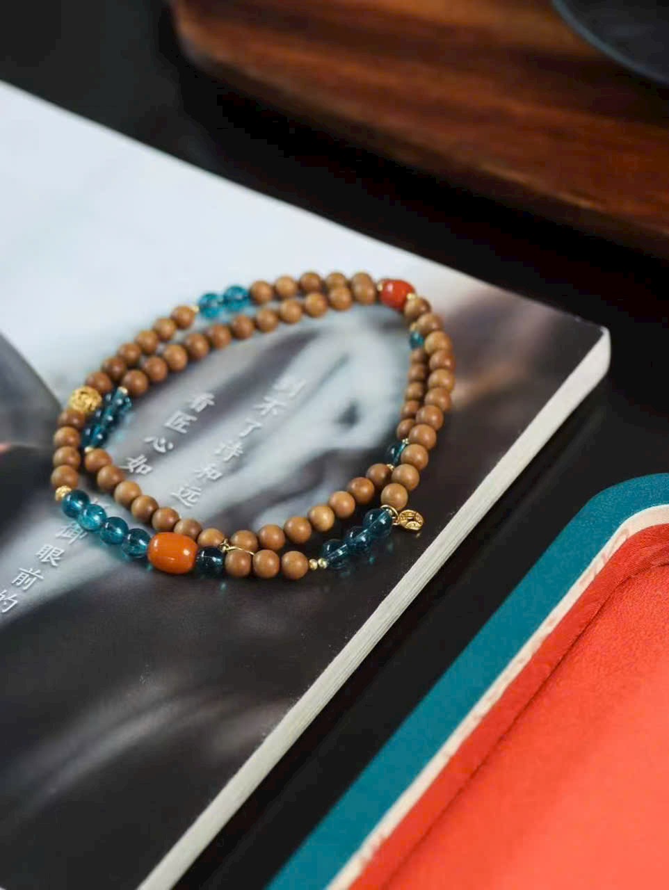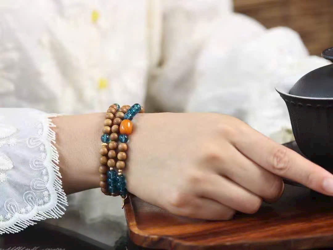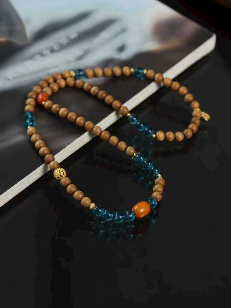 Độ trong veo của pha lê xanh, mang đến cho chuỗi đàn hương trầm mặc một nét không linh, thanh khiết.