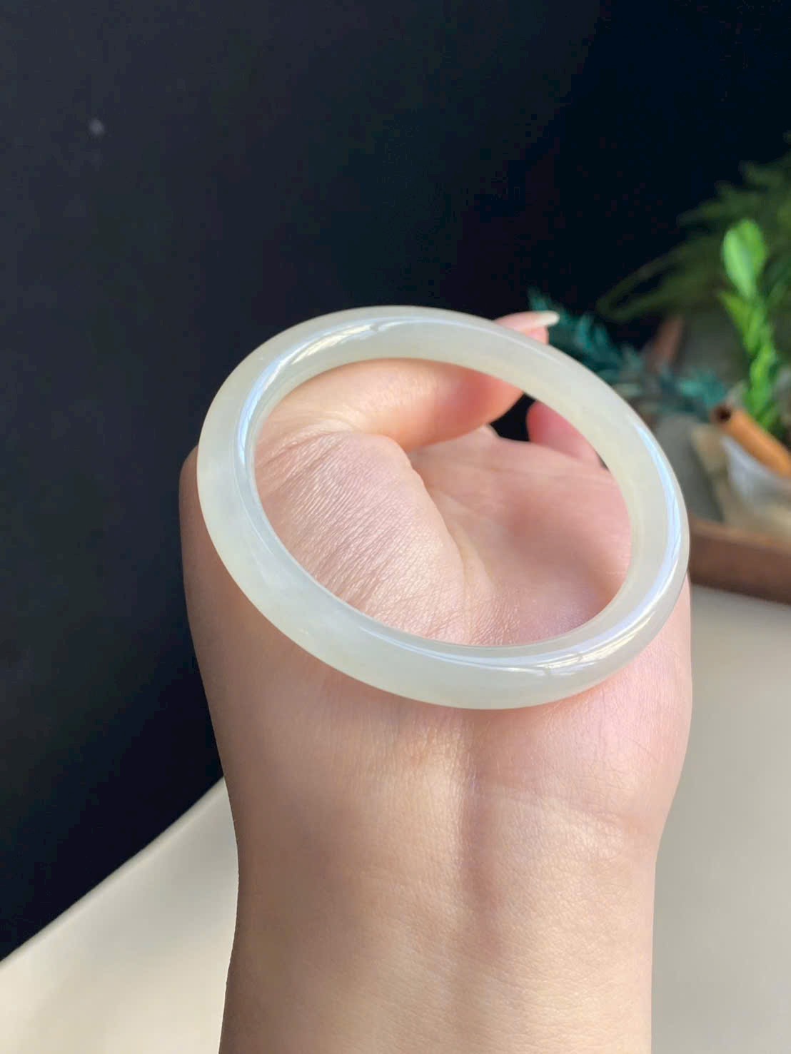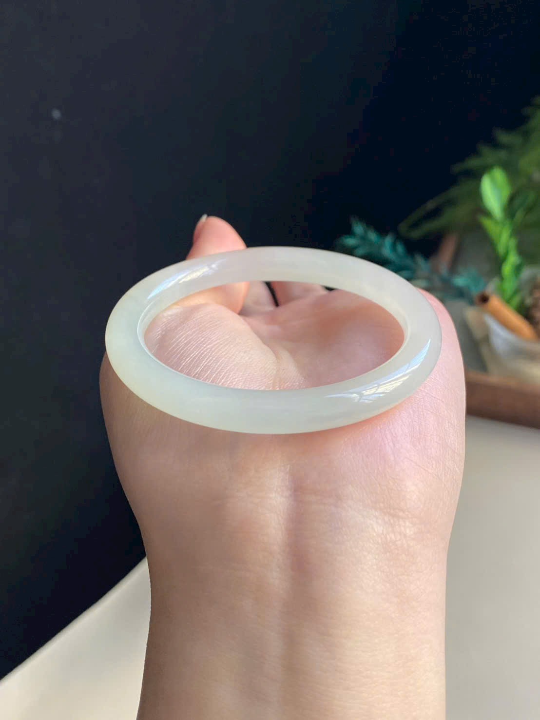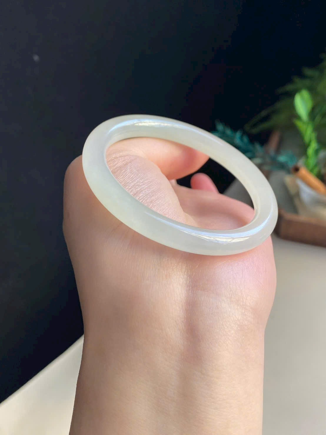 Vòng tay ngọc Hòa Điền – liệu Thanh Hải, dáng mỹ nhân điều, sắc trắng ánh thanh, màu sắc tươi sáng, nhã nhặn. Chất ngọc mịn mượt, trong nước, phong vị thanh thoát tinh tế. Không nứt rạn, có đường nước nhưng không rõ, tổng thể đẹp, dễ đeo và giàu giá trị thưởng ngọc.