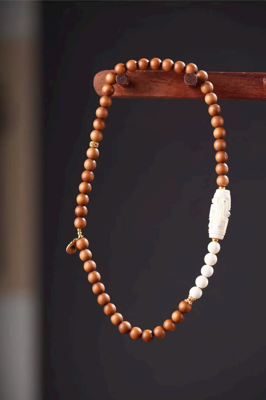 Tác phẩm được kết hợp từ 45 hạt đàn hương Lão Sơn 0.6 cùng n.gà voi ma mút khắc thiên châu (kích thước khoảng 2.4 × 1.1 × 1.1 cm), xen kẽ hạt ngà voi ma mút 0.6 và mặt treo mây lành bạc mạ vàng.
