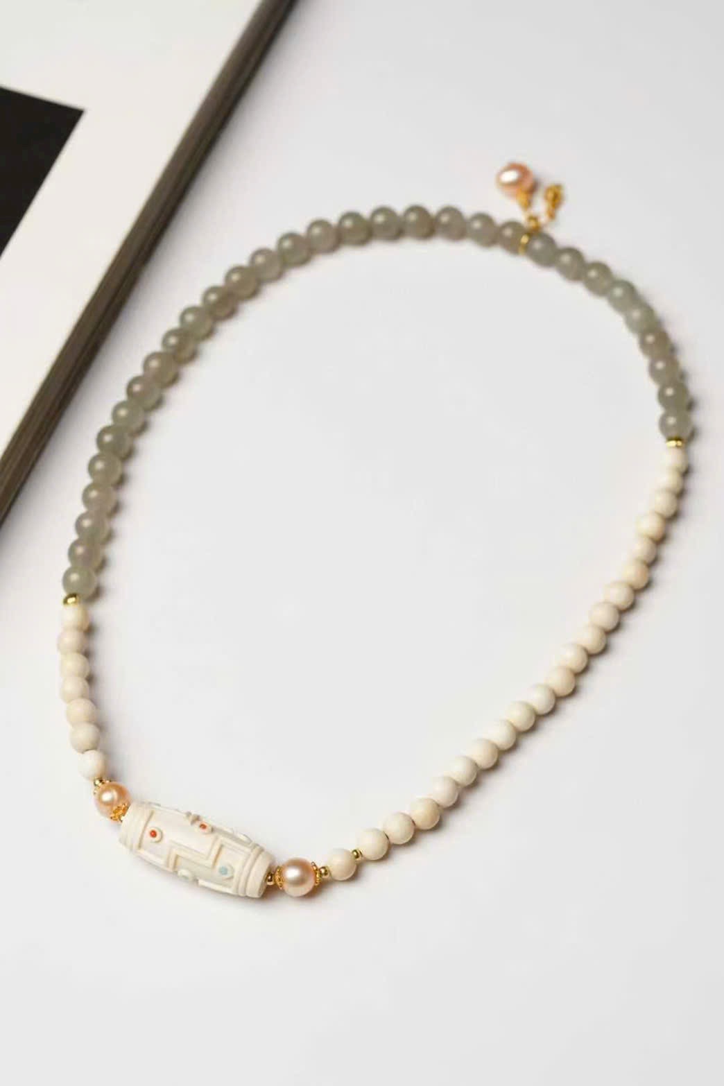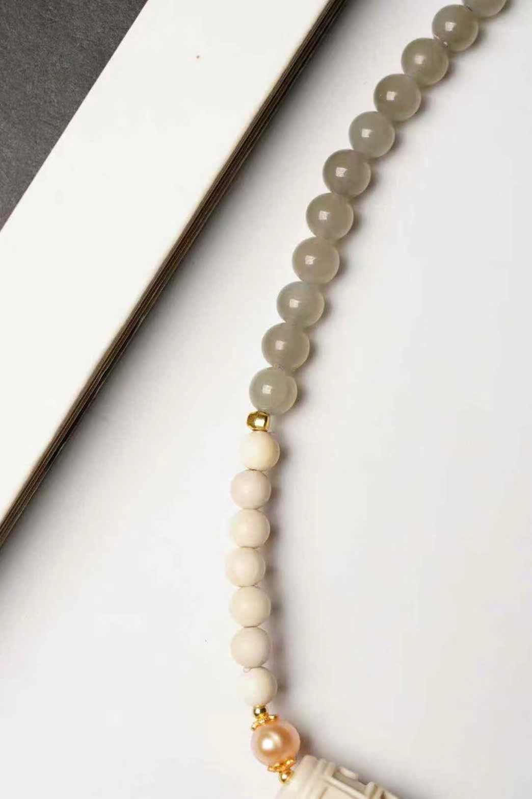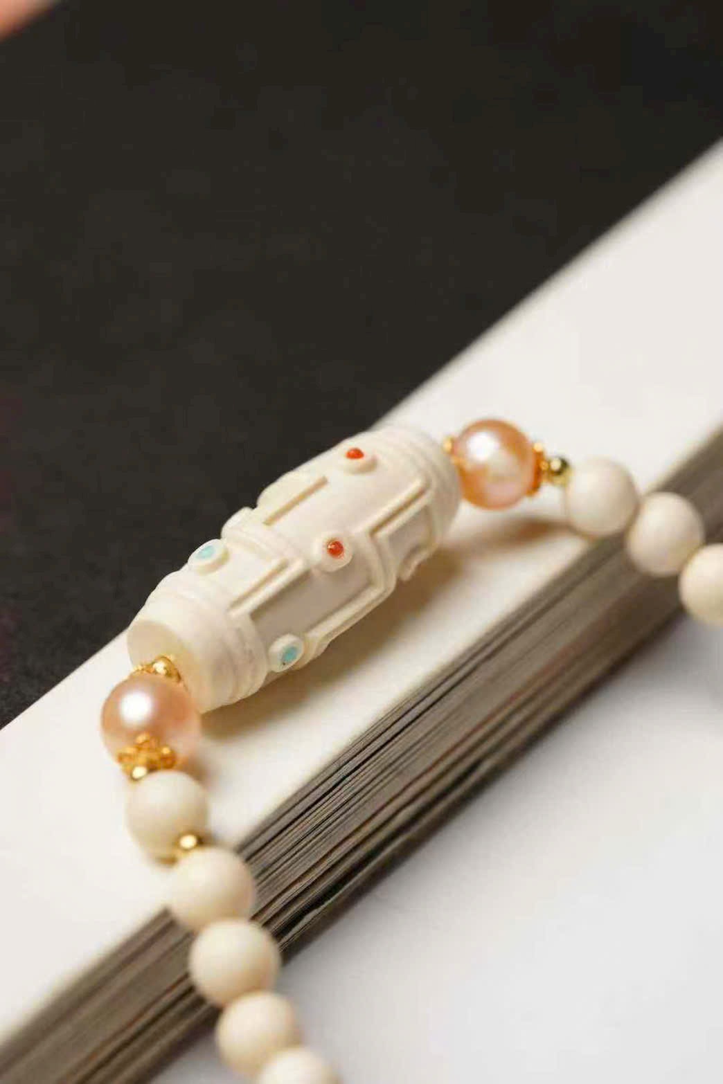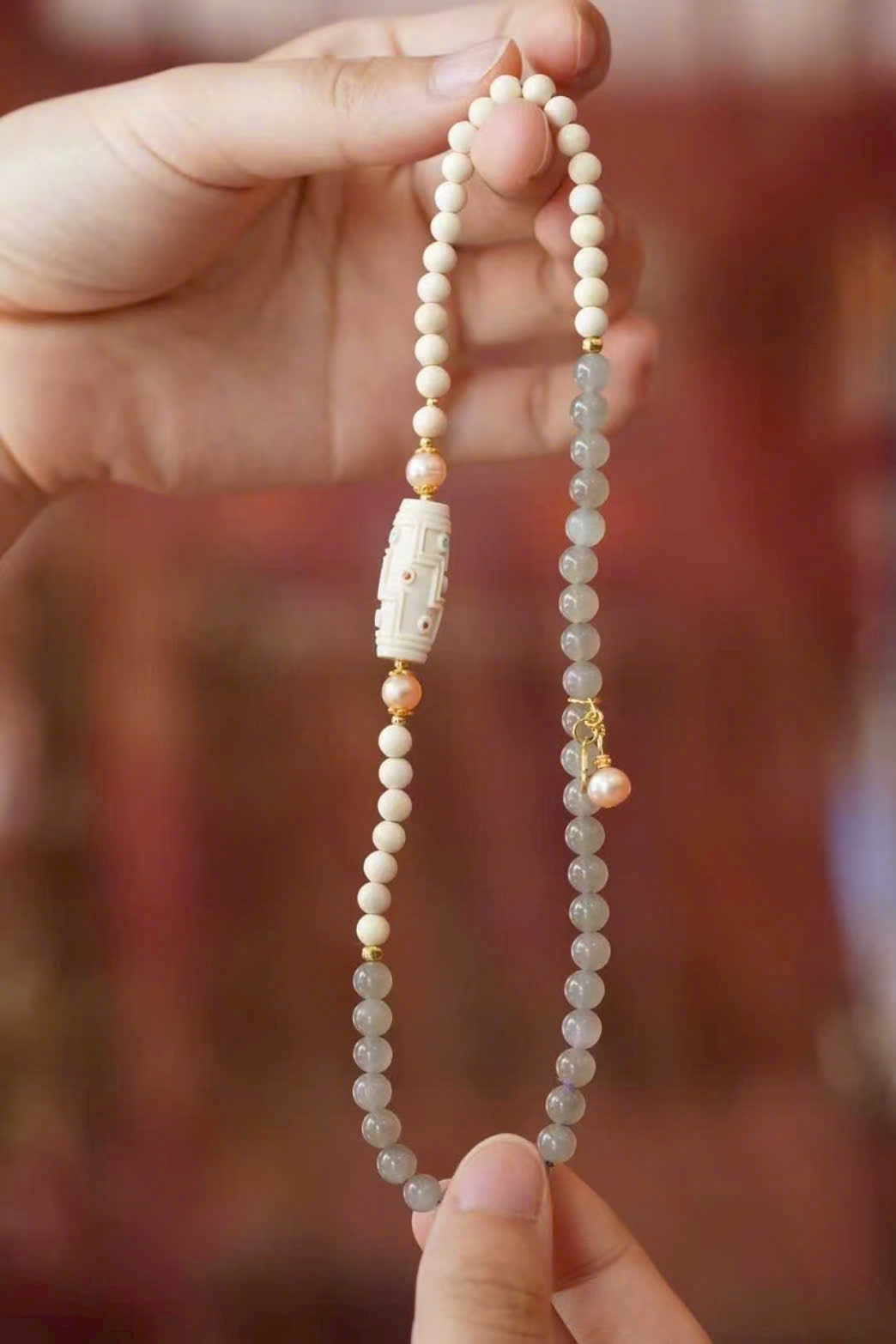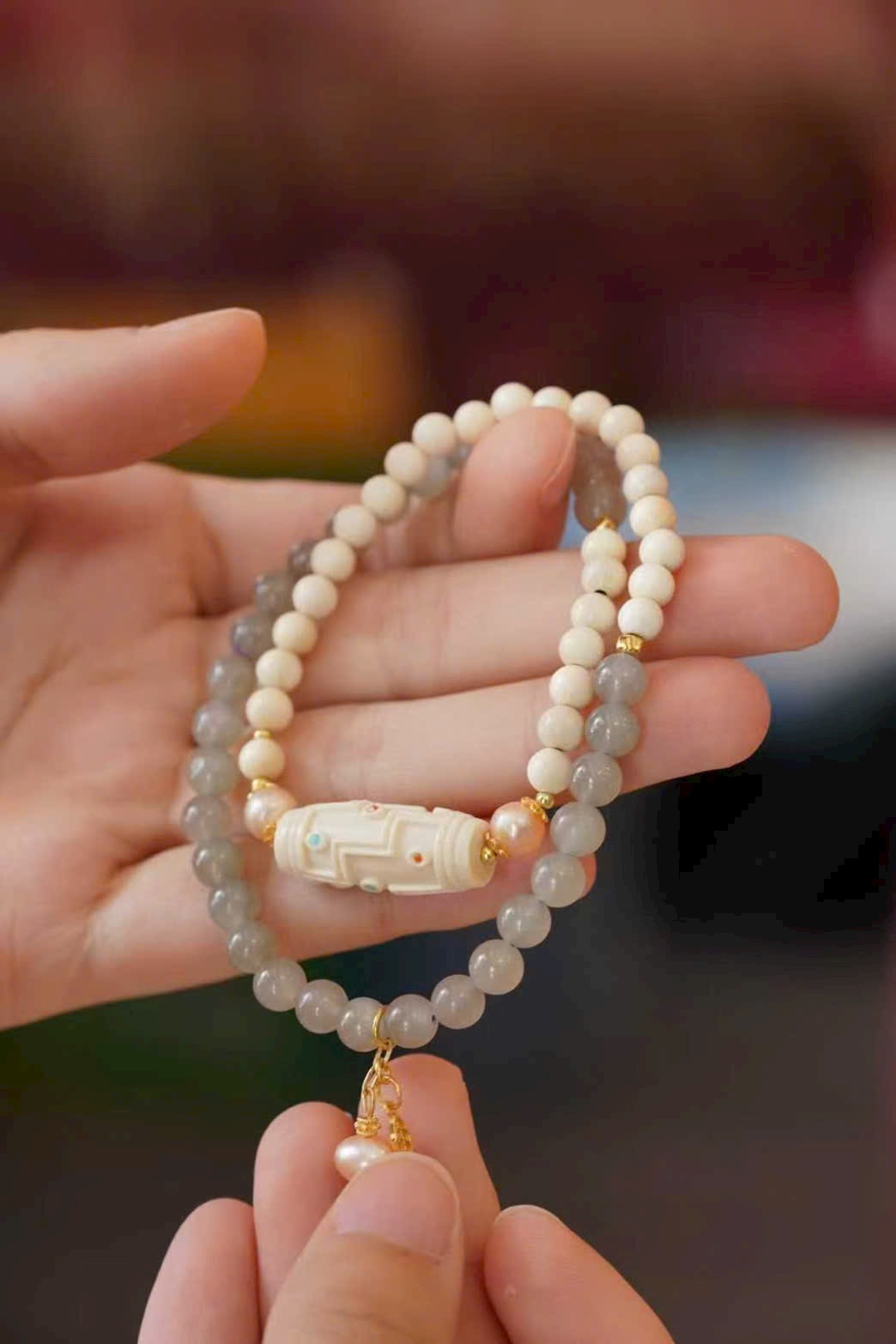 🌿 Vòng tay hai vòng thiết kế kiểu hạt thiên châu bằng n.gà voi ma mút – phối hợp: ngọc trai, thạch anh tím khói, phụ kiện bạc mạ vàng… tinh xảo, đẹp mắt.