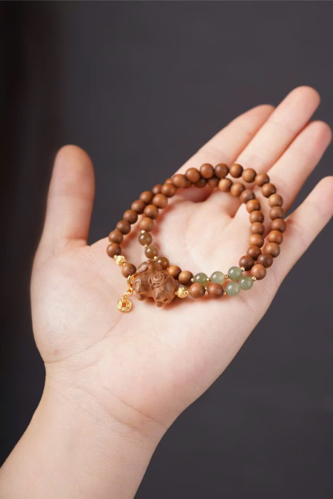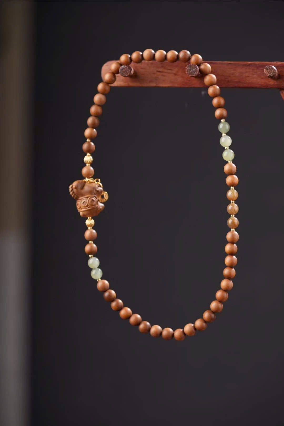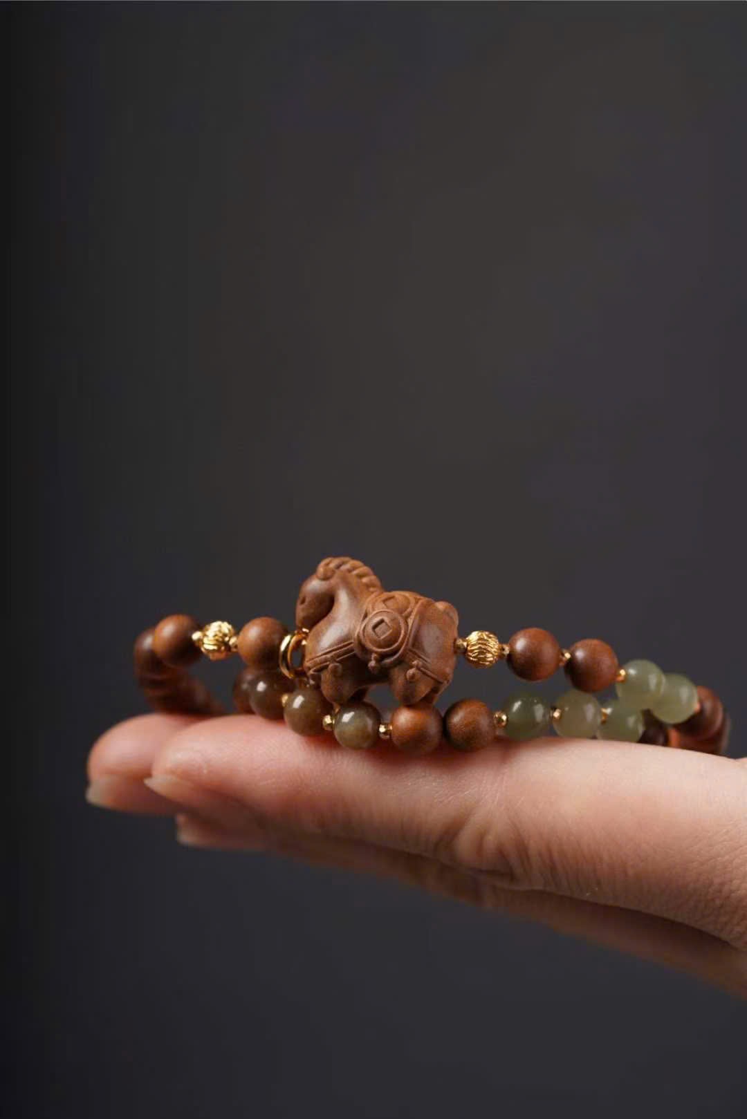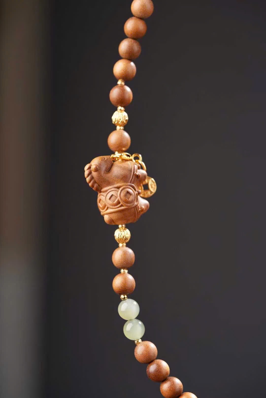 Phối charm “Mã thượng hữu tiền”, ngọc Hòa Điền, Hòa Điền đường liệu và charm mạ vàng “Nhật tiến đấu kim”.