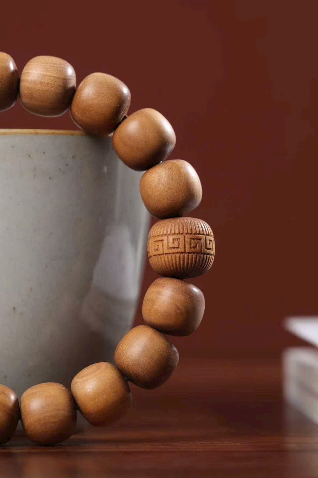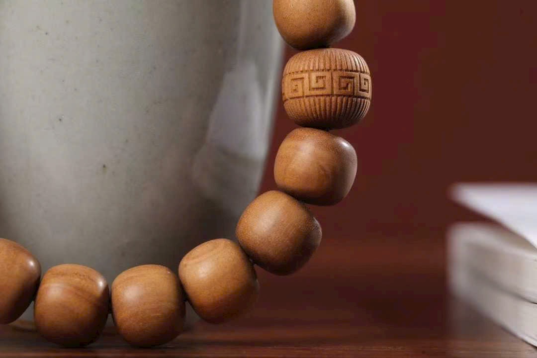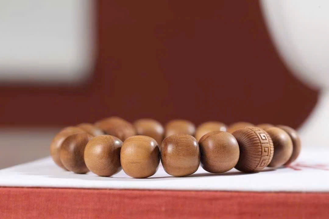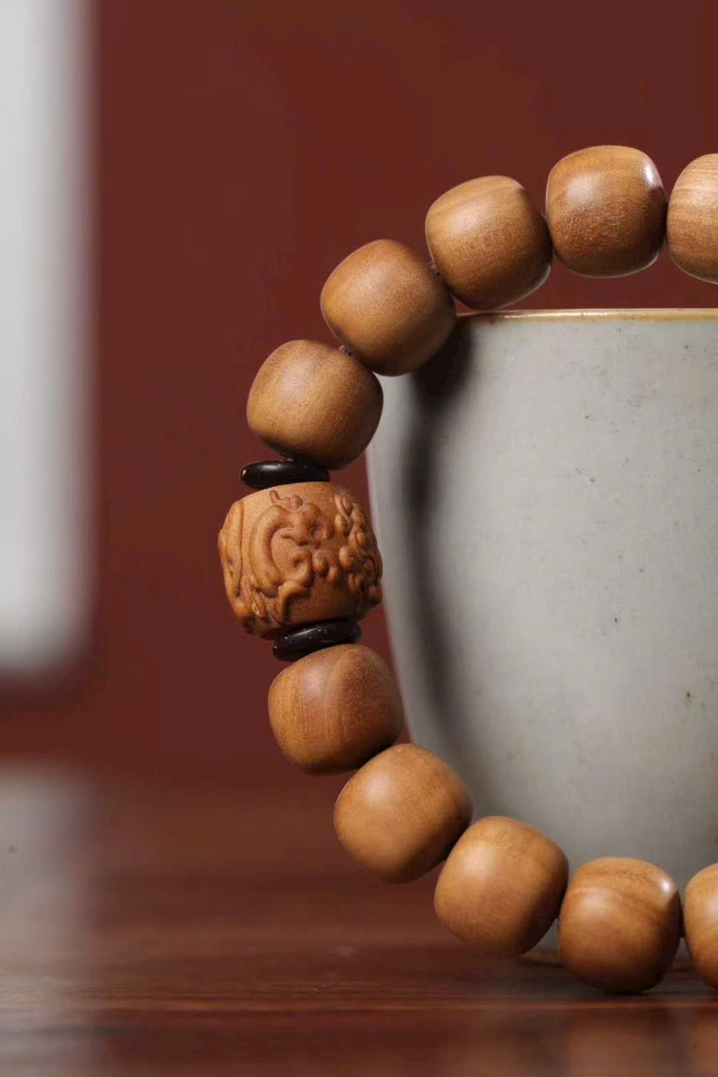 Vòng tay gồm 16 hạt trụ Lão Sơn Đàn Hương 11x12, 1 hạt “Bảo Hộ Tứ Đại Thần Thú” (1.5/1.3cm), và 1 hạt “Cát Tường Hồi Văn” (12x13mm).