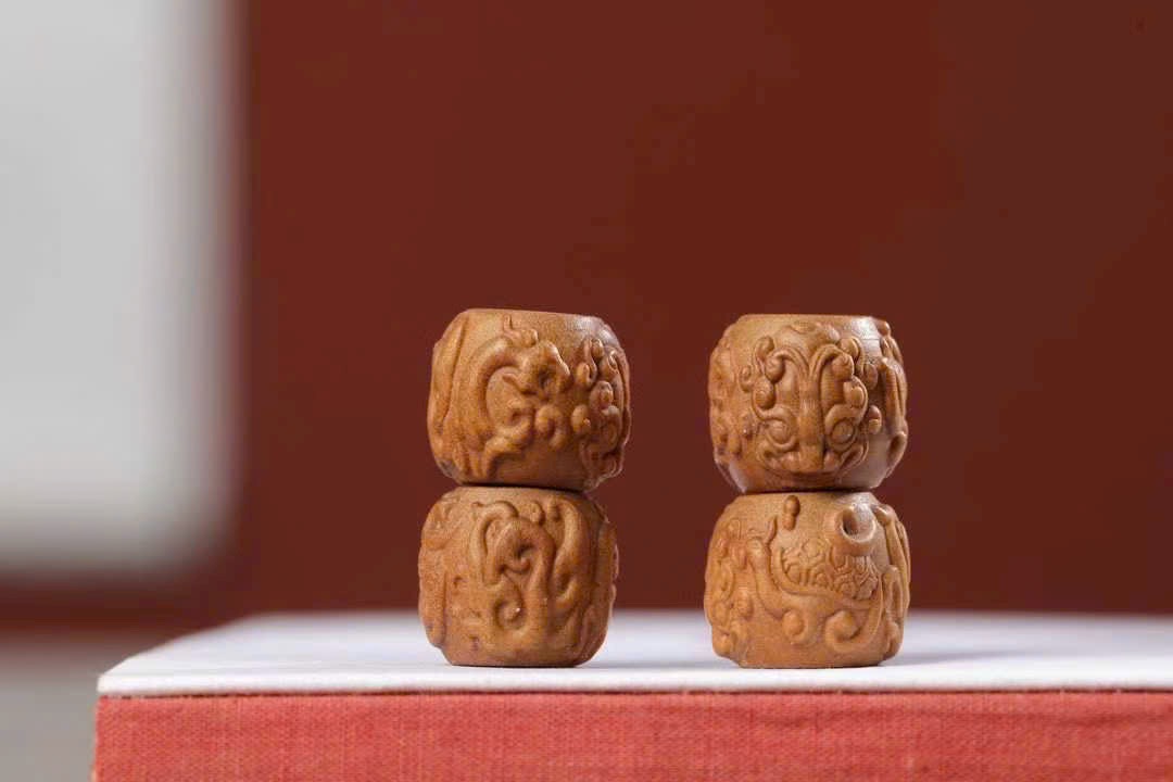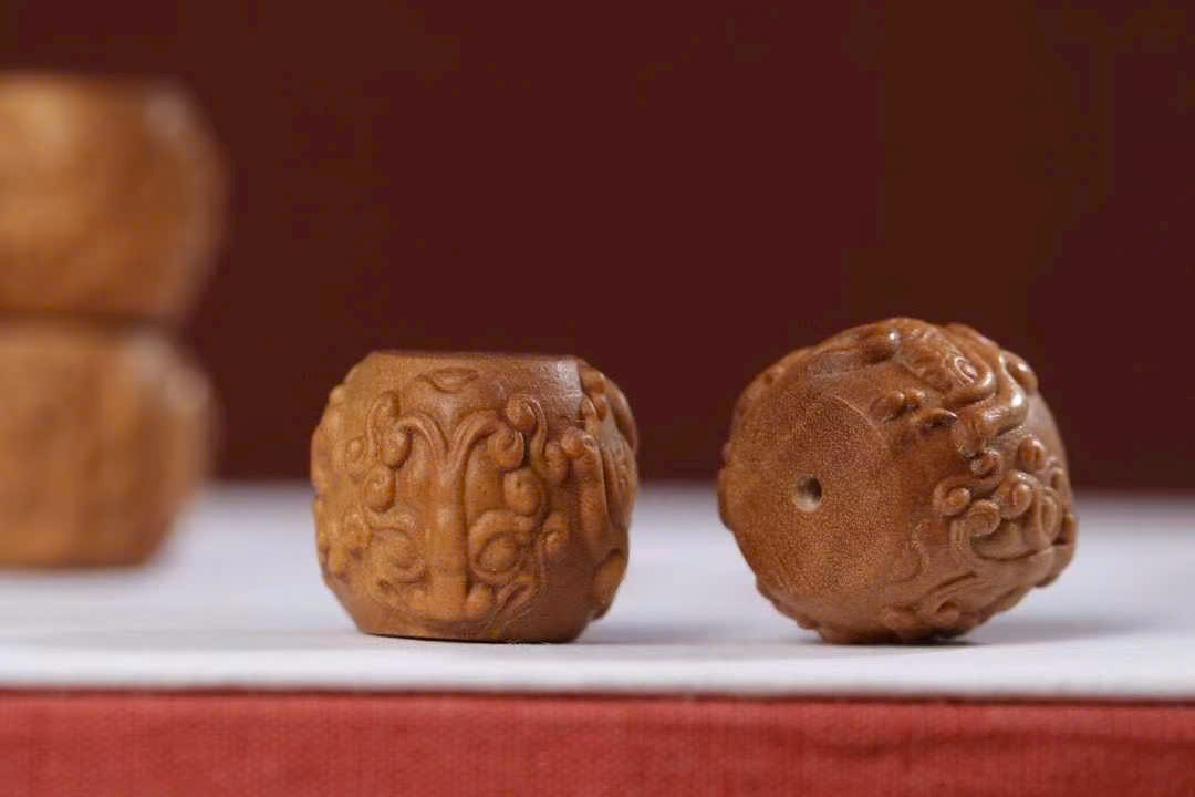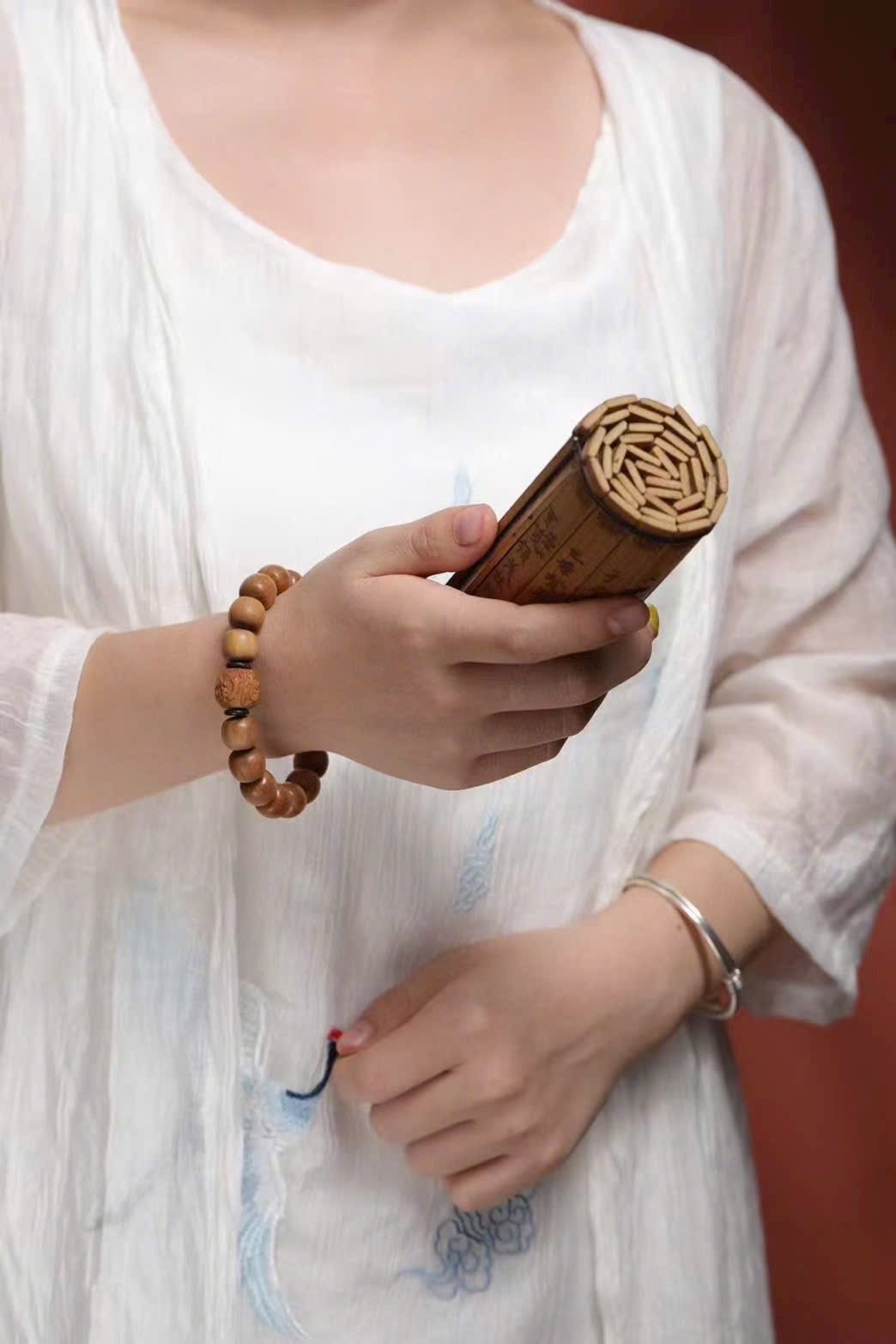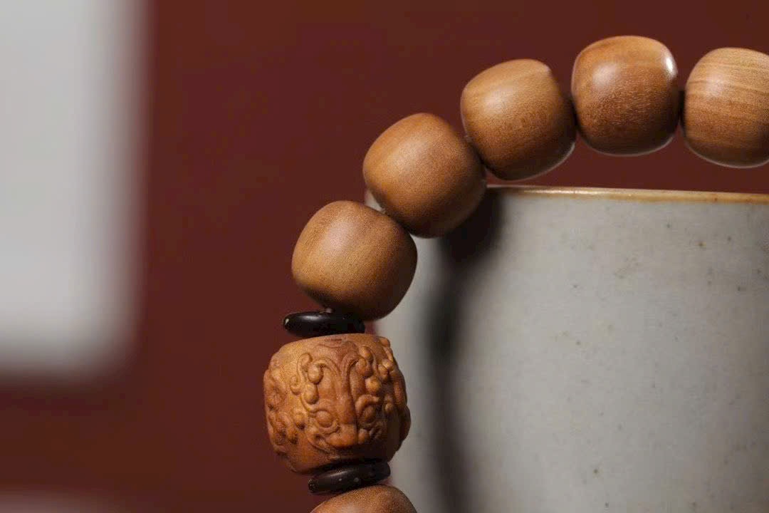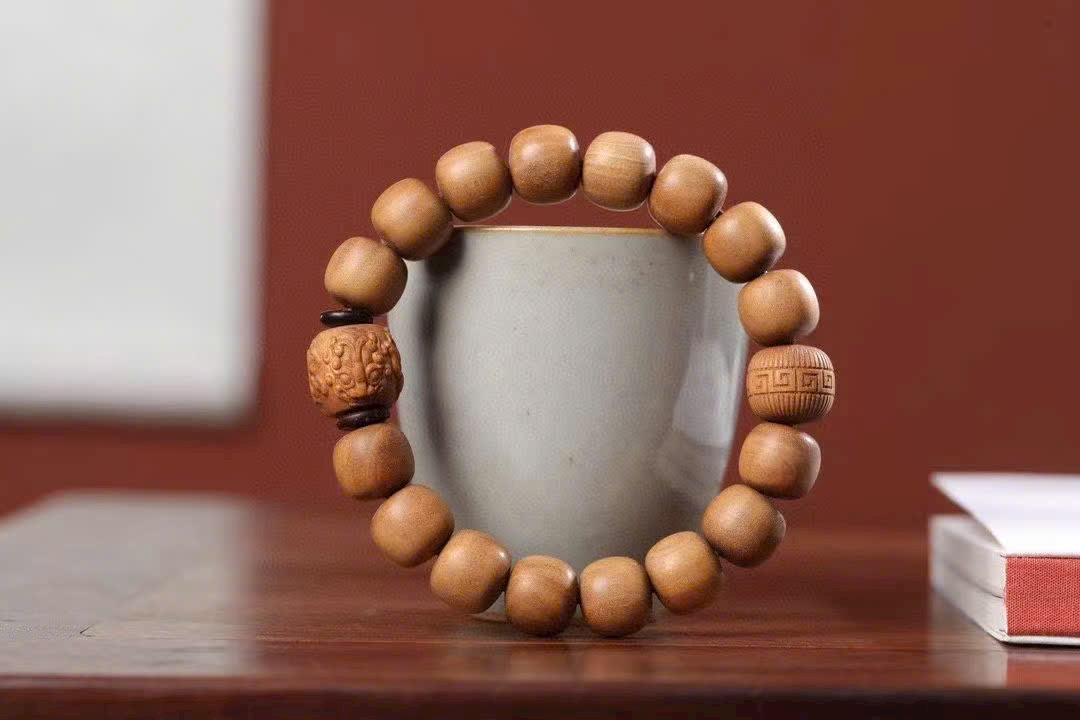 Vòng tay gồm 16 hạt trụ Lão Sơn Đàn Hương 11x12, 1 hạt “Bảo Hộ Tứ Đại Thần Thú” (1.5/1.3cm), và 1 hạt “Cát Tường Hồi Văn” (12x13mm).
