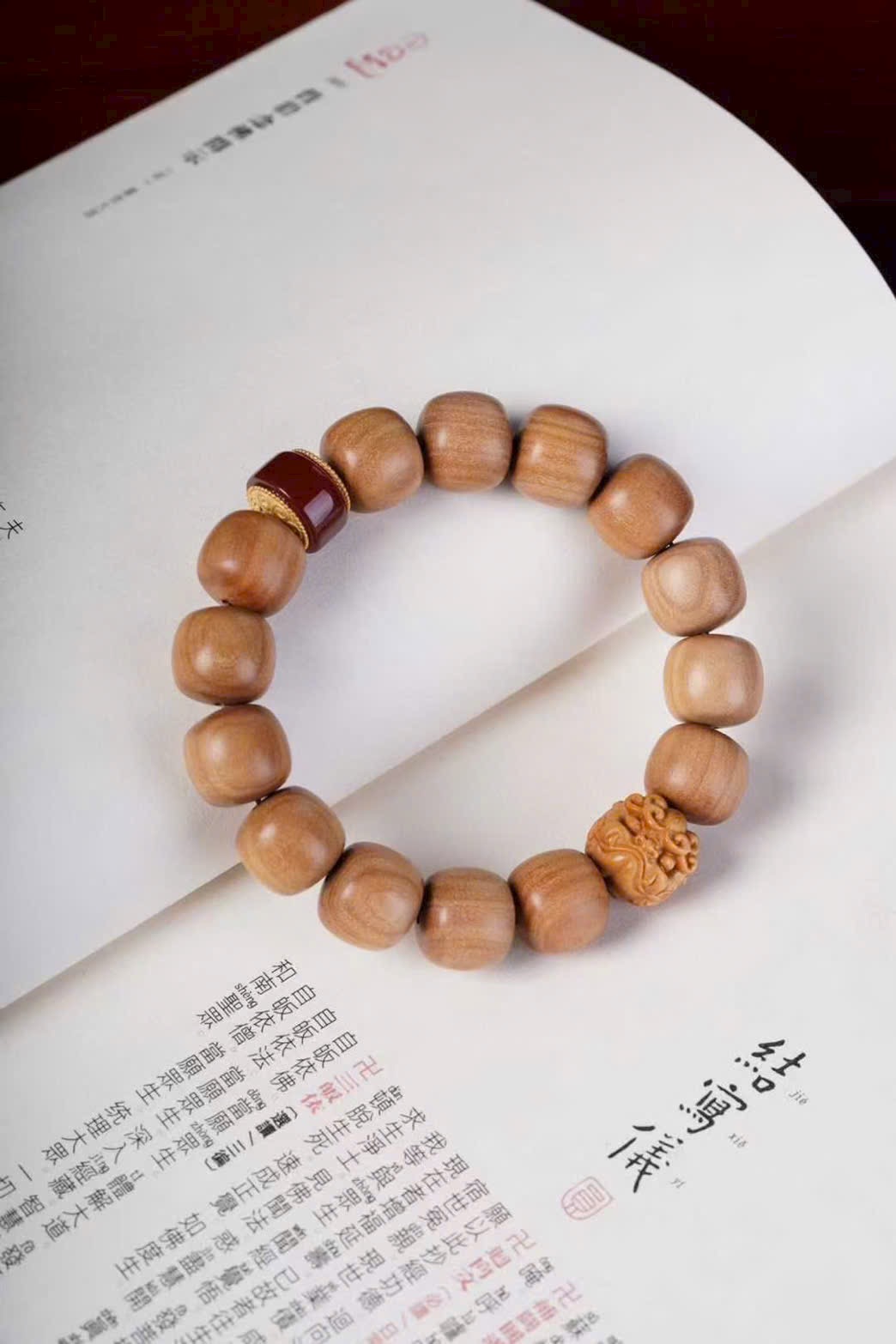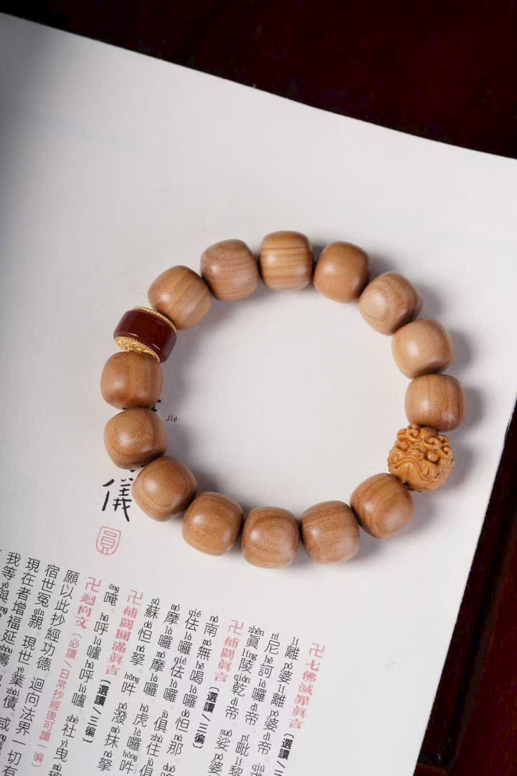 Vòng tay gồm 14 hạt trụ Lão Sơn Đàn Hương 13/14, Tì Hưu Lão Sơn Đàn Hương 1.5cm, và hạt Mã Não tự nhiên.