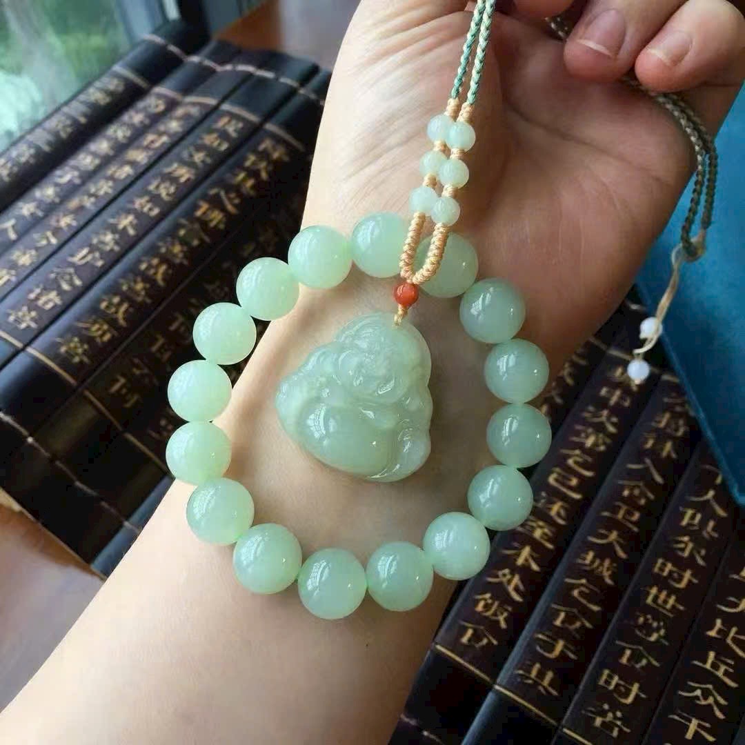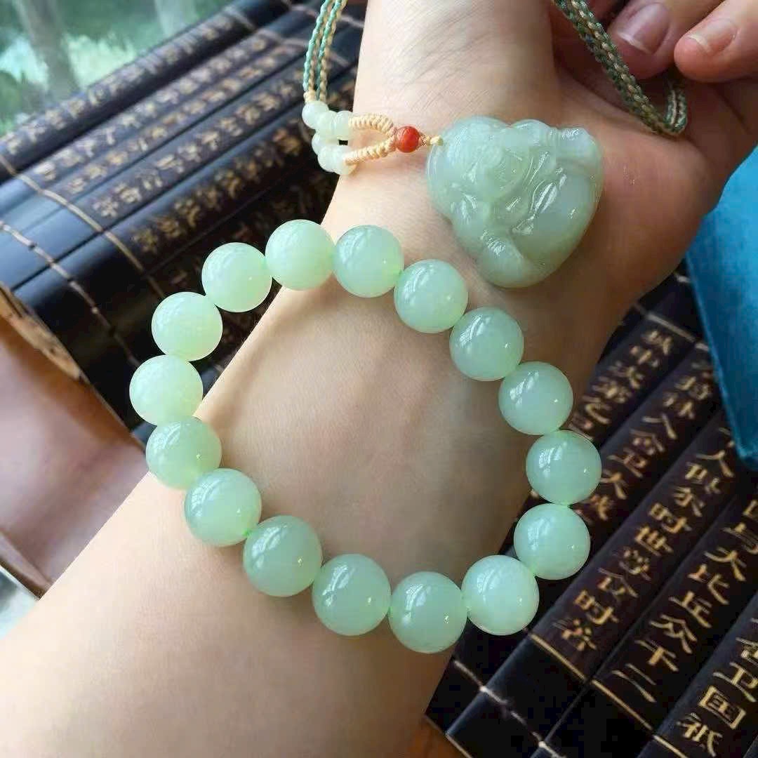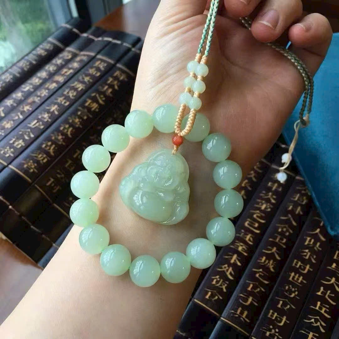 Bộ đôi gồm vòng tay ngọc Hòa Điền chất thanh thủy hạt 12mm và mặt dây chuyền Phật ngọc Hòa Điền. Chất ngọc mịn, đeo lên tay toát vẻ cao quý, tao nhã.