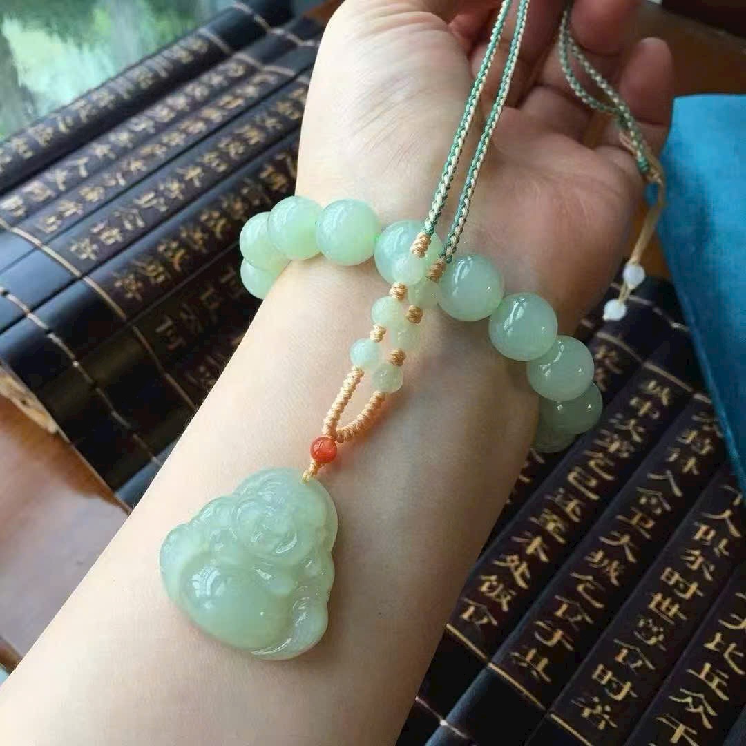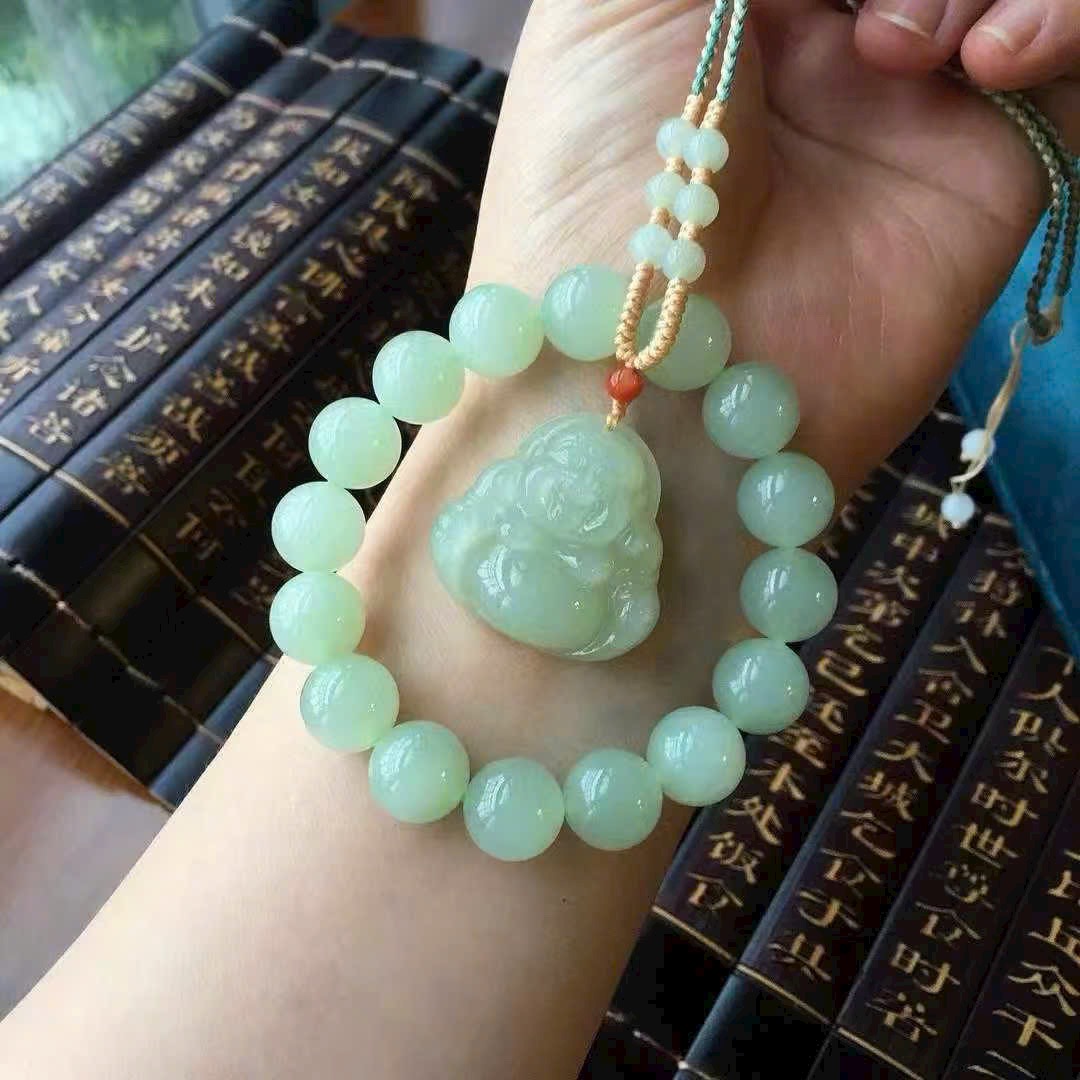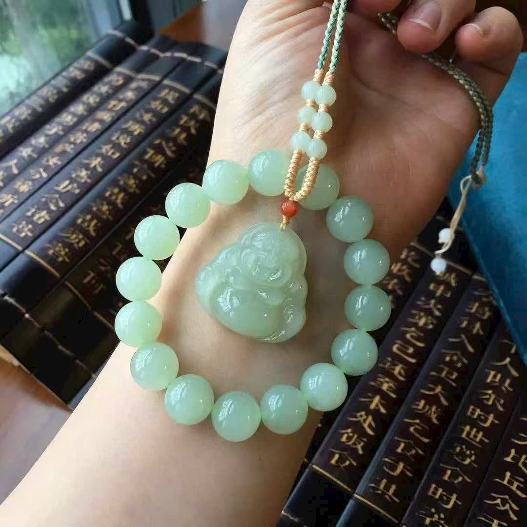 Bộ đôi gồm vòng tay ngọc Hòa Điền chất thanh thủy hạt 12mm và mặt dây chuyền Phật ngọc Hòa Điền. Chất ngọc mịn, đeo lên tay toát vẻ cao quý, tao nhã.