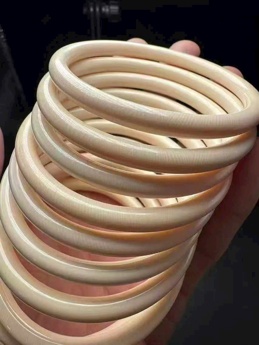 Tuyển chọn ng.à ma mút chất trong mịn như thạch, chất sáng trong, nước ng.à ấm mượt và bóng mịn. Vân ngà dày đặc, lan đều tự nhiên — hiếm gặp trong ngà ma mút thượng phẩm. Được mài thủ công tinh tế, dáng tròn thanh thoát, khi đeo tôn lên vẻ trang nhã, thanh lịch và sang trọng.