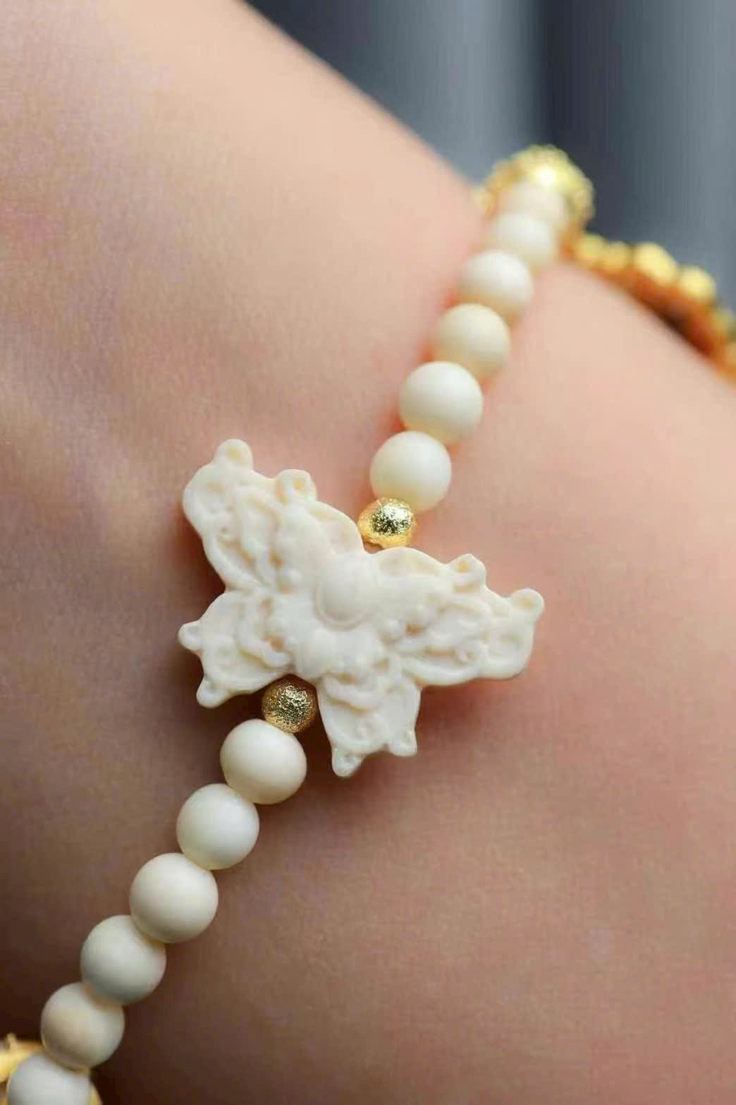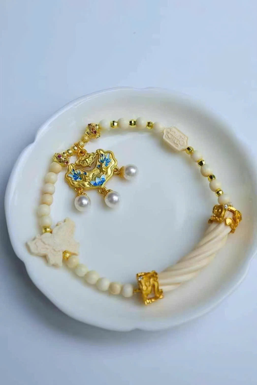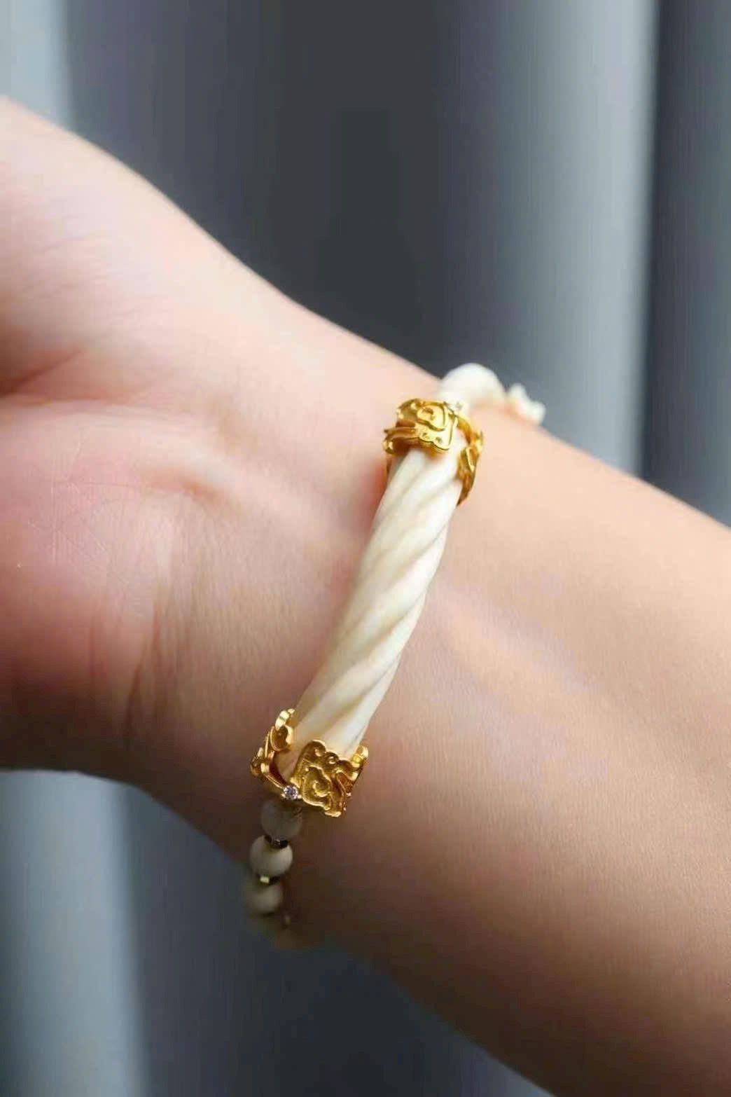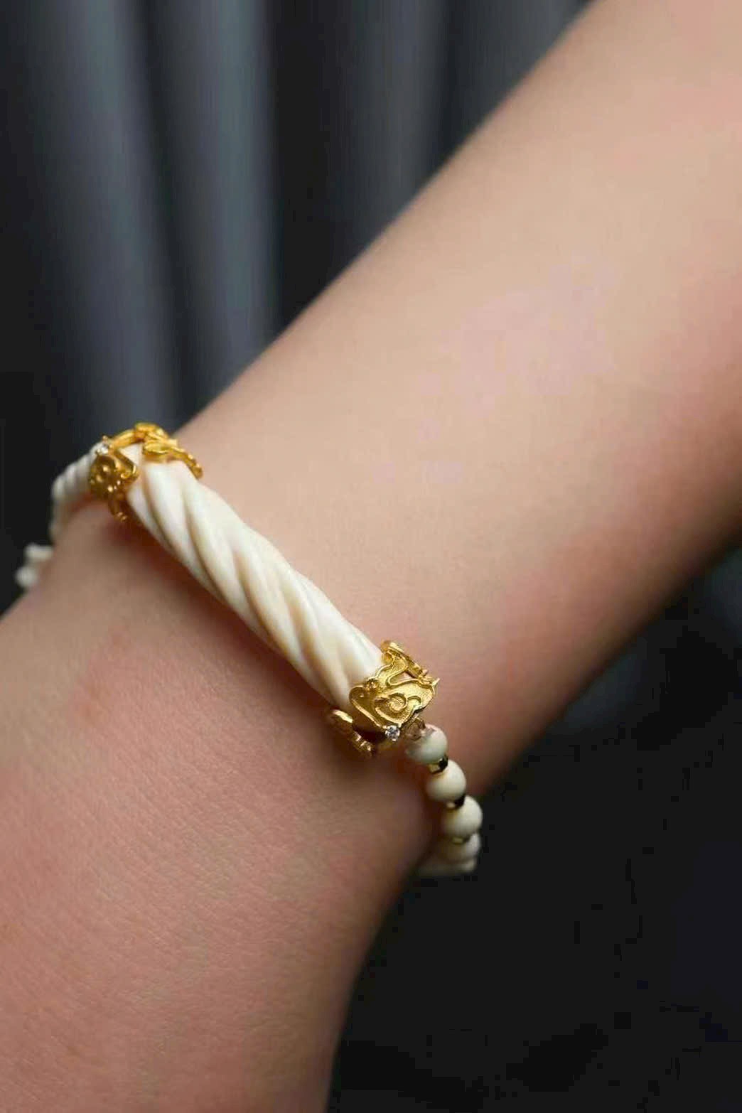 Thiết kế từ ngà voi mamut tết dây, kết hợp khóa bạc 925, mạ vàng cổ pháp, charm trường mệnh khóa, hạt Phúc, bình an