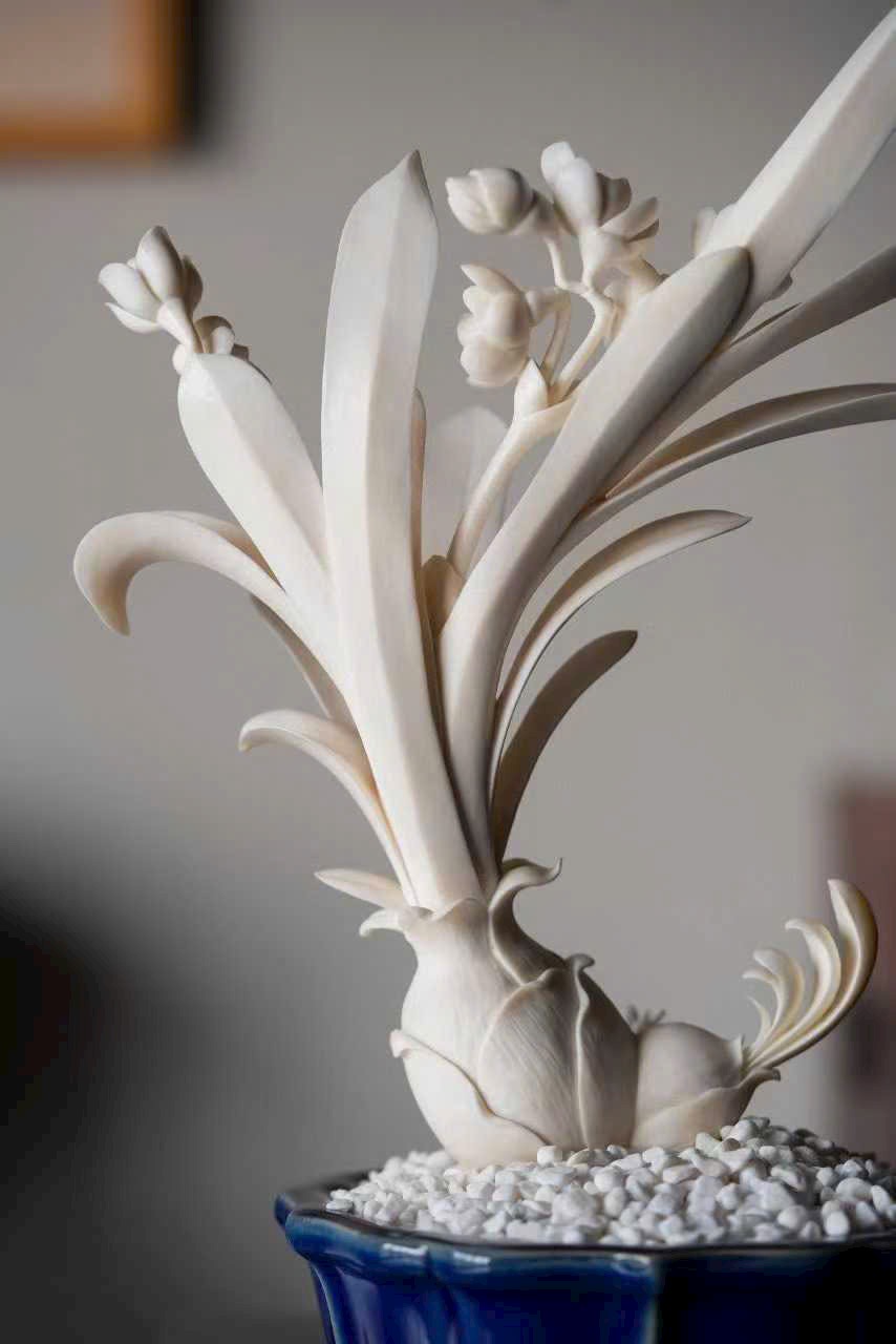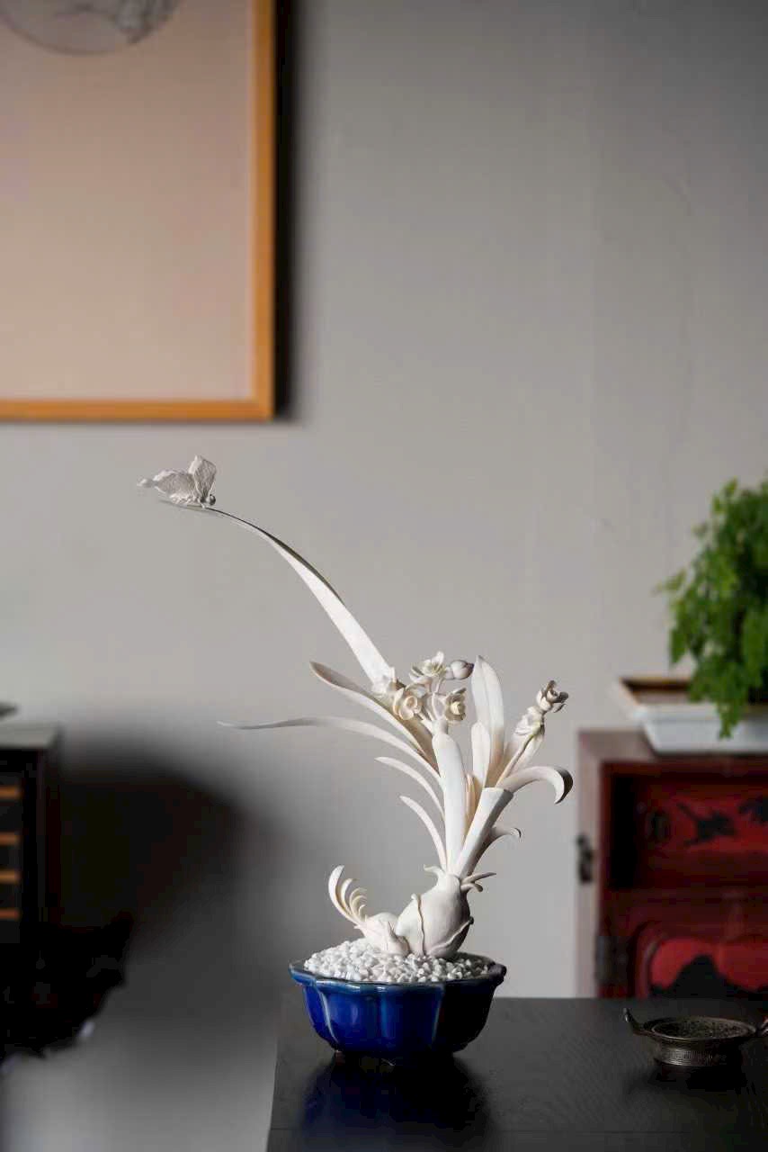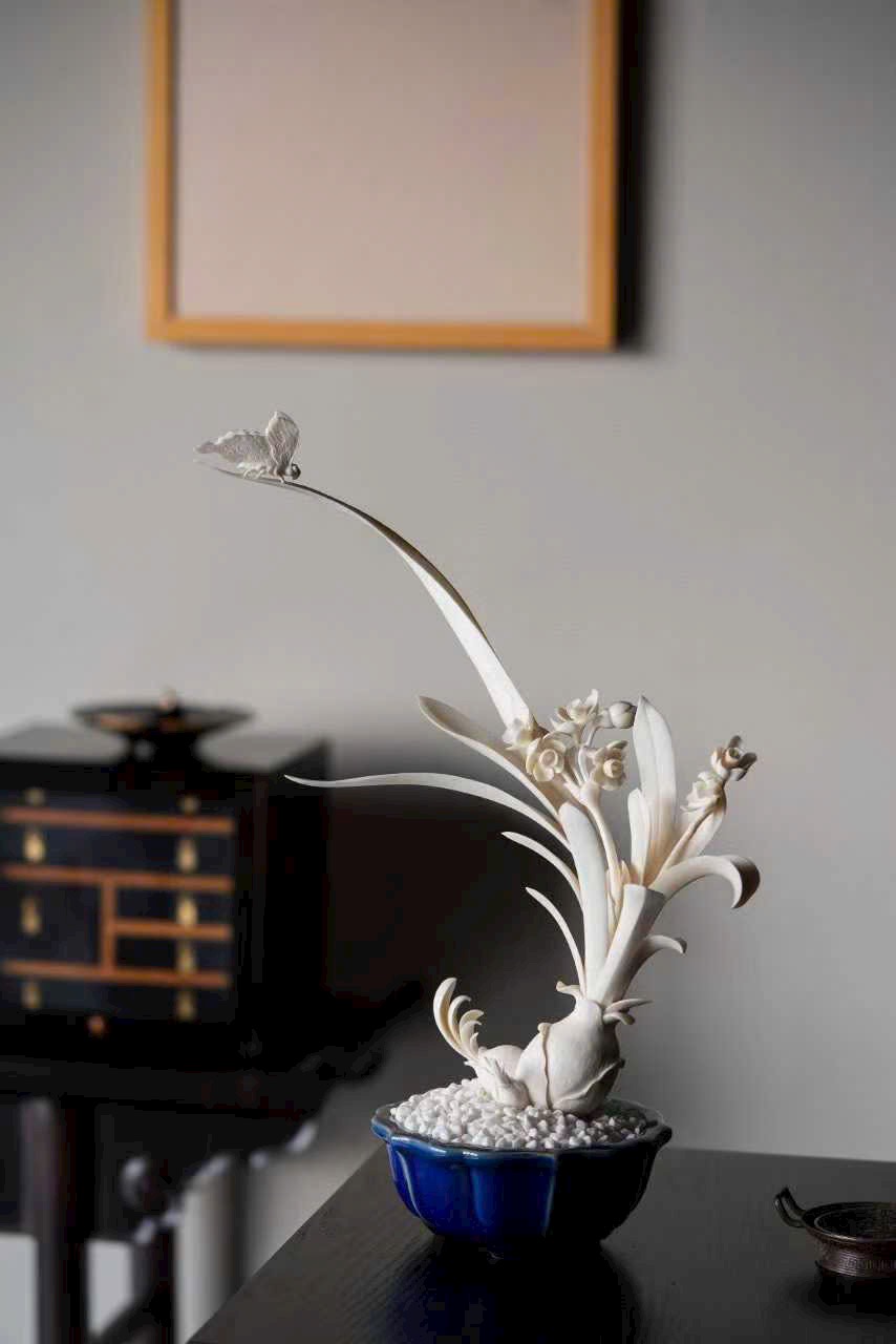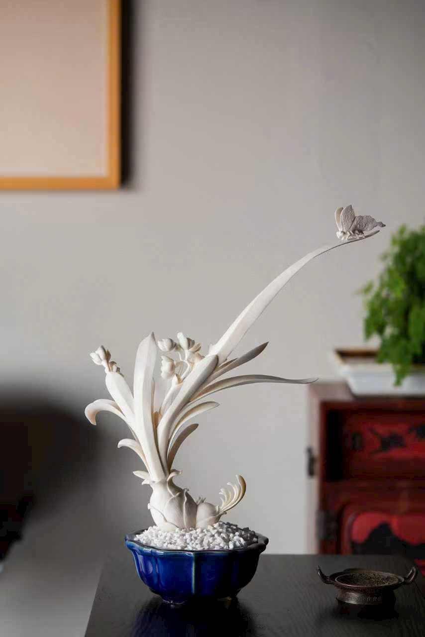Khéo léo chạm khắc hình thủy tiên nở hương thanh khiết, cánh bướm rung rinh đậu trên cánh ngọc, từng đường gân lá mảnh mai hiện rõ tinh tế. Bày trên án tựa như ôm trọn sắc xuân — bướm vờn hương ngát, ngắm nhìn tĩnh tại mà chan chứa thi vị thiền.
