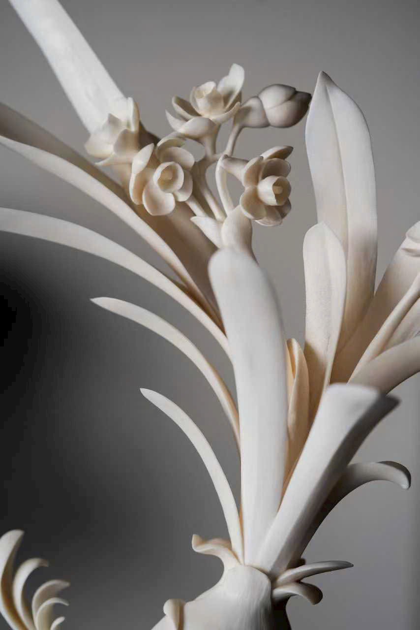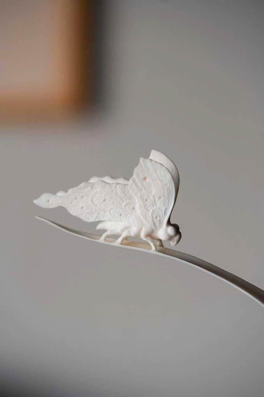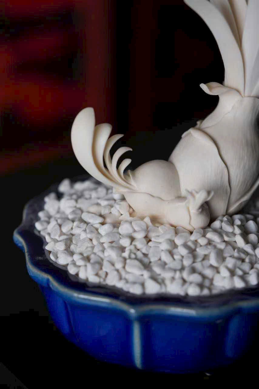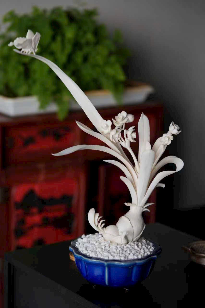 Khéo léo chạm khắc hình thủy tiên nở hương thanh khiết, cánh bướm rung rinh đậu trên cánh ngọc, từng đường gân lá mảnh mai hiện rõ tinh tế. Bày trên án tựa như ôm trọn sắc xuân — bướm vờn hương ngát, ngắm nhìn tĩnh tại mà chan chứa thi vị thiền.