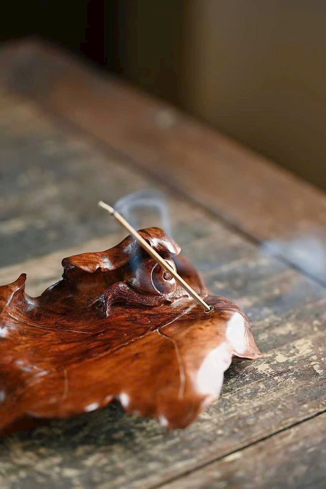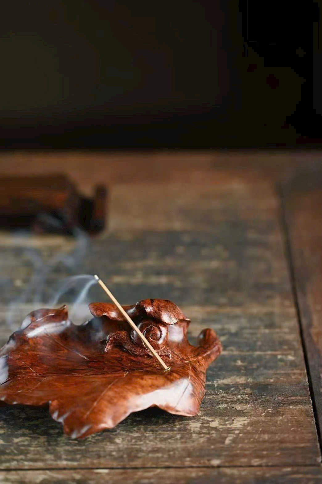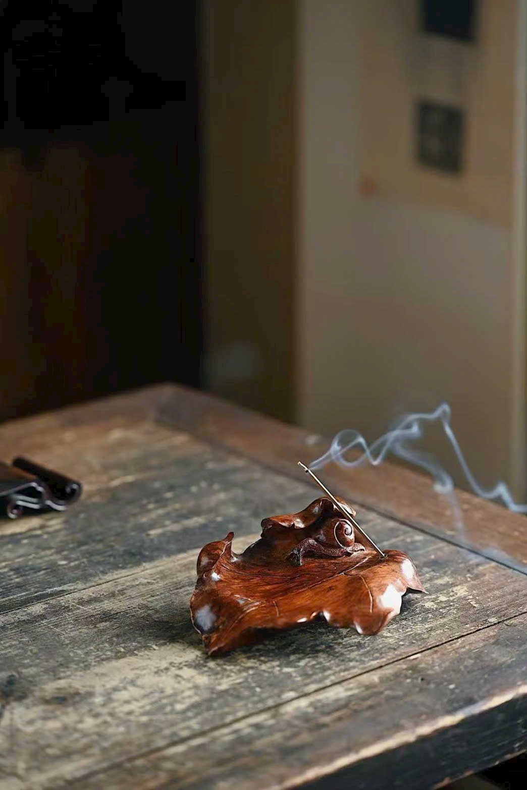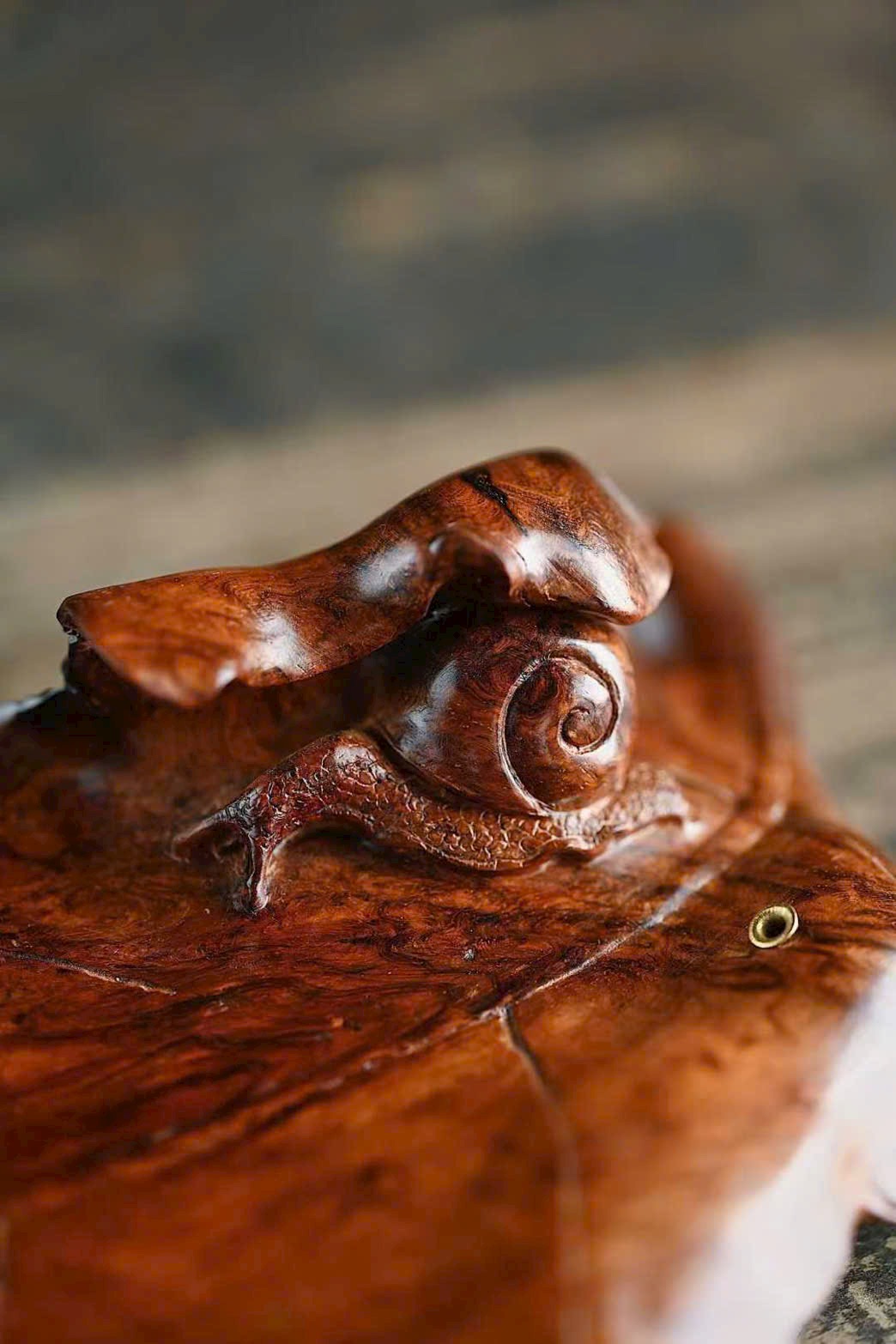 Tận dụng dáng gỗ tự nhiên, chạm khắc lá cây rõ gân, ốc sên ngộ nghĩnh sinh động. Trưng bày và đốt hương đều đầy thi vị.