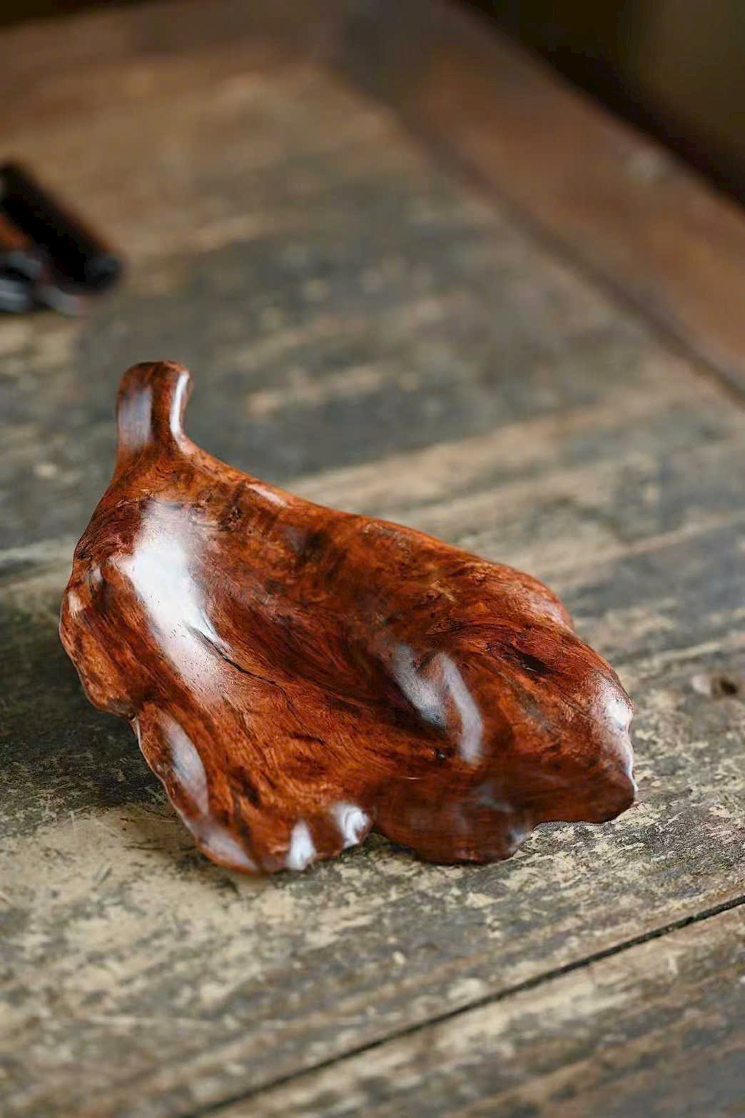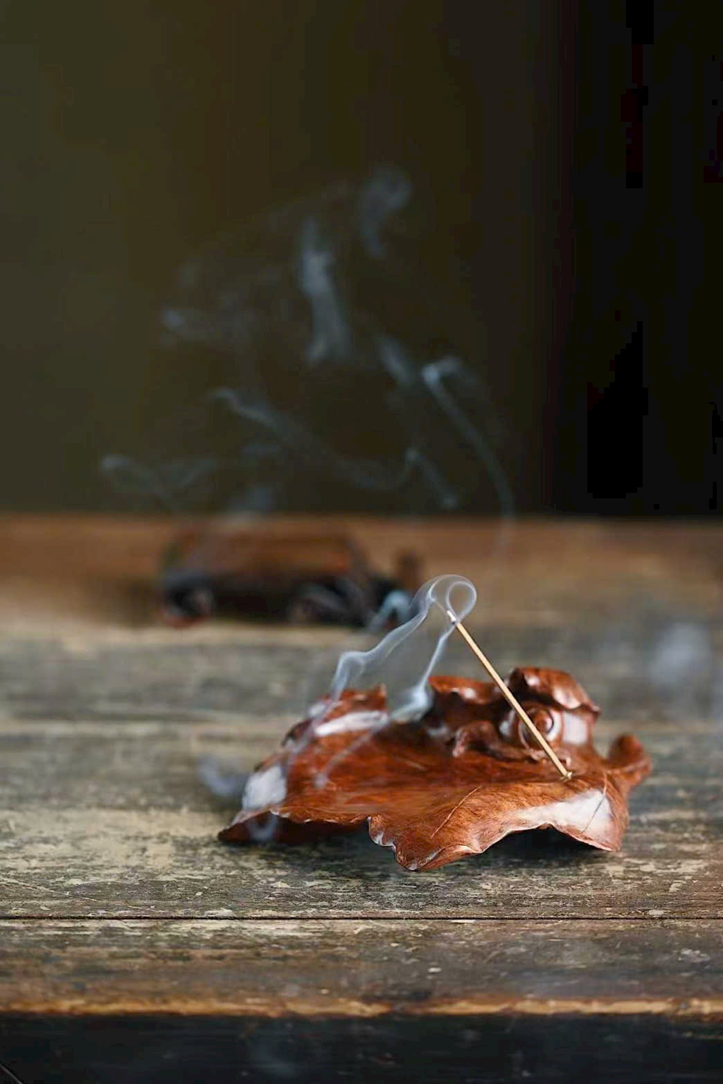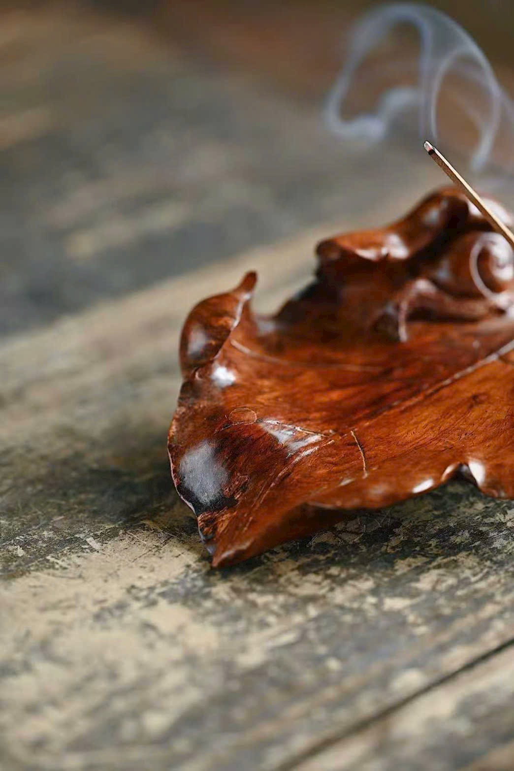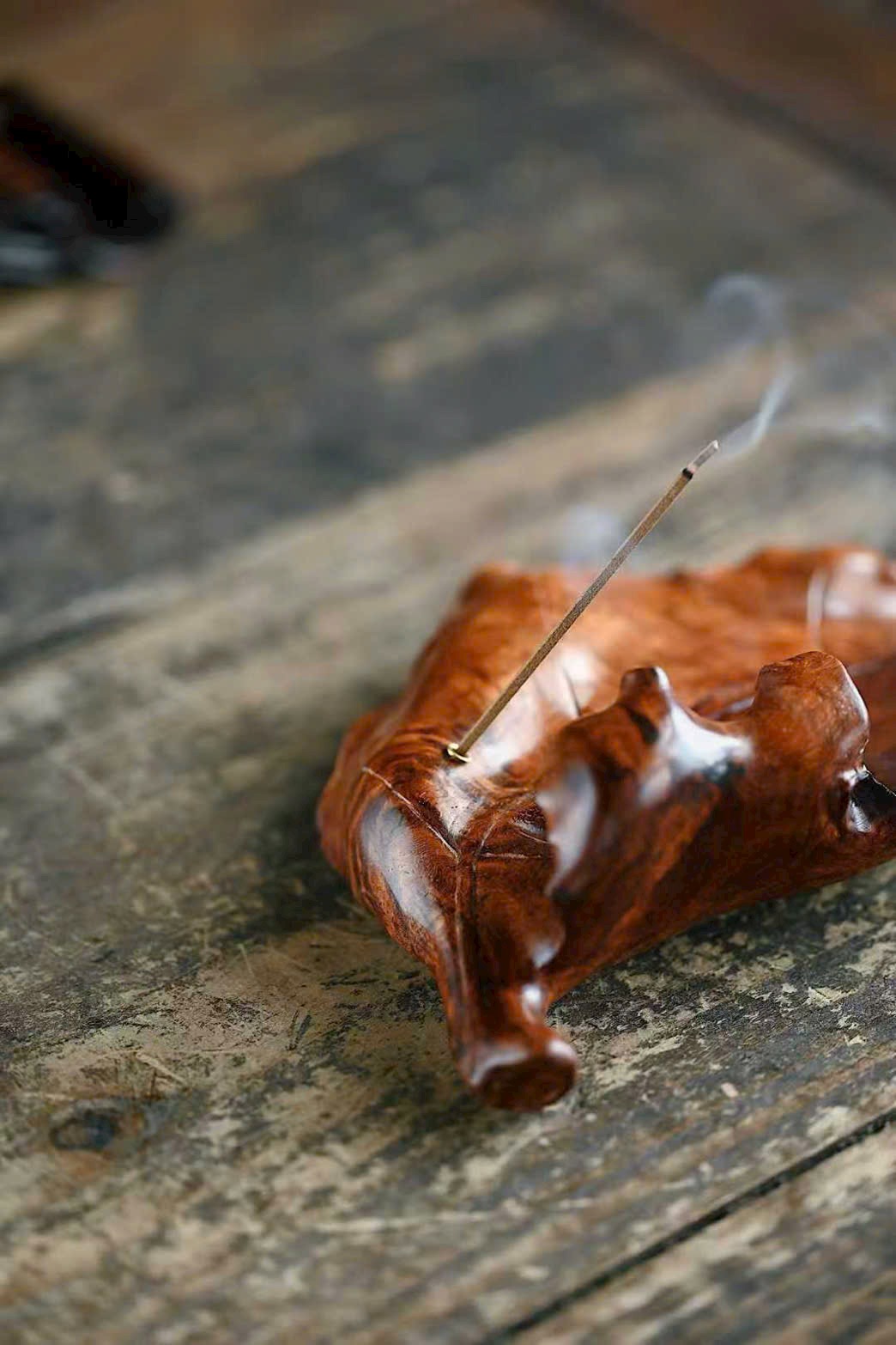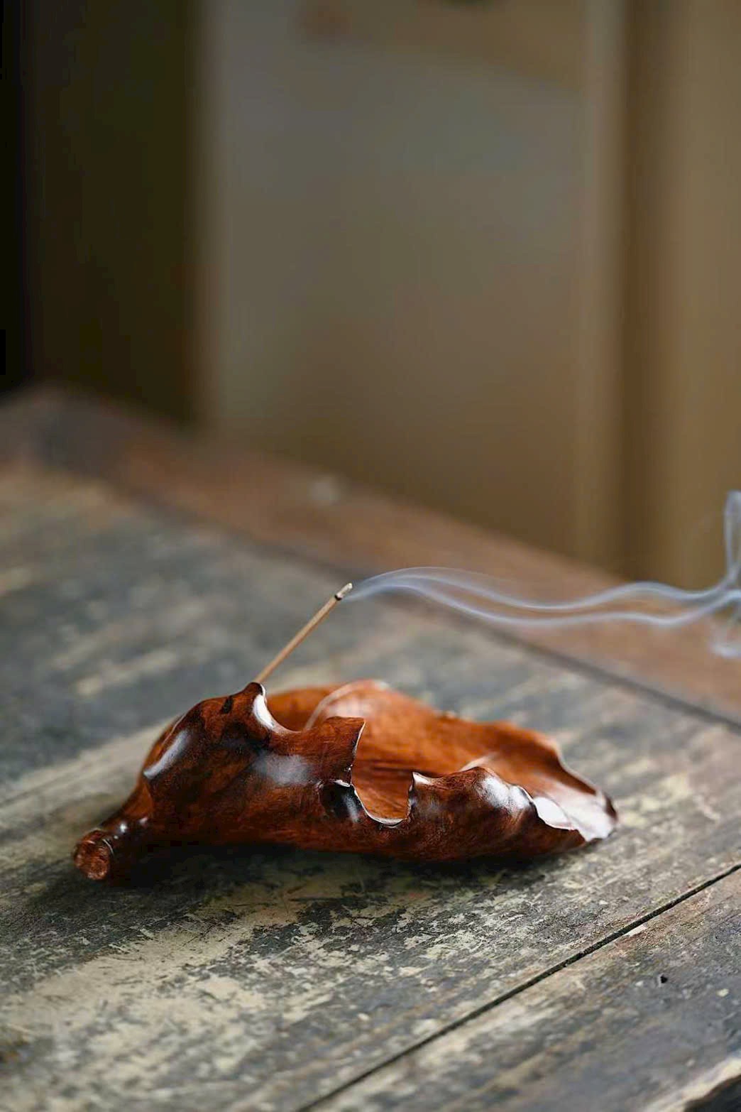 Tận dụng dáng gỗ tự nhiên, chạm khắc lá cây rõ gân, ốc sên ngộ nghĩnh sinh động. Trưng bày và đốt hương đều đầy thi vị.