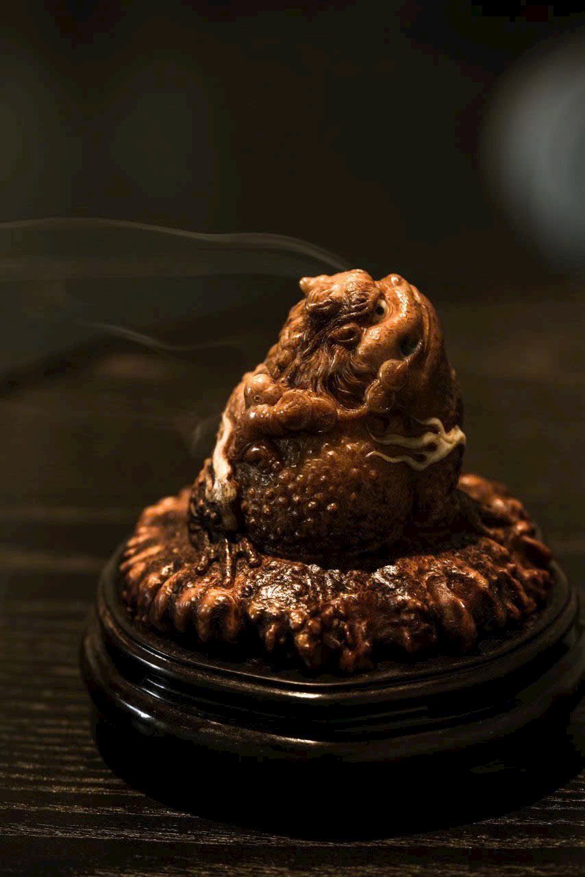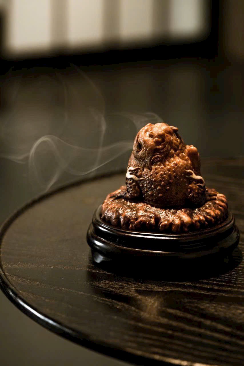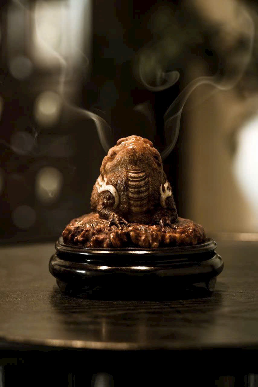 Xông Trầm Kim Thiềm – hoàn toàn thủ công chế tác, dáng vẻ hiền hậu vui tươi, hình thái cổ kỳ, miệng rộng bụng đầy. Khói hương phiêu đãng, mang đậm ý thú văn nhân, thiên nhiên tự tại, hàm chứa ý nghĩa cát tường mỹ mãn.