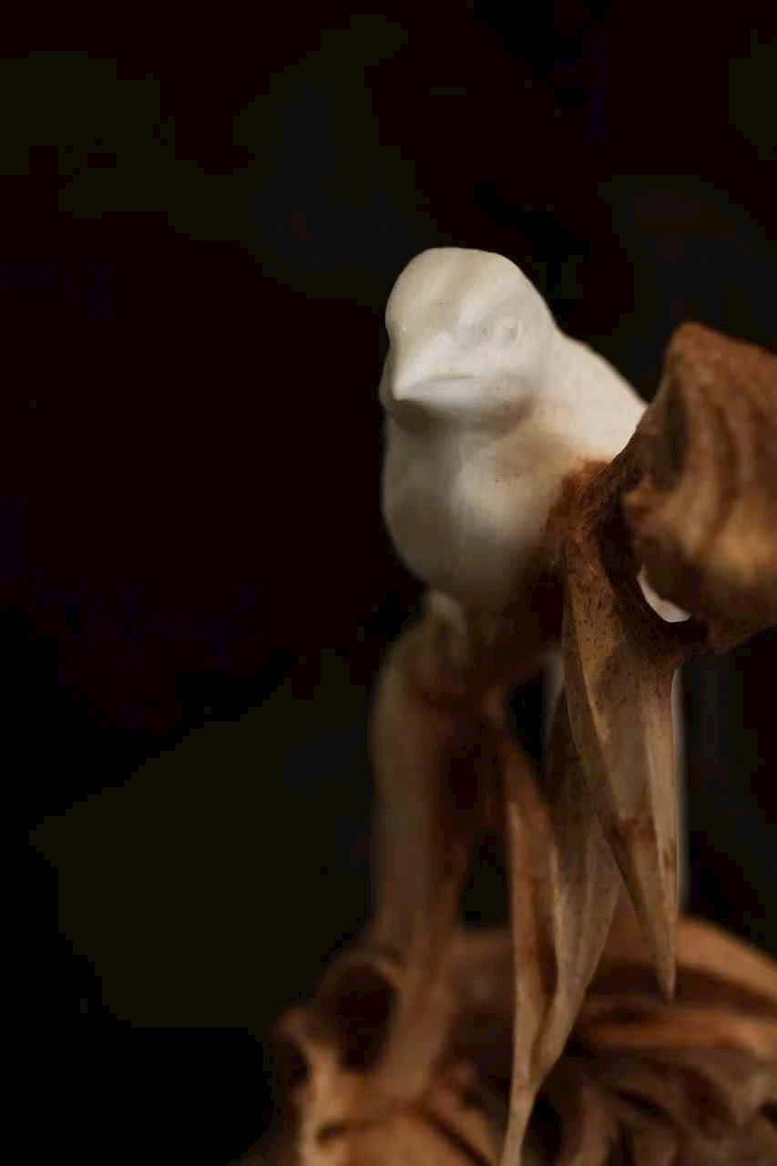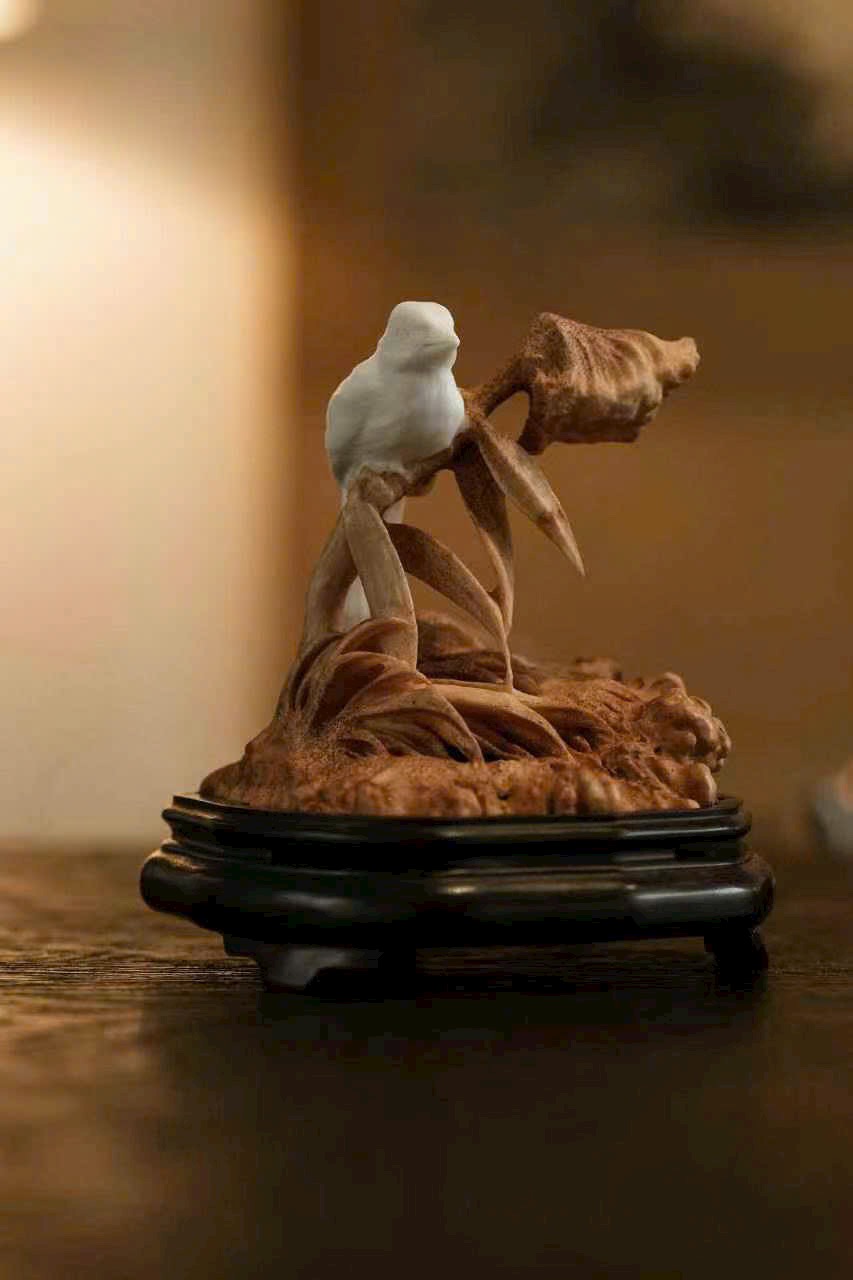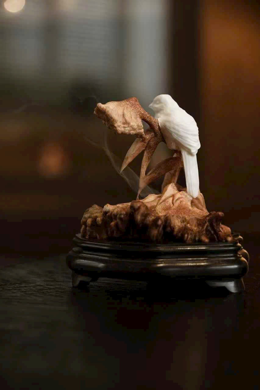 - Chim đơn độc đậu trên ngọn trúc gãy, cánh khẽ vung như nét bút khô, khói trầm gặp cành trúc tản ra như nét bay trong “Khoái Tuyết Thiếp”, gợi hình ảnh Bát Đại Sơn Nhân thiêu tranh tế trời nơi am hương.