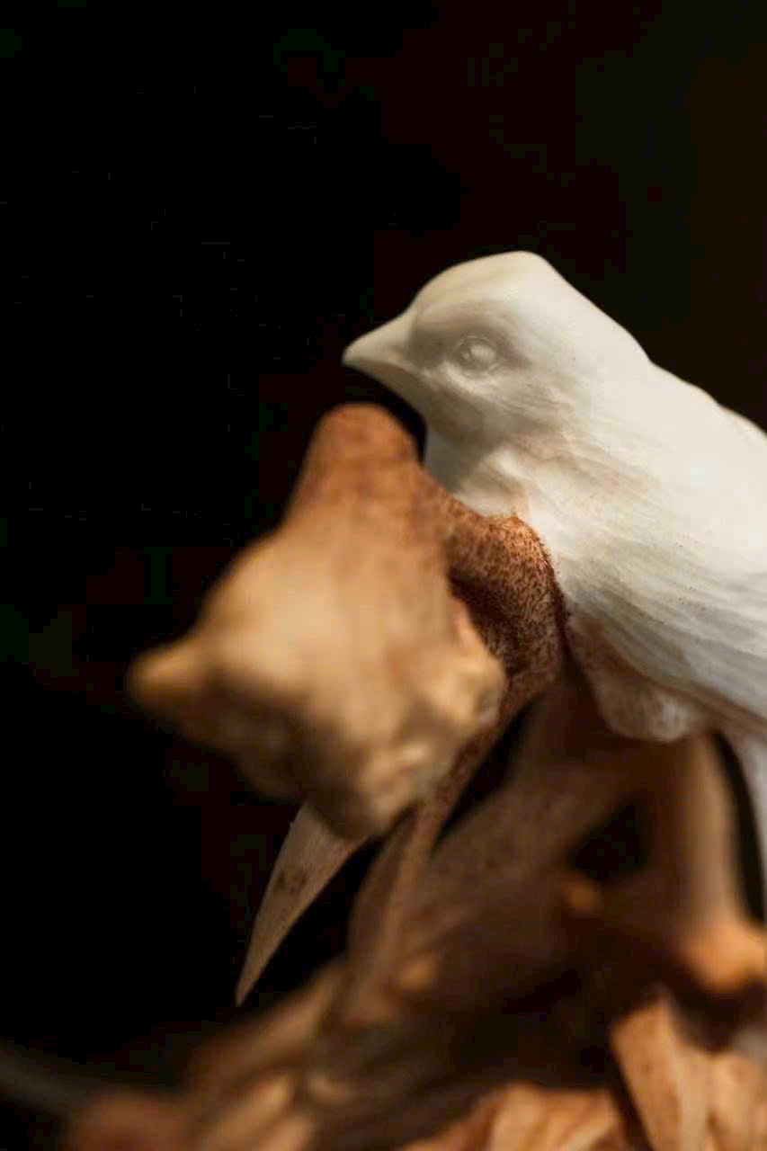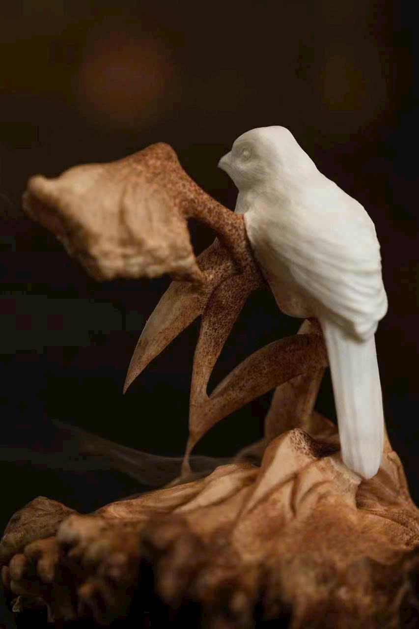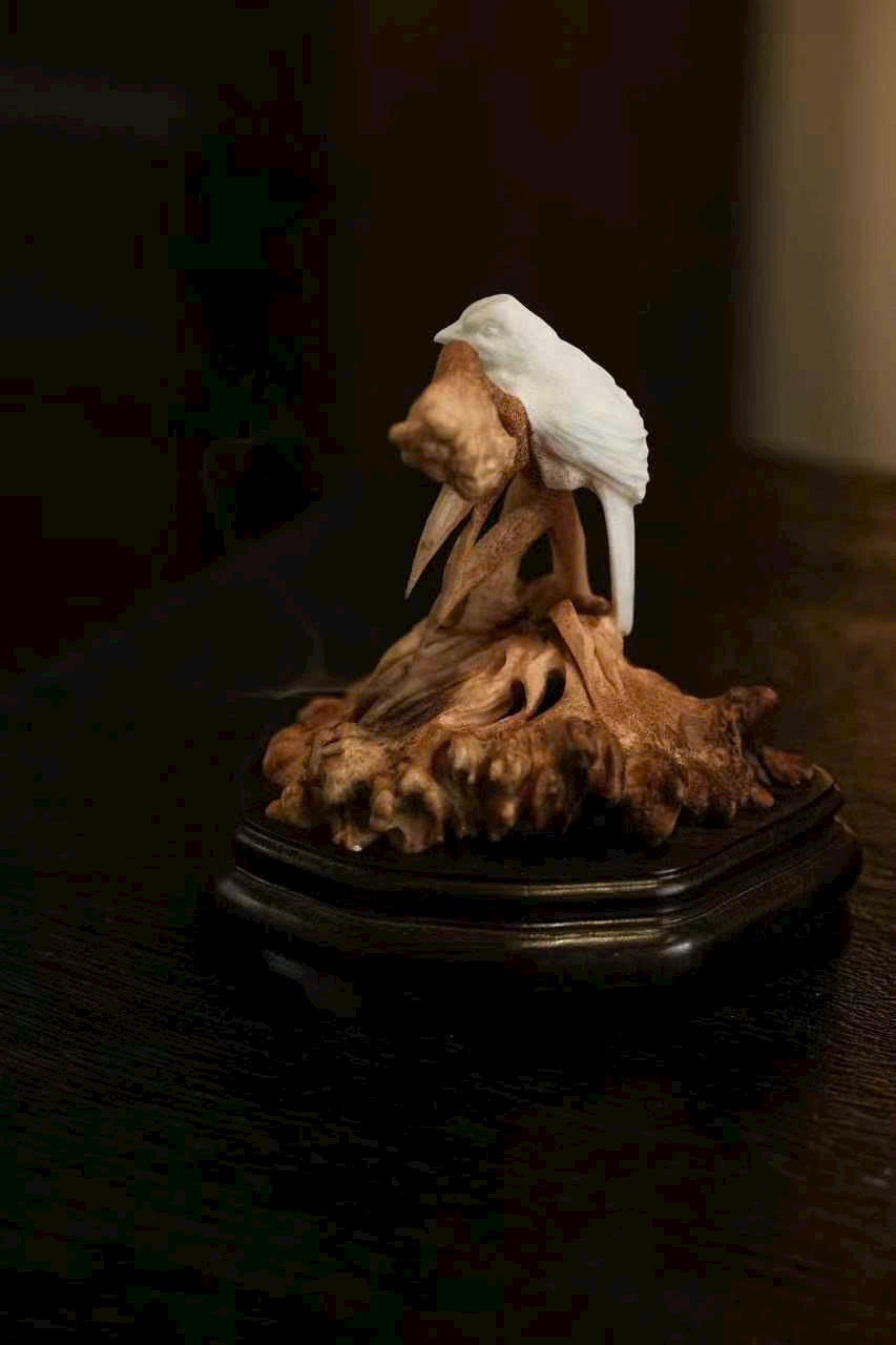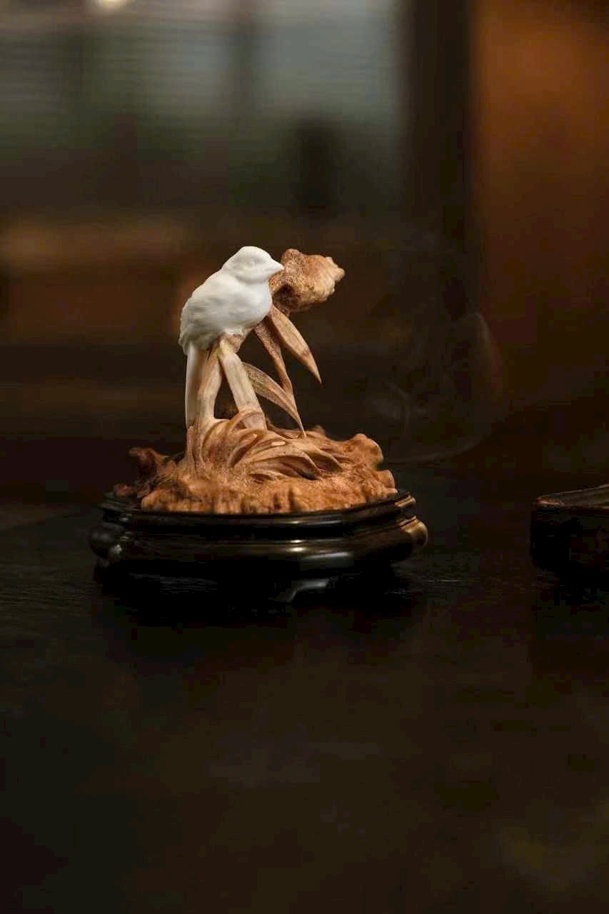 - Chim đơn độc đậu trên ngọn trúc gãy, cánh khẽ vung như nét bút khô, khói trầm gặp cành trúc tản ra như nét bay trong “Khoái Tuyết Thiếp”, gợi hình ảnh Bát Đại Sơn Nhân thiêu tranh tế trời nơi am hương.
